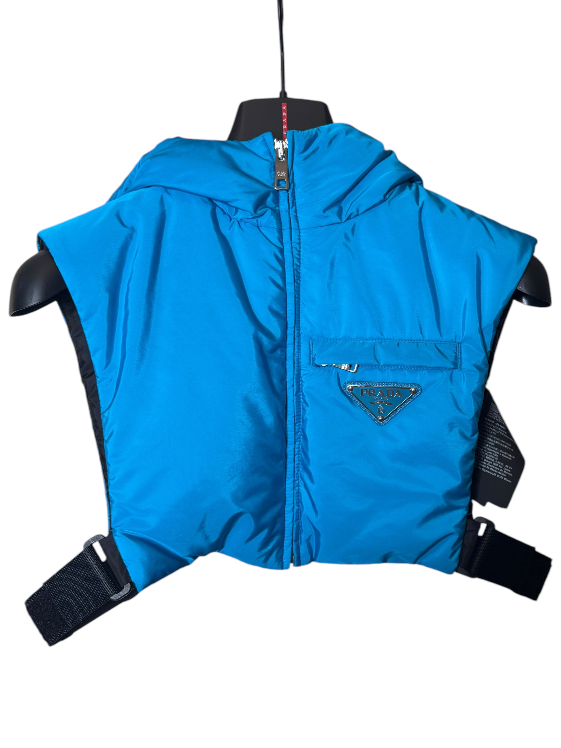 Gilet tecnico firmato Prada, realizzato in Italia in nylon blu turchese lucido con cappuccio integrato. Chiusura con zip frontale, taschino con zip e patta, iconico logo triangolare in metallo sul petto. Cinturini regolabili con velcro in vita per una vestibilità sicura. Un capo di design moderno e funzionale, ideale per l’uso urbano o sportivo.