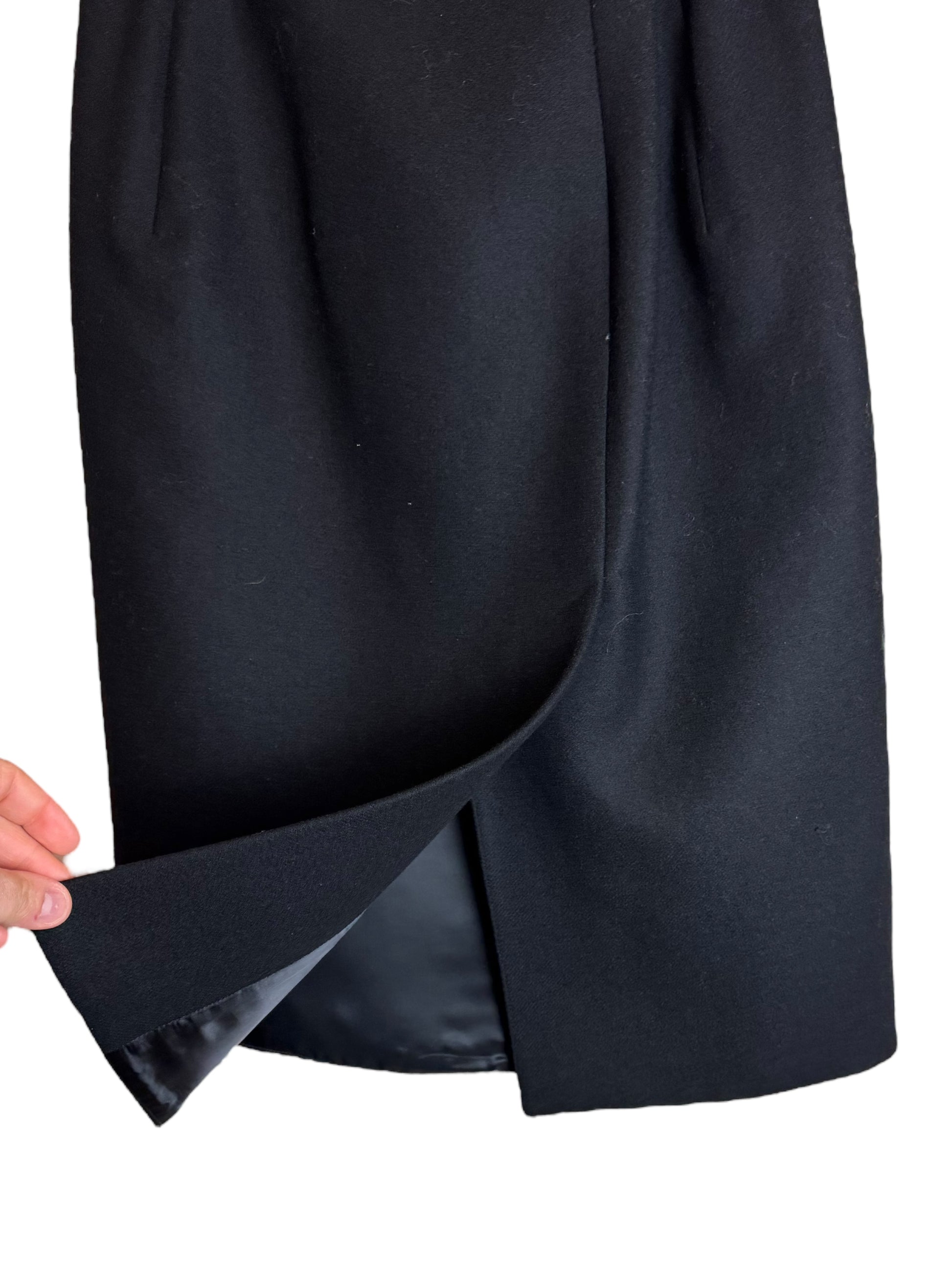 Elegante gonna Prada realizzata in pura lana vergine, caratterizzata da una silhouette strutturata e dettagli sofisticati. Il design è impreziosito da sei bottoni logati Prada che donano un tocco distintivo e raffinato. La fodera interna in viscosa assicura massimo comfort e vestibilità impeccabile.