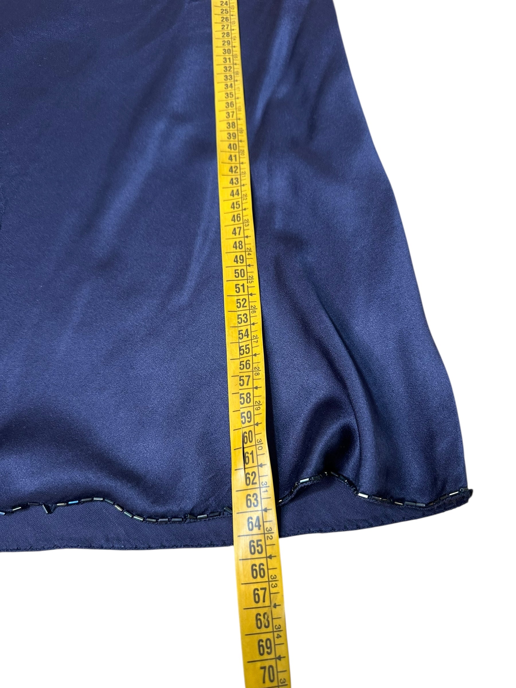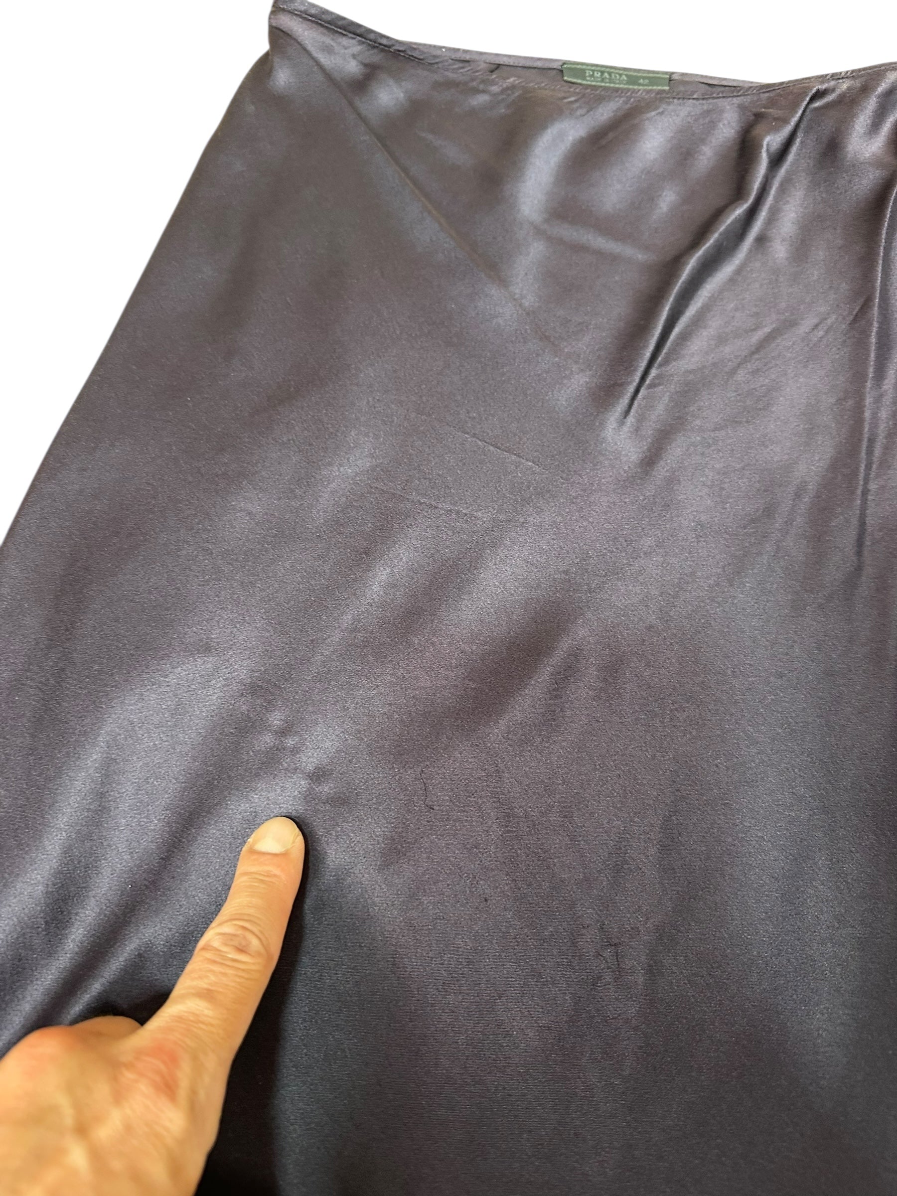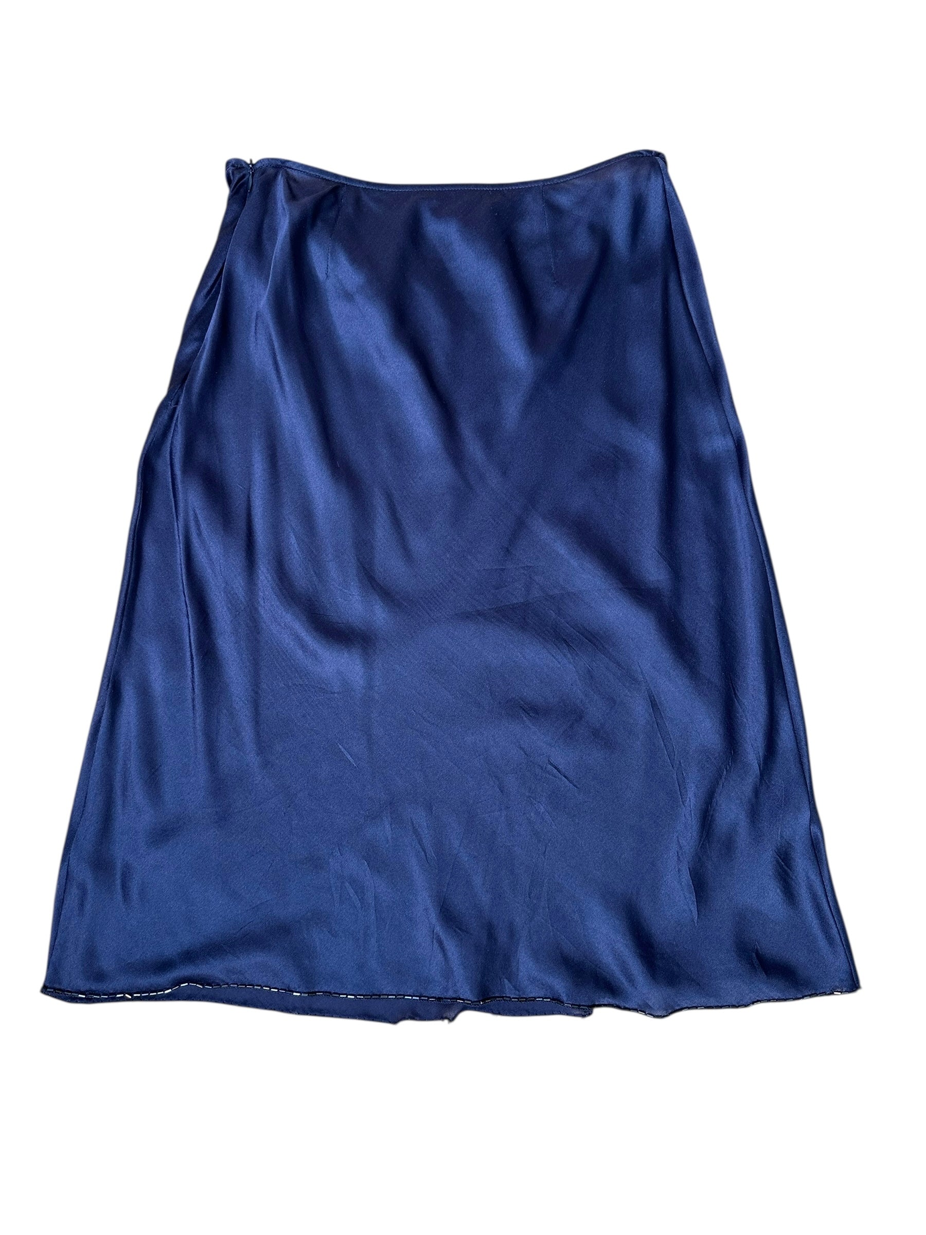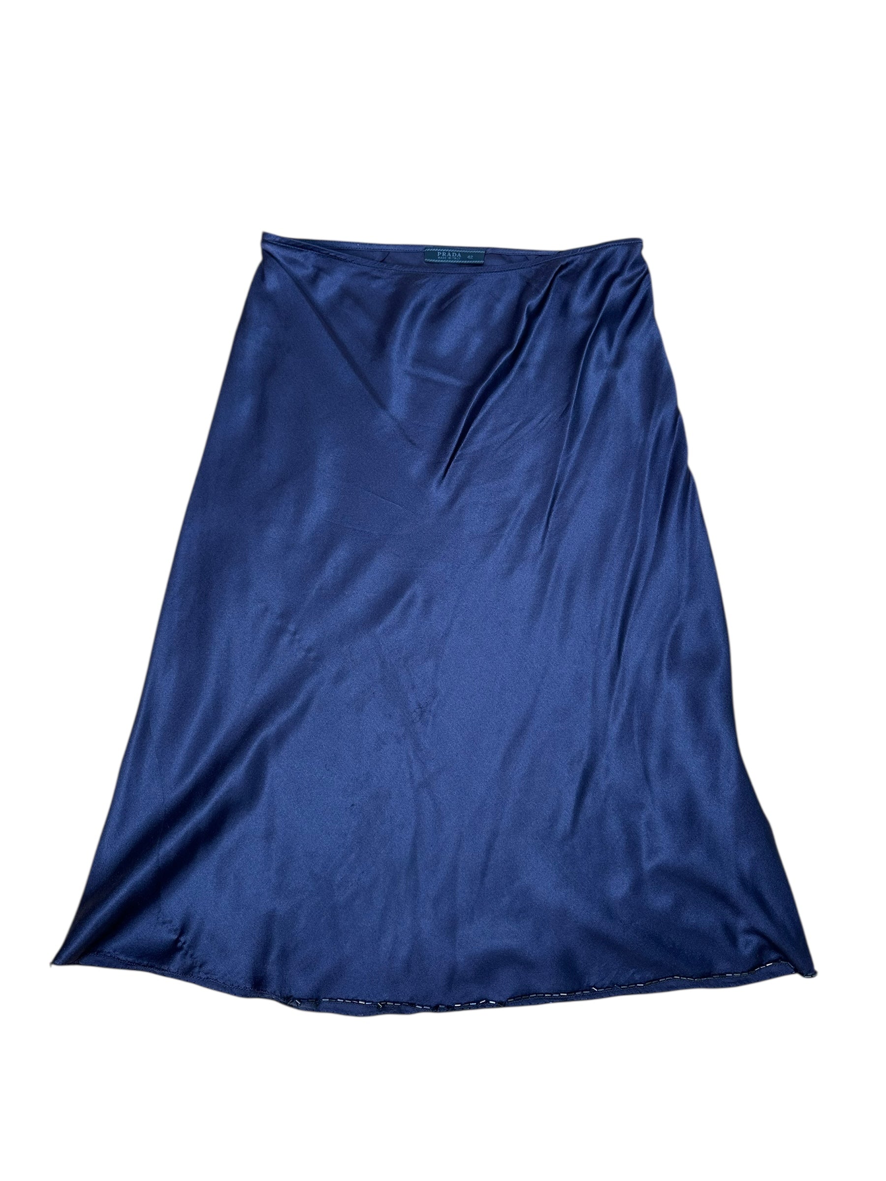 Gonna vintage firmata Prada, realizzata in pregiata seta lucida nel raffinato tono del blu navy. Linea scivolata a taglio sbieco con orlo rifinito da micro perline nere applicate a mano. Alcune perline risultano mancanti in corrispondenza del profilo laterale all’altezza del ginocchio e in minima parte anche sul retro, come documentato in foto. Etichetta interna con taglia IT 42.