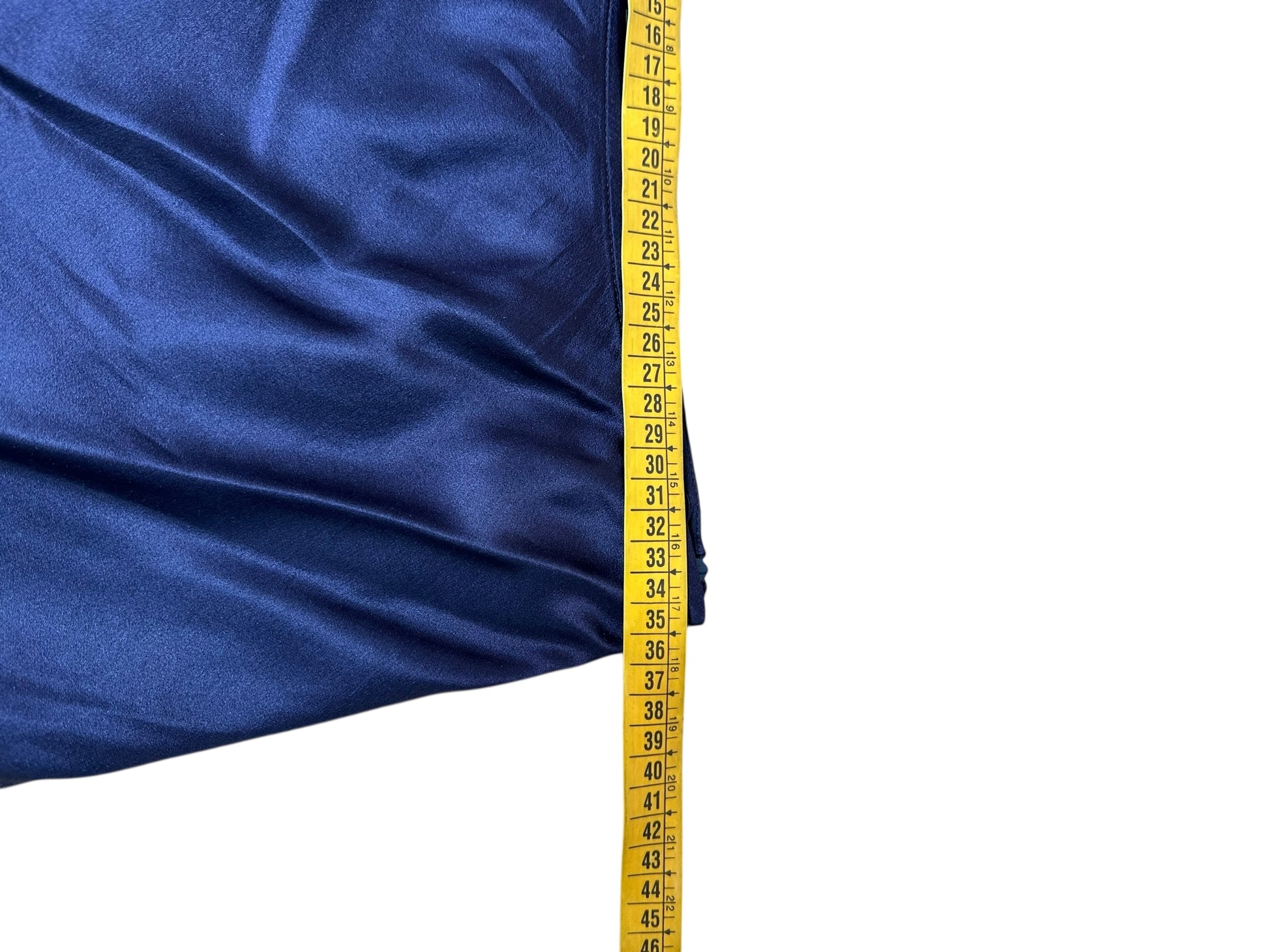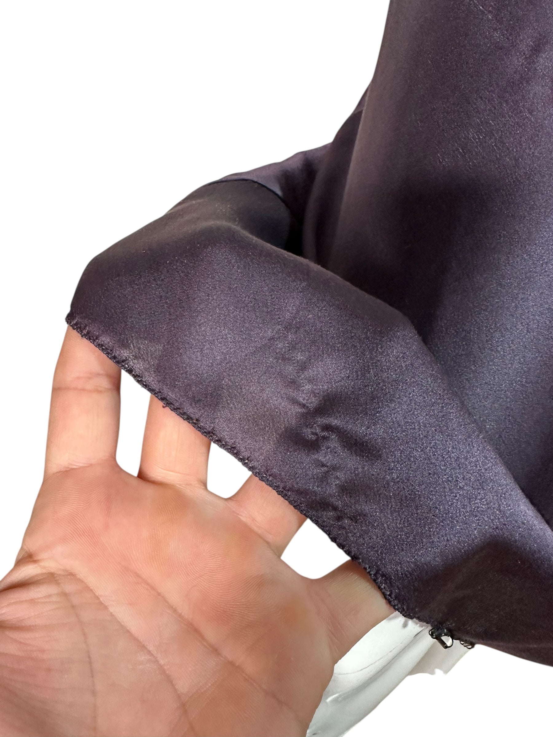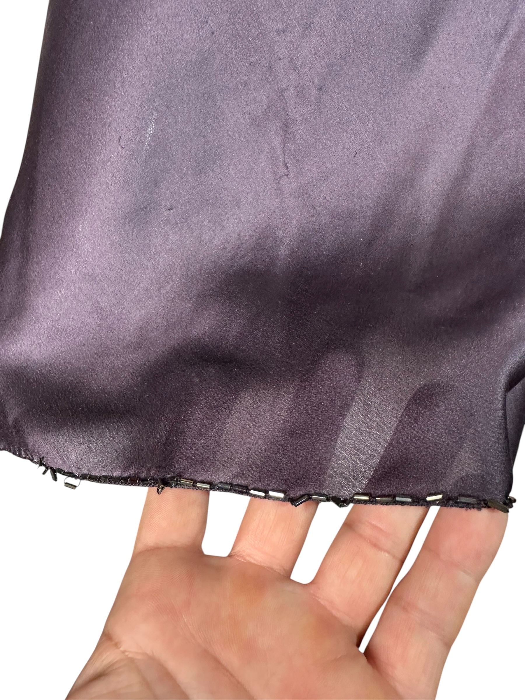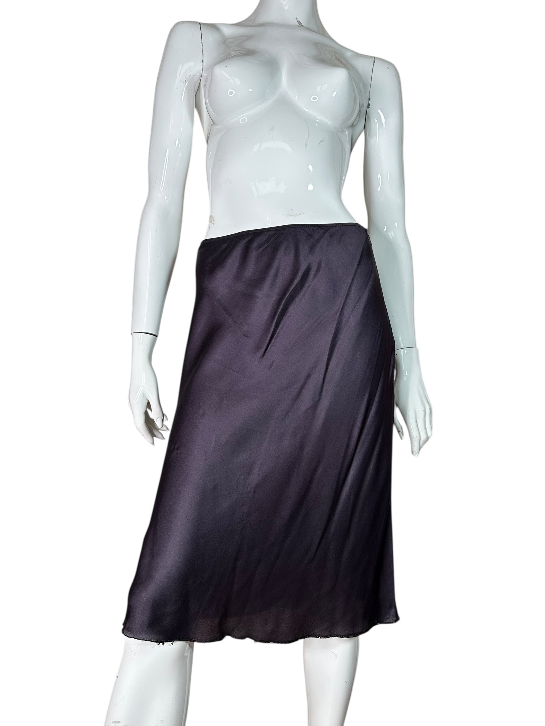 Gonna vintage firmata Prada, realizzata in pregiata seta lucida nel raffinato tono del blu navy. Linea scivolata a taglio sbieco con orlo rifinito da micro perline nere applicate a mano. Alcune perline risultano mancanti in corrispondenza del profilo laterale all’altezza del ginocchio e in minima parte anche sul retro, come documentato in foto. Etichetta interna con taglia IT 42.