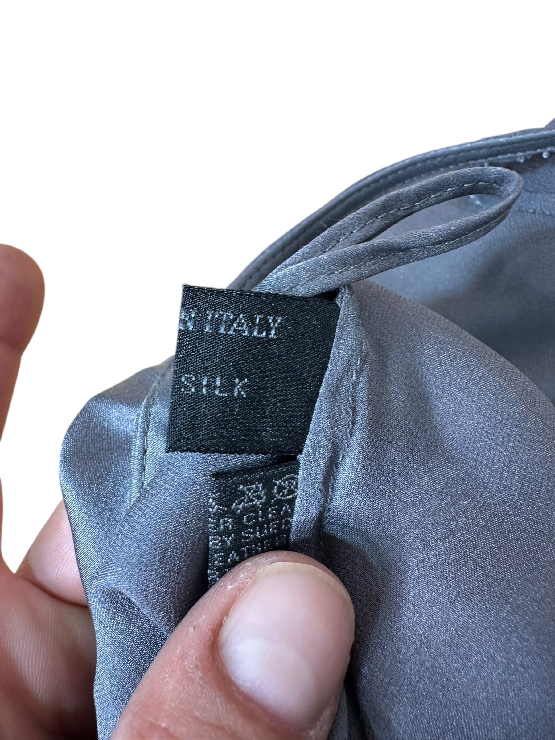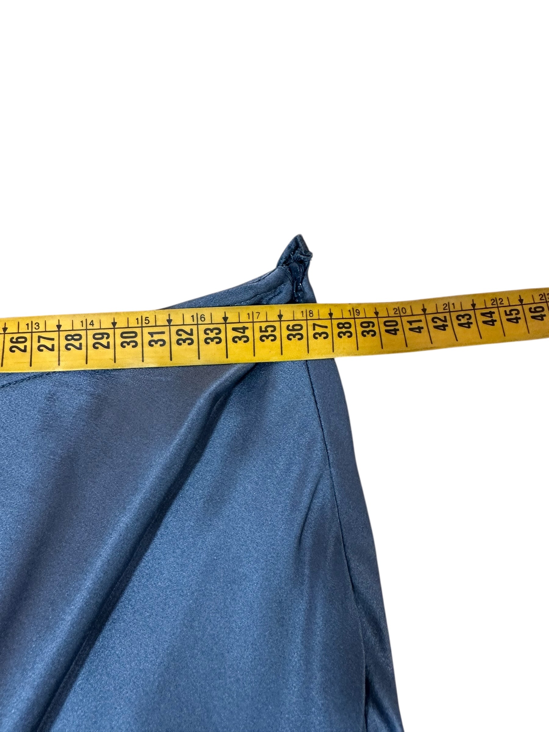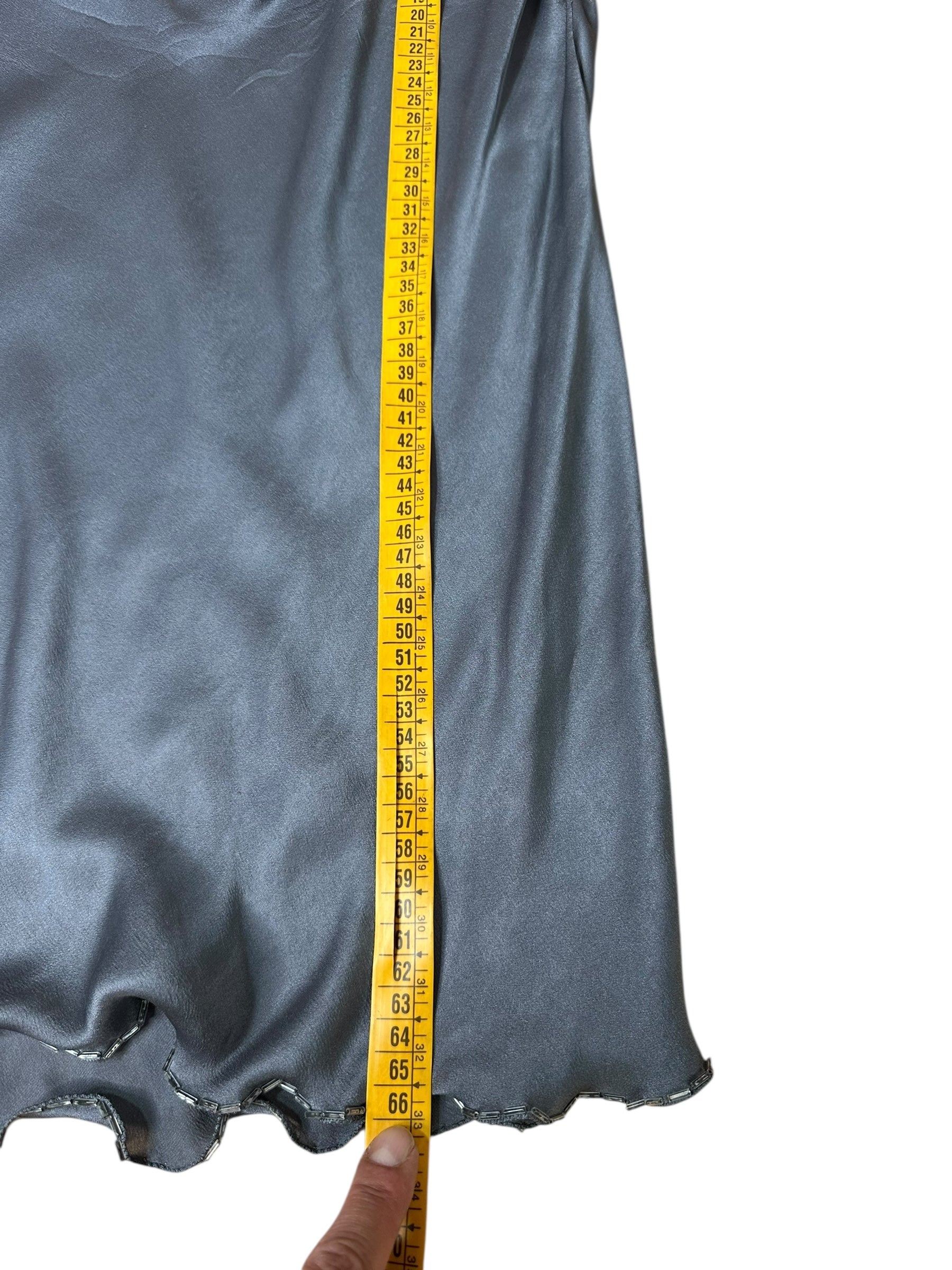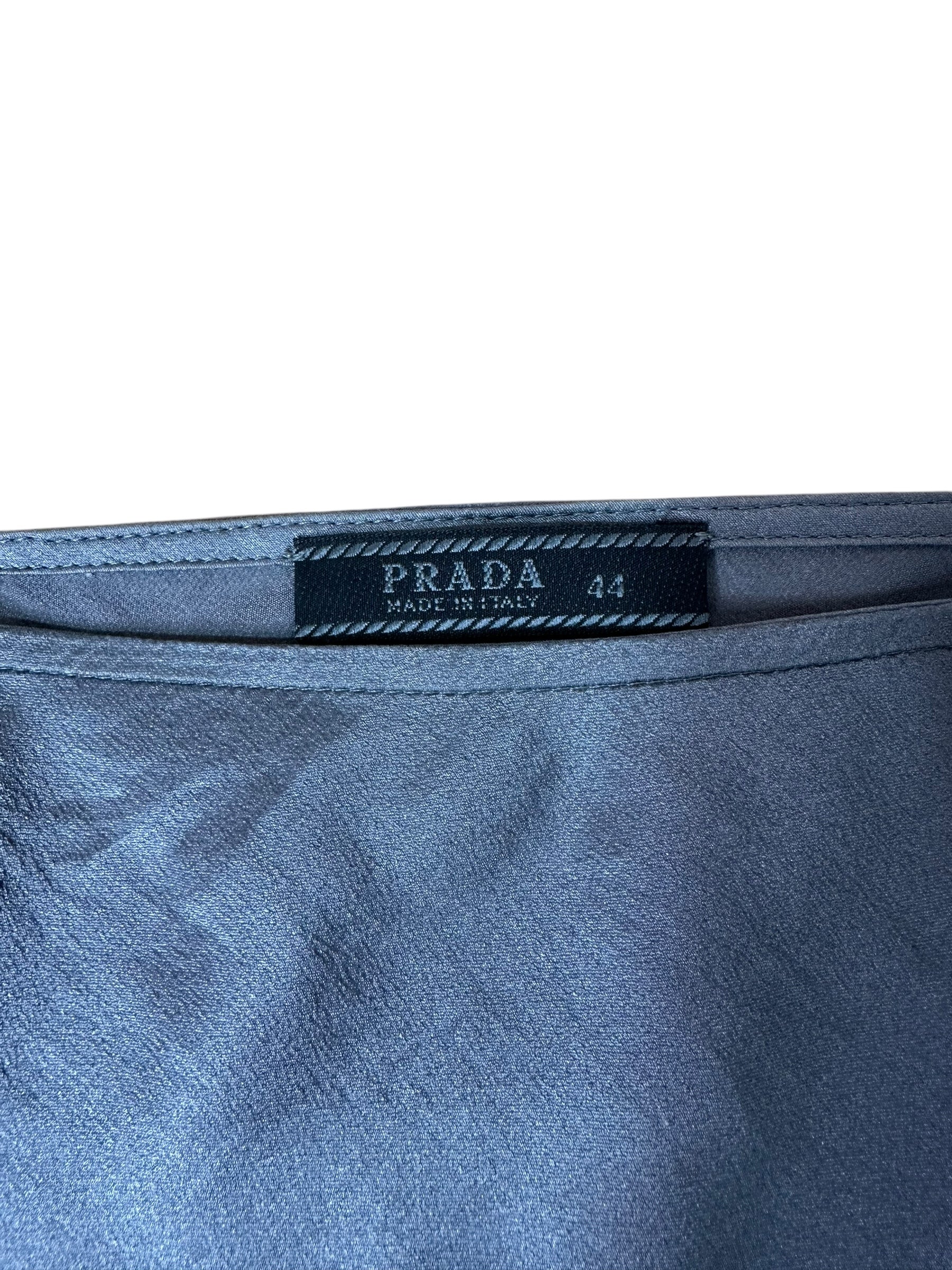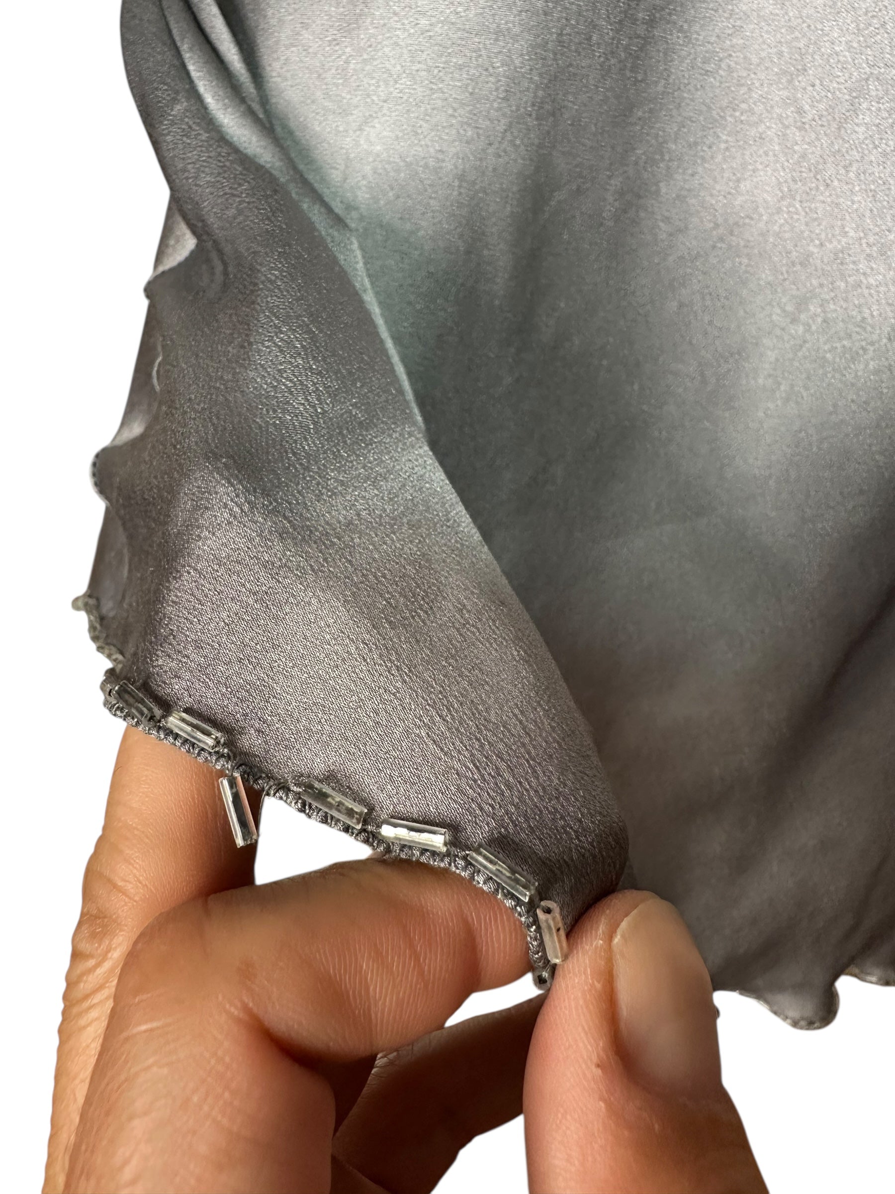 Elegante e raffinata, questa gonna vintage firmata Prada è realizzata in pura seta color grigio perlato, con un taglio midi svasato che accarezza delicatamente la silhouette. L’orlo è impreziosito da una raffinata decorazione di perline trasparenti cucite a mano lungo tutto il profilo all’altezza del ginocchio, che dona un movimento discreto e luminoso al capo.