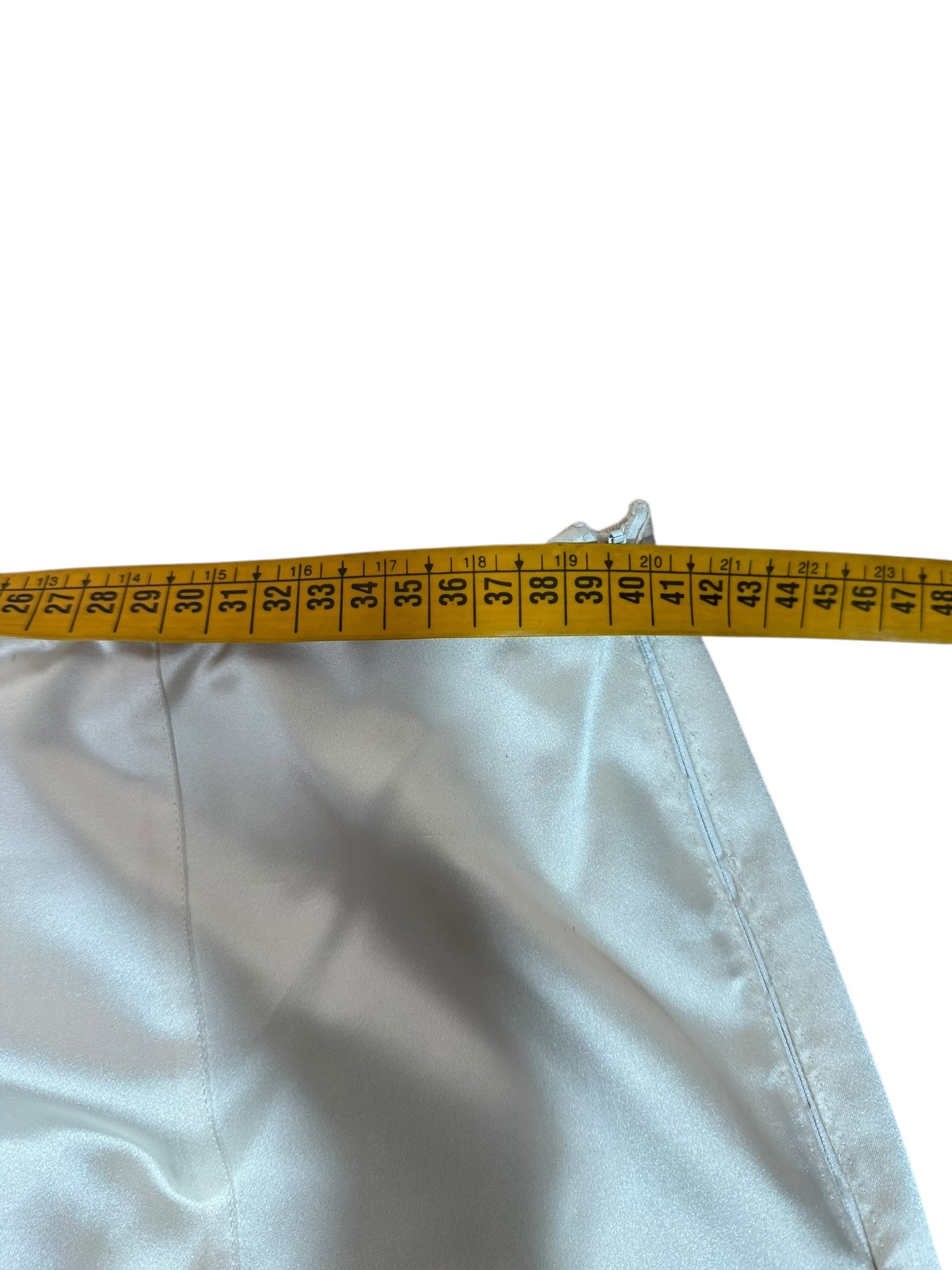 Elegante e sofisticata, questa gonna vintage firmata Prada è realizzata in raso di pura seta (100%) con fodera interna in rayon. Il taglio essenziale e leggermente svasato è valorizzato da una banda rossa in satin lucido a fondo gonna, rifinita da un profilo bianco a contrasto che ne accentua lo stile grafico e ricercato.