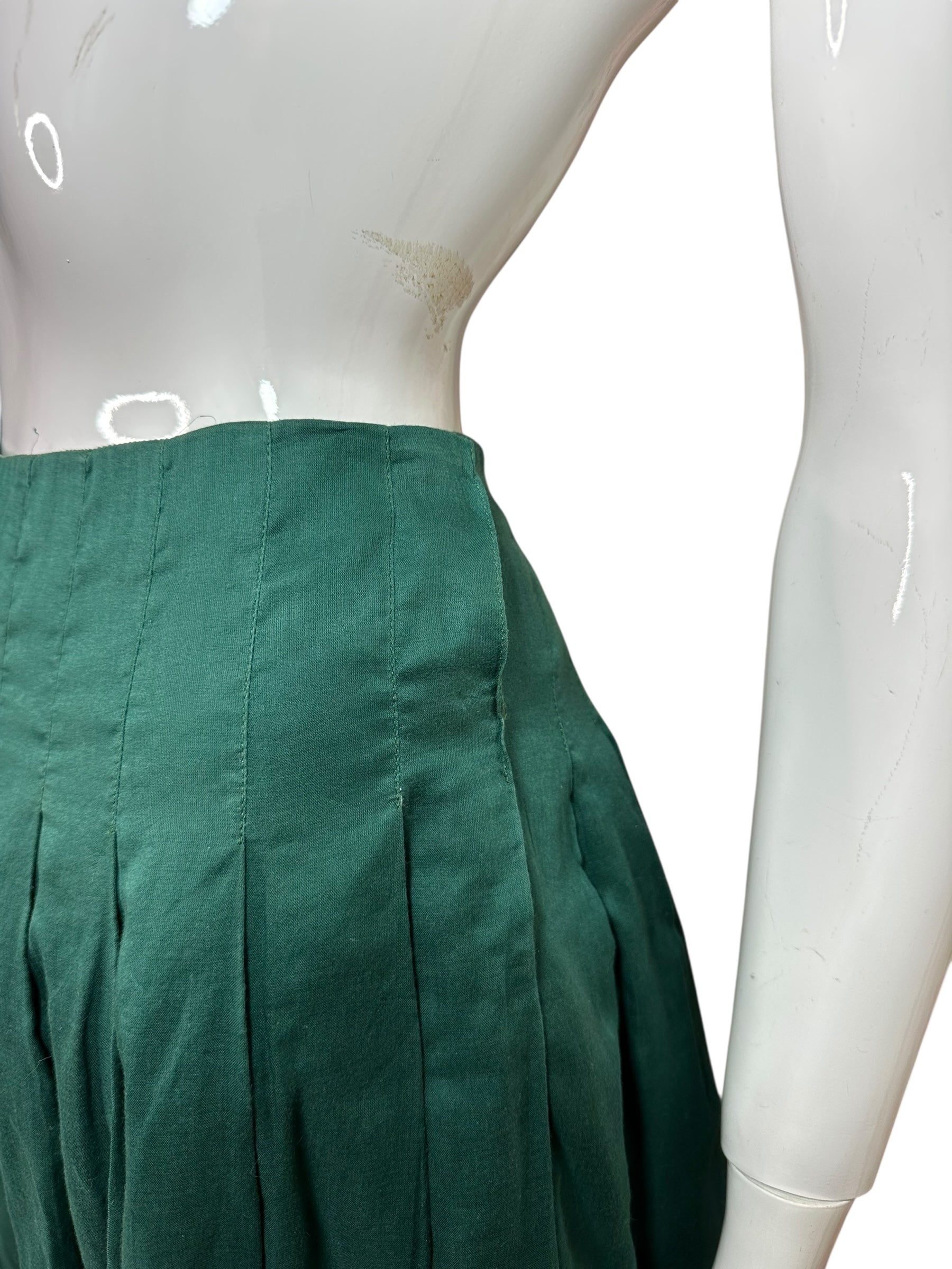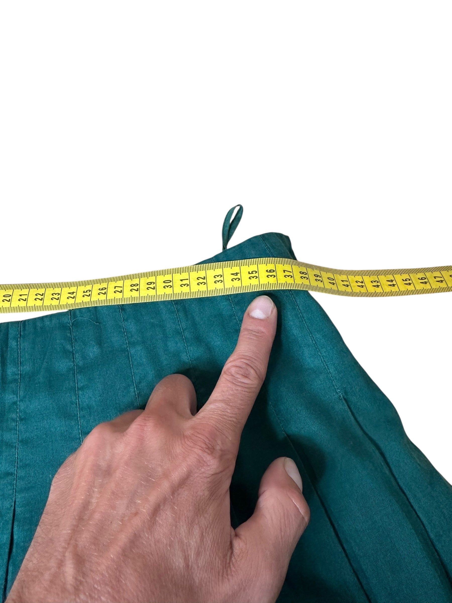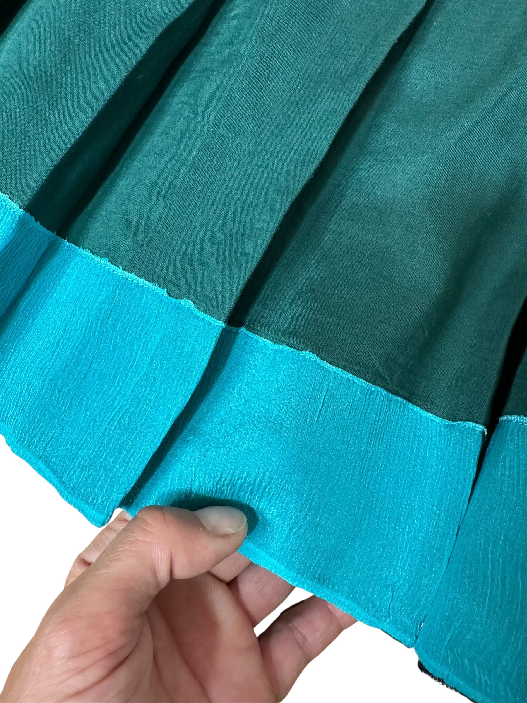 Elegante e strutturata, questa gonna vintage Prada Made in Italy si distingue per il suo design raffinato e la costruzione sartoriale. Realizzata in 100% cotone con profilo finale in 100% seta, presenta una silhouette a ruota con pieghe ampie e definite che donano volume e movimento. Il fondo è impreziosito da una fascia turchese a contrasto con il corpo verde petrolio della gonna, creando un effetto visivo deciso ma armonico.