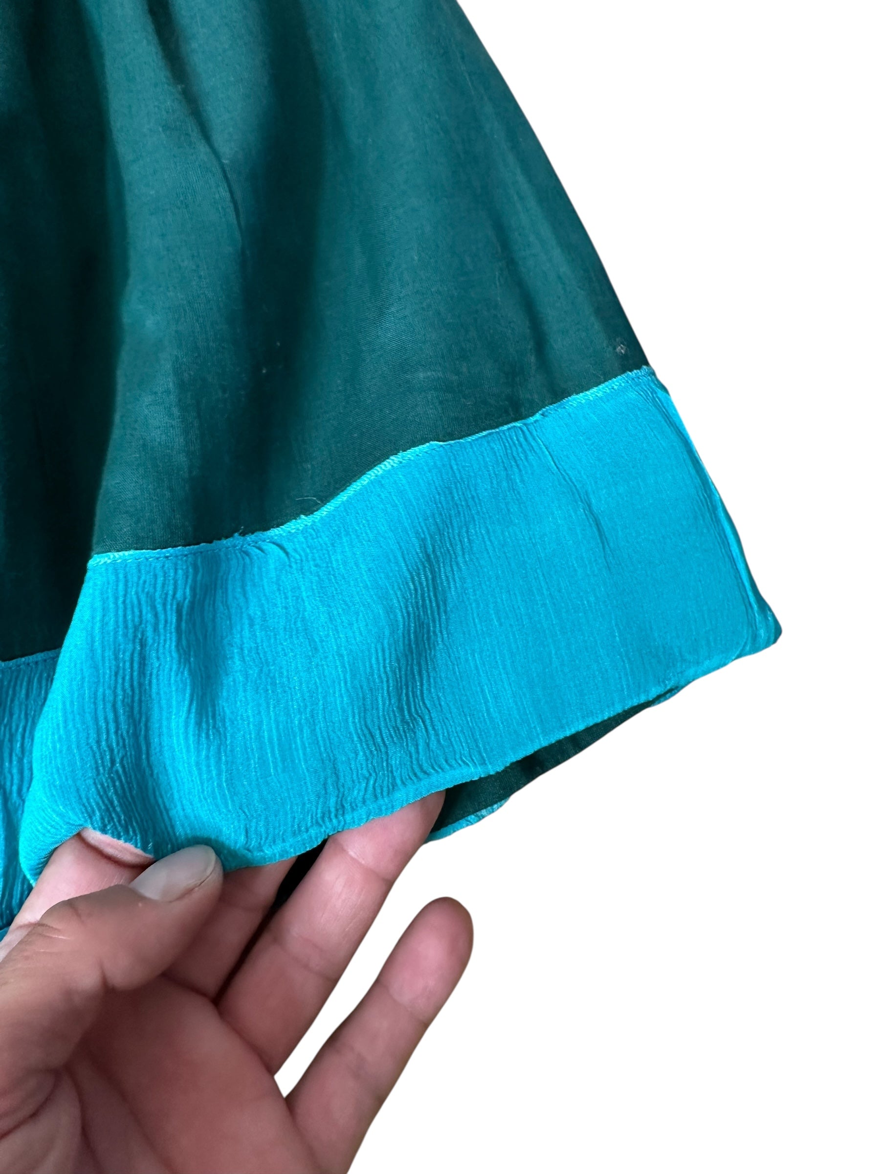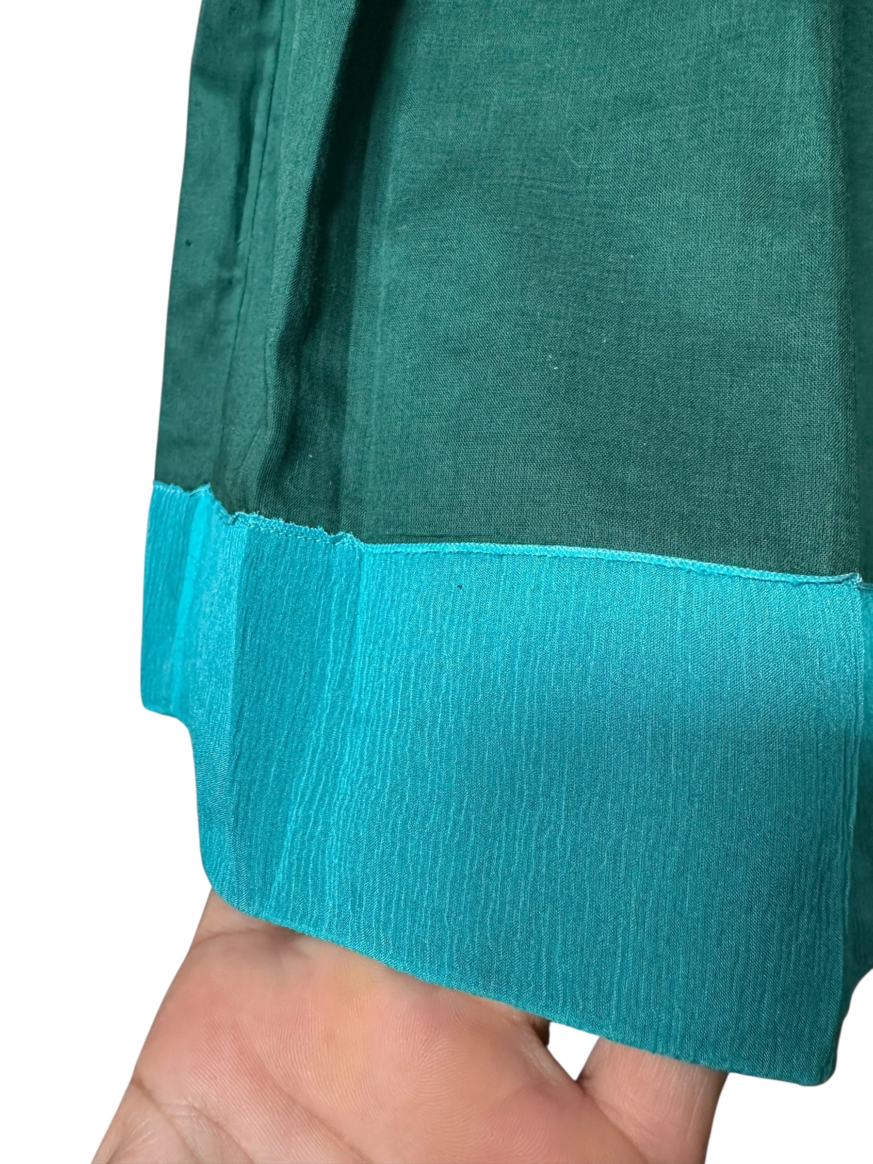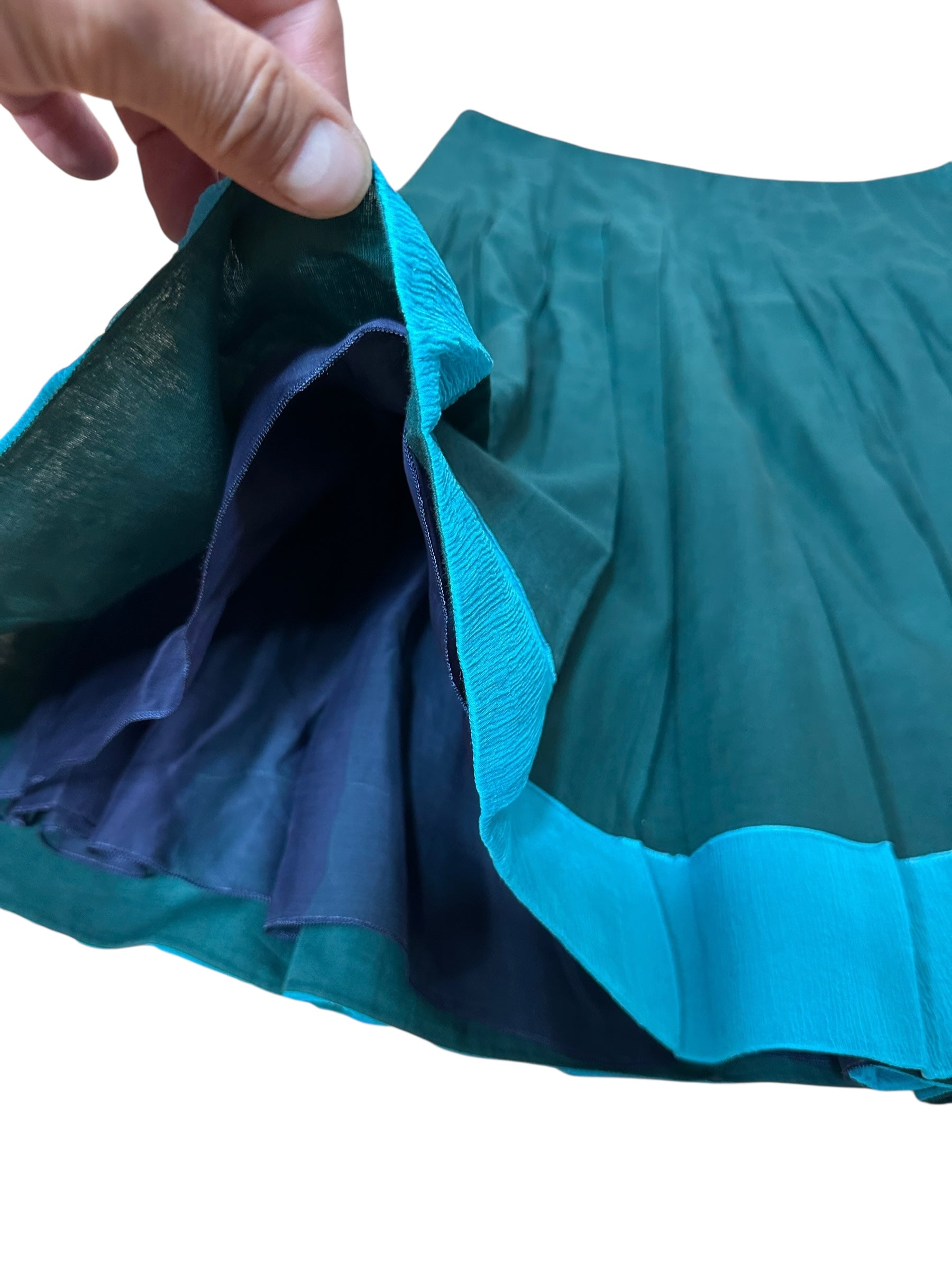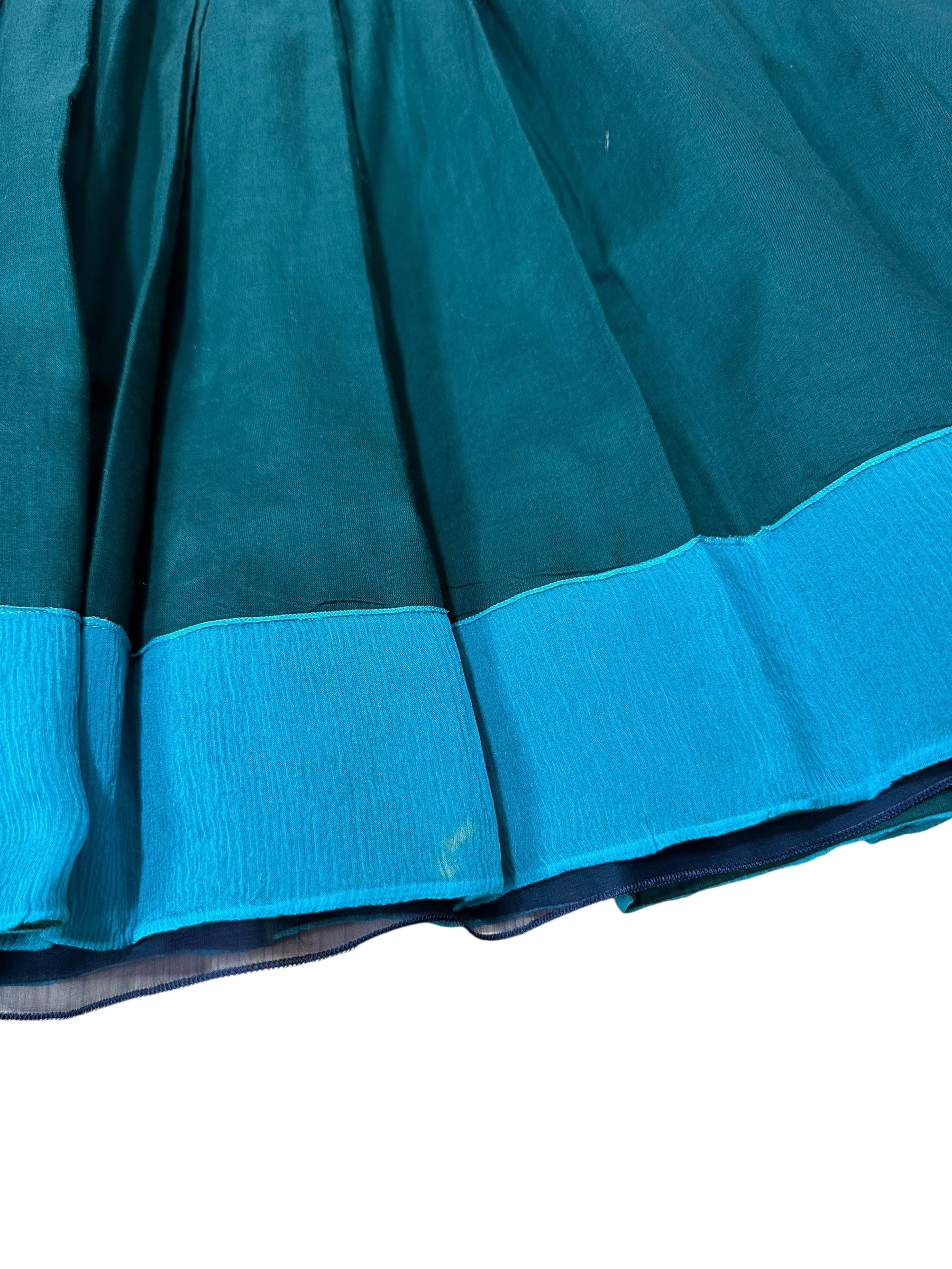 Elegante e strutturata, questa gonna vintage Prada Made in Italy si distingue per il suo design raffinato e la costruzione sartoriale. Realizzata in 100% cotone con profilo finale in 100% seta, presenta una silhouette a ruota con pieghe ampie e definite che donano volume e movimento. Il fondo è impreziosito da una fascia turchese a contrasto con il corpo verde petrolio della gonna, creando un effetto visivo deciso ma armonico.