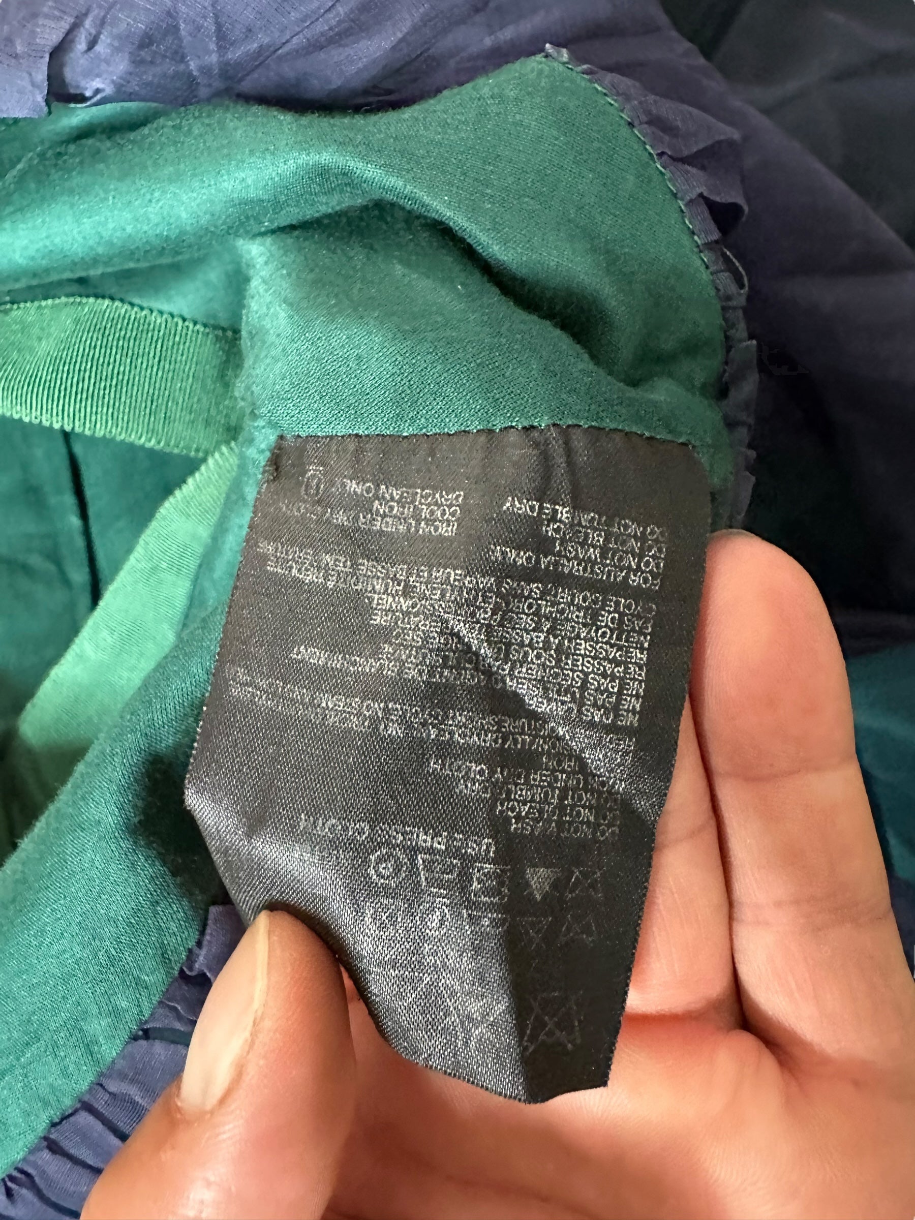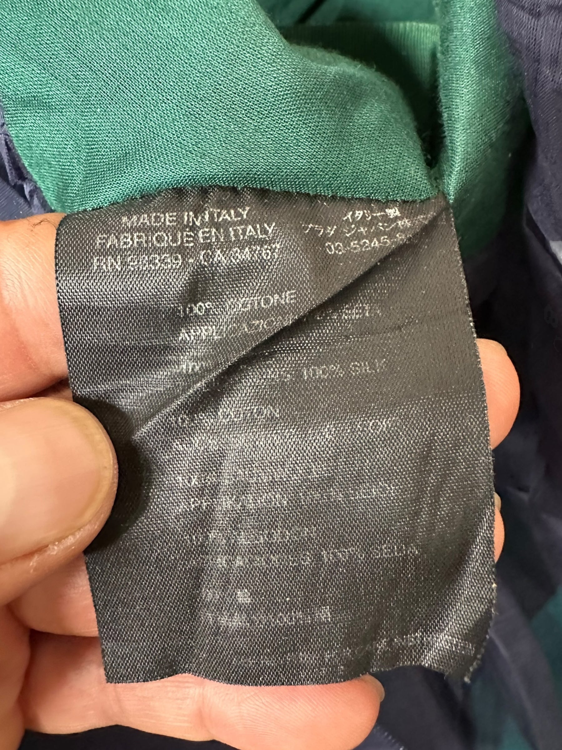 Condizioni: buone. Sono presenti due piccole macchie e un leggero alone localizzato sulla fascia turchese finale, come evidenziato in foto. Tali segni risultano poco visibili durante l’indosso e potrebbero attenuarsi o scomparire completamente con un lavaggio specializzato.