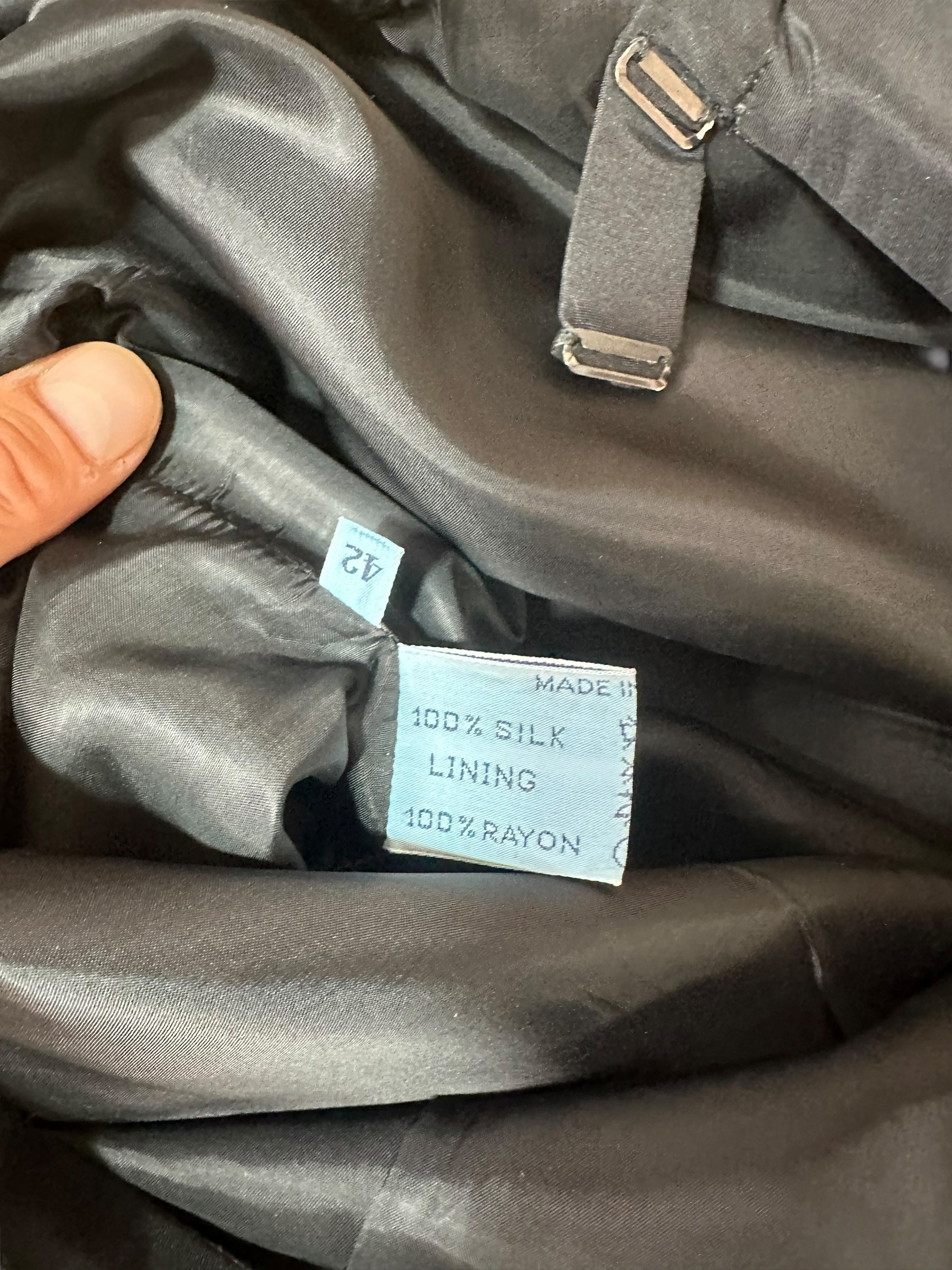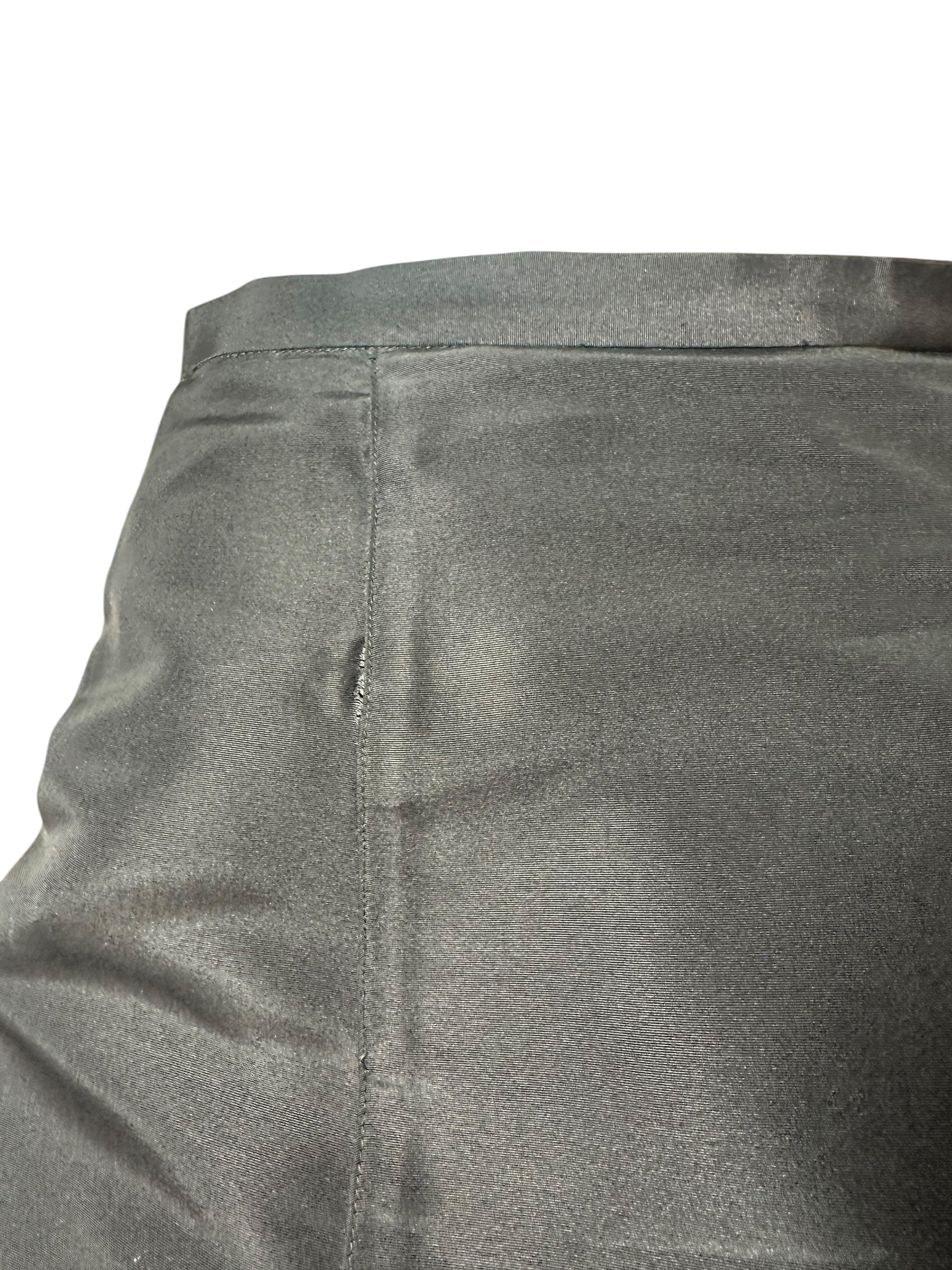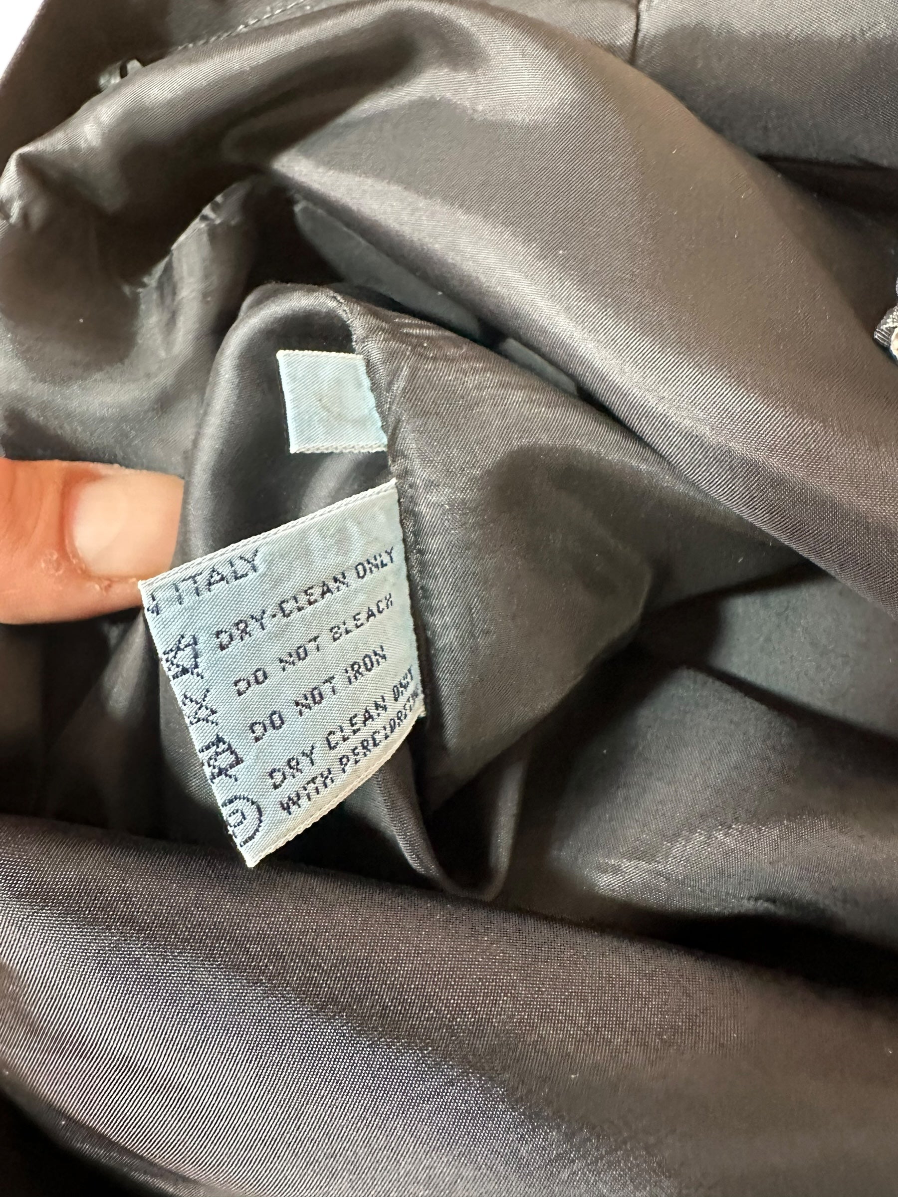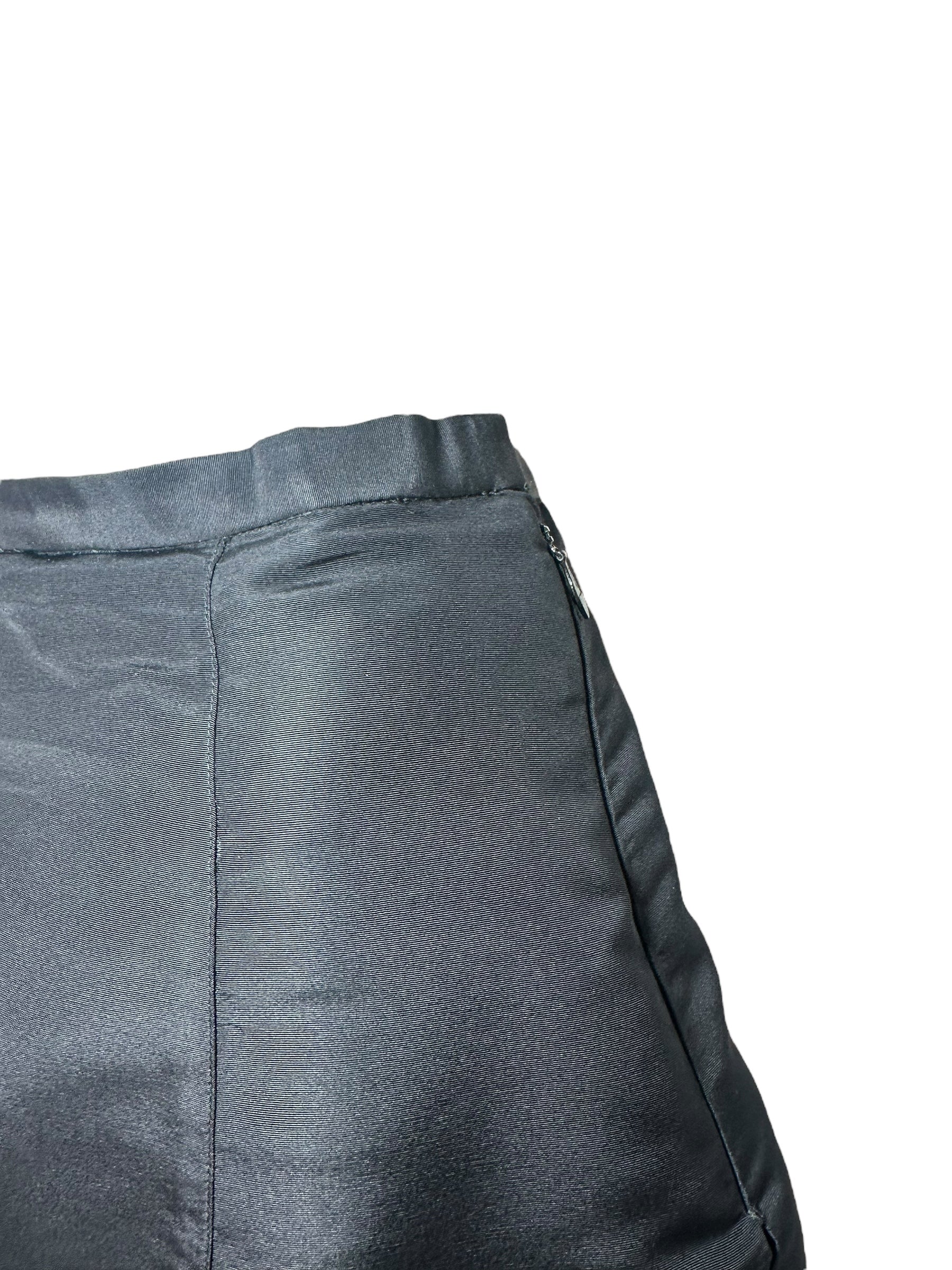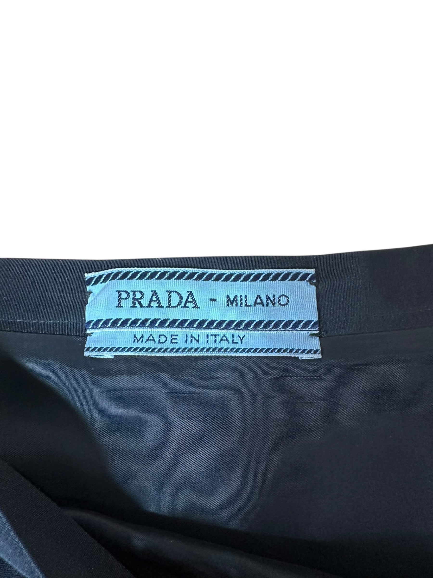 Gonna vintage Prada con linea leggermente a palloncino, realizzata in 100% seta con fodera interna in 100% rayon. Il tessuto ha un aspetto satinato, elegante e strutturato. Modello a vita alta con chiusura laterale a zip e gancetti in metallo. Presenta una cucitura decorativa lungo la parte frontale, che in un punto risulta leggermente allentata (visibile in foto).