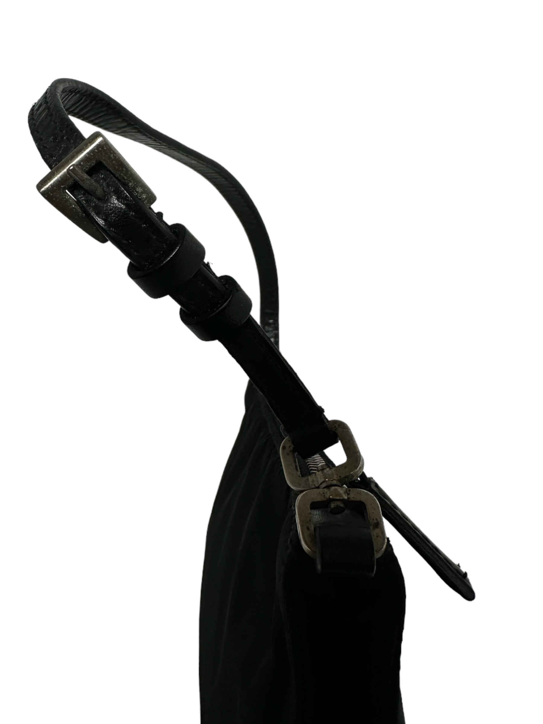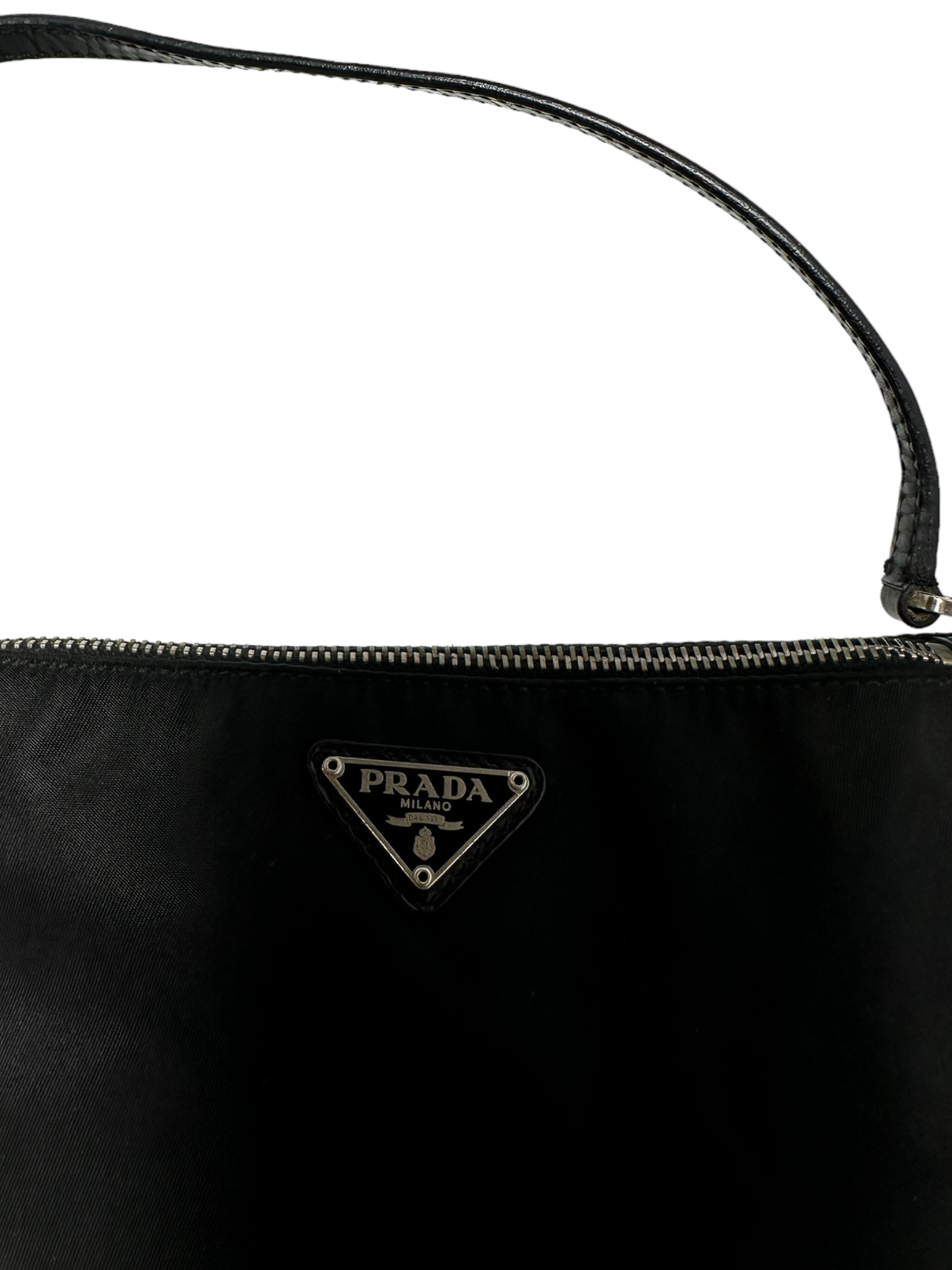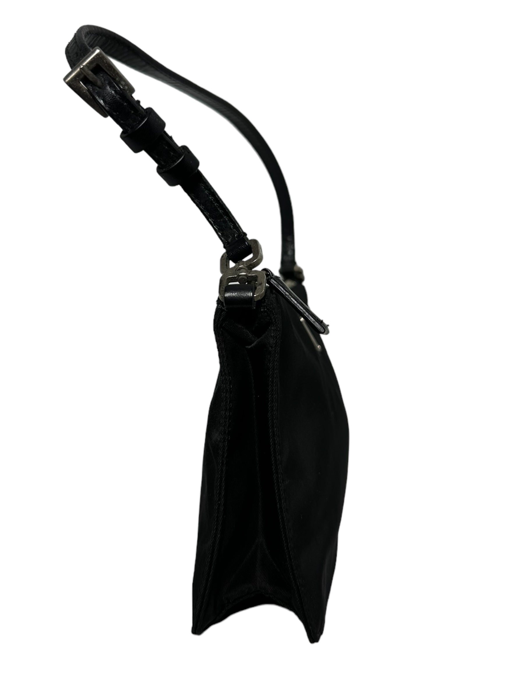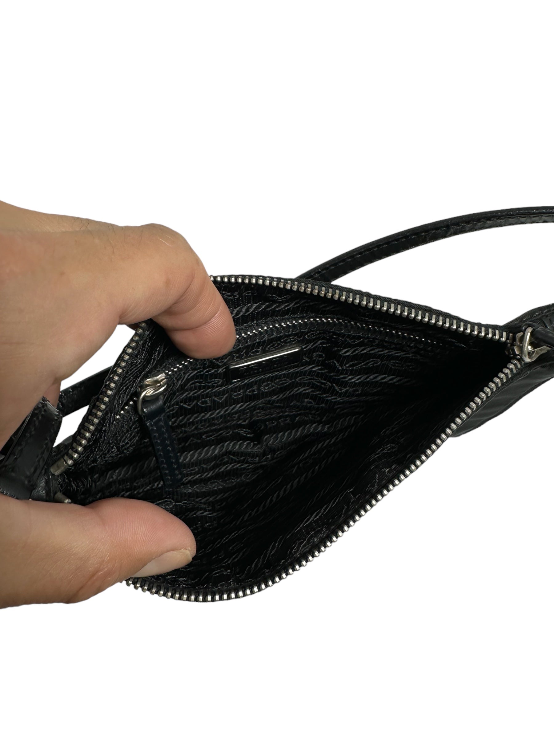 Prada mini borsa vintage in nylon nero con manico in pelle regolabile, chiusura a zip. Interno con taschino, può contenere un iPhone plus.