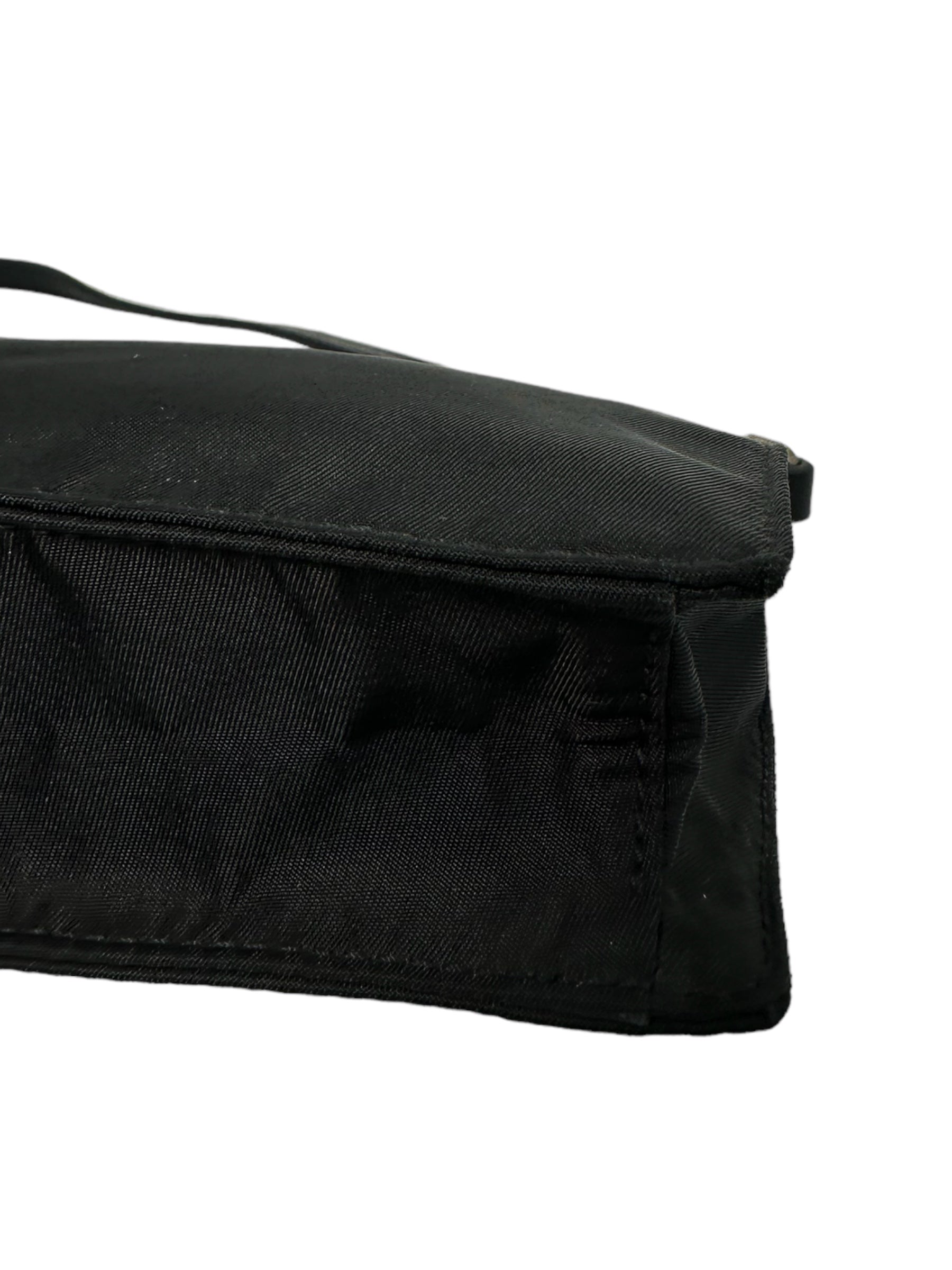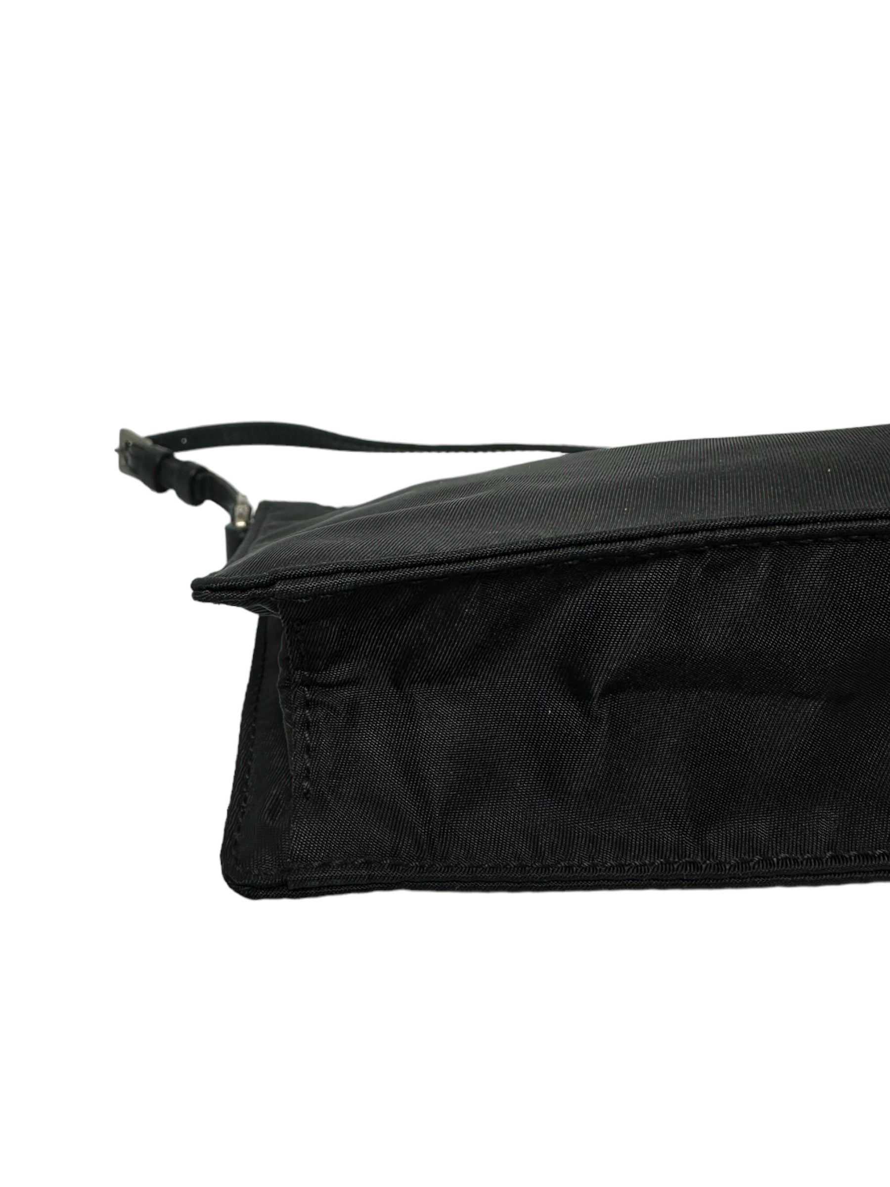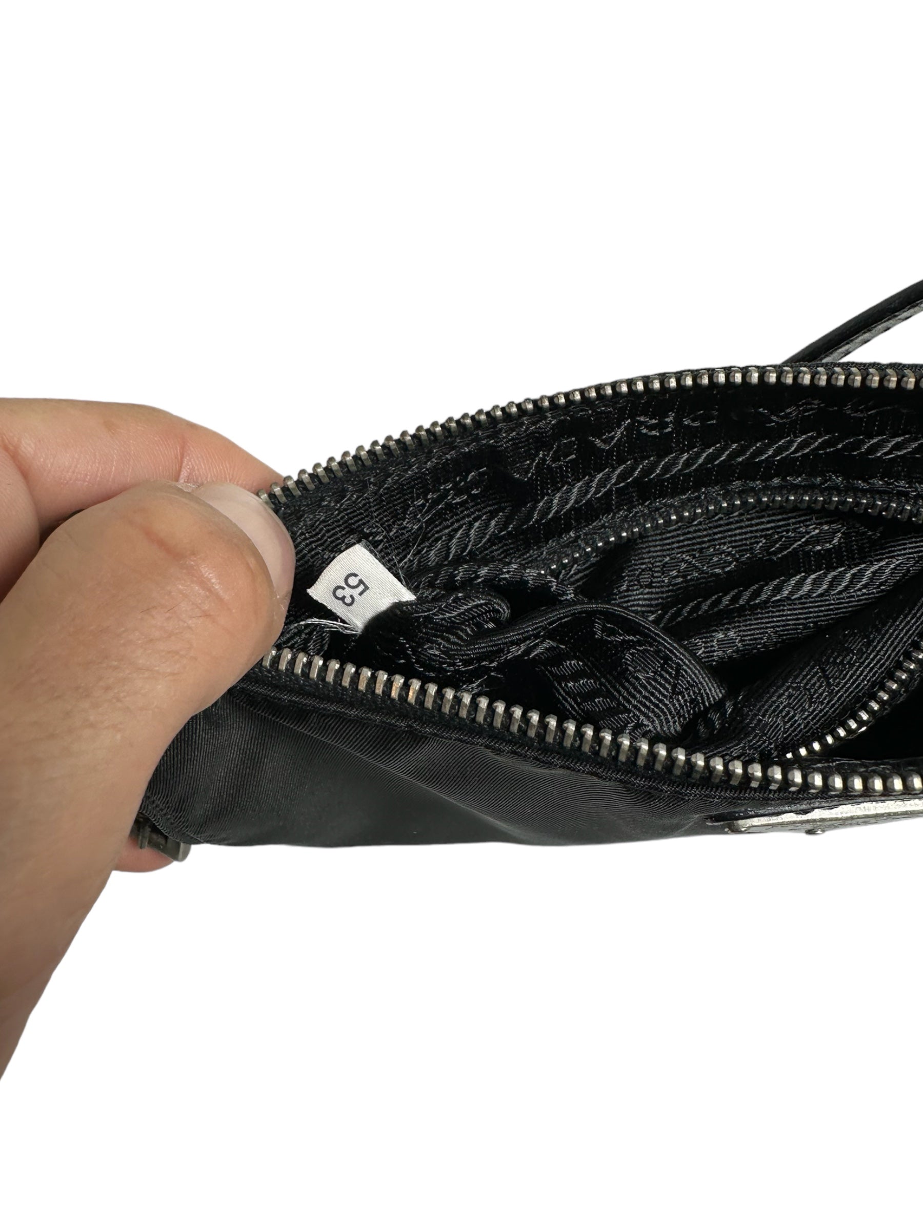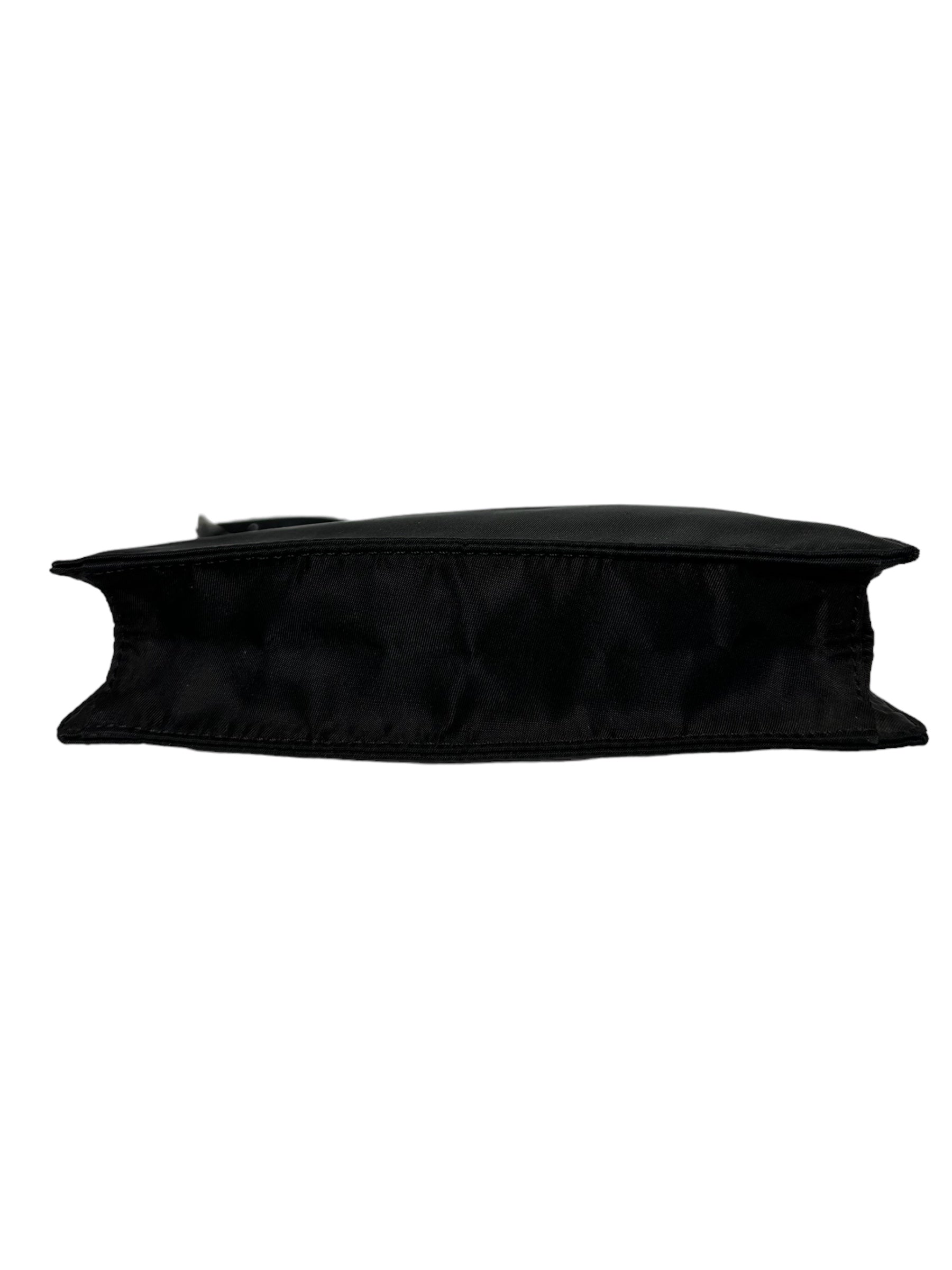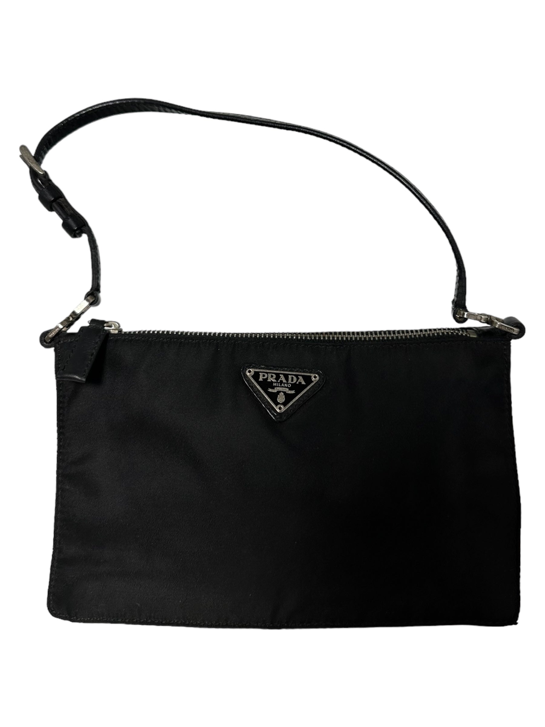 Prada mini borsa vintage in nylon nero con manico in pelle regolabile, chiusura a zip. Interno con taschino, può contenere un iPhone plus.