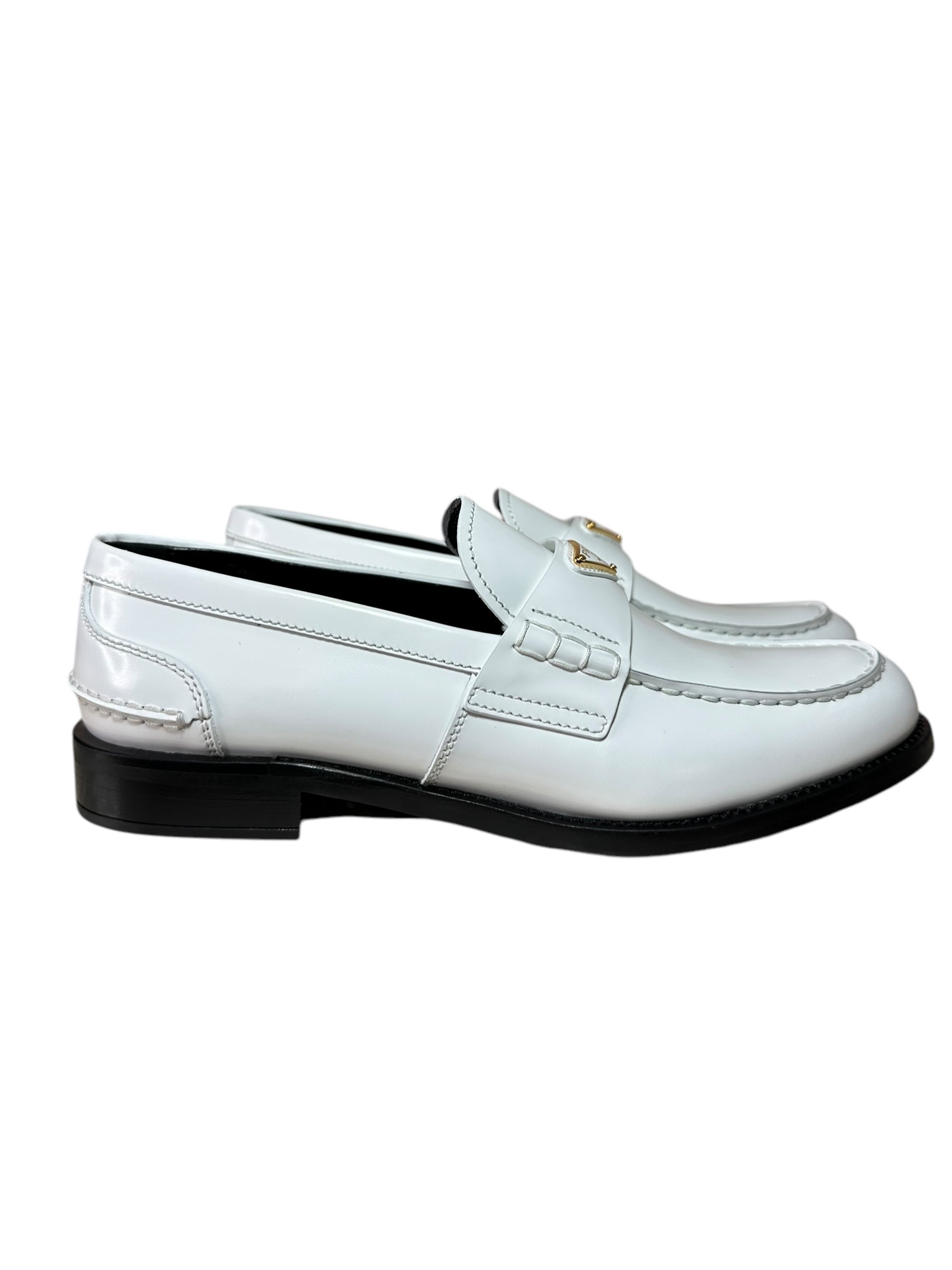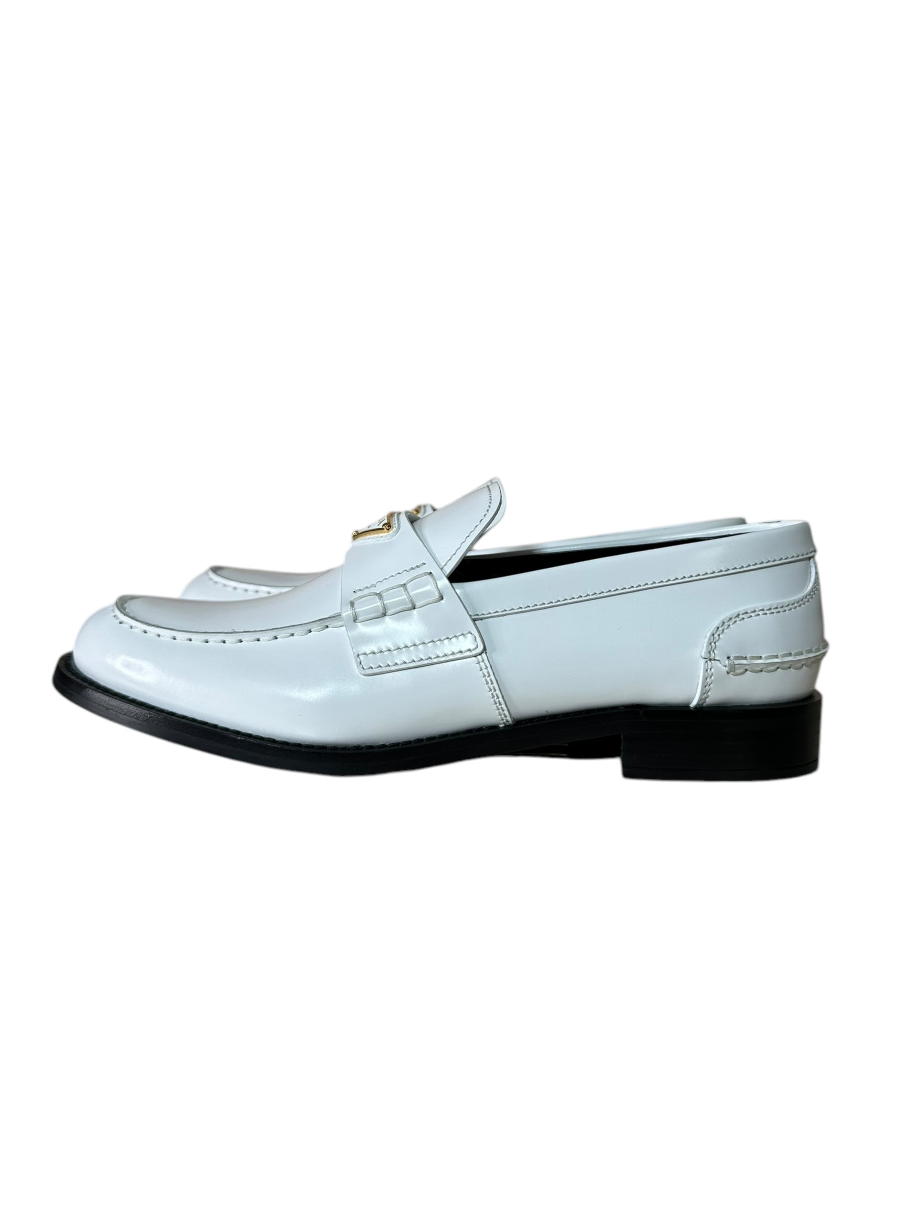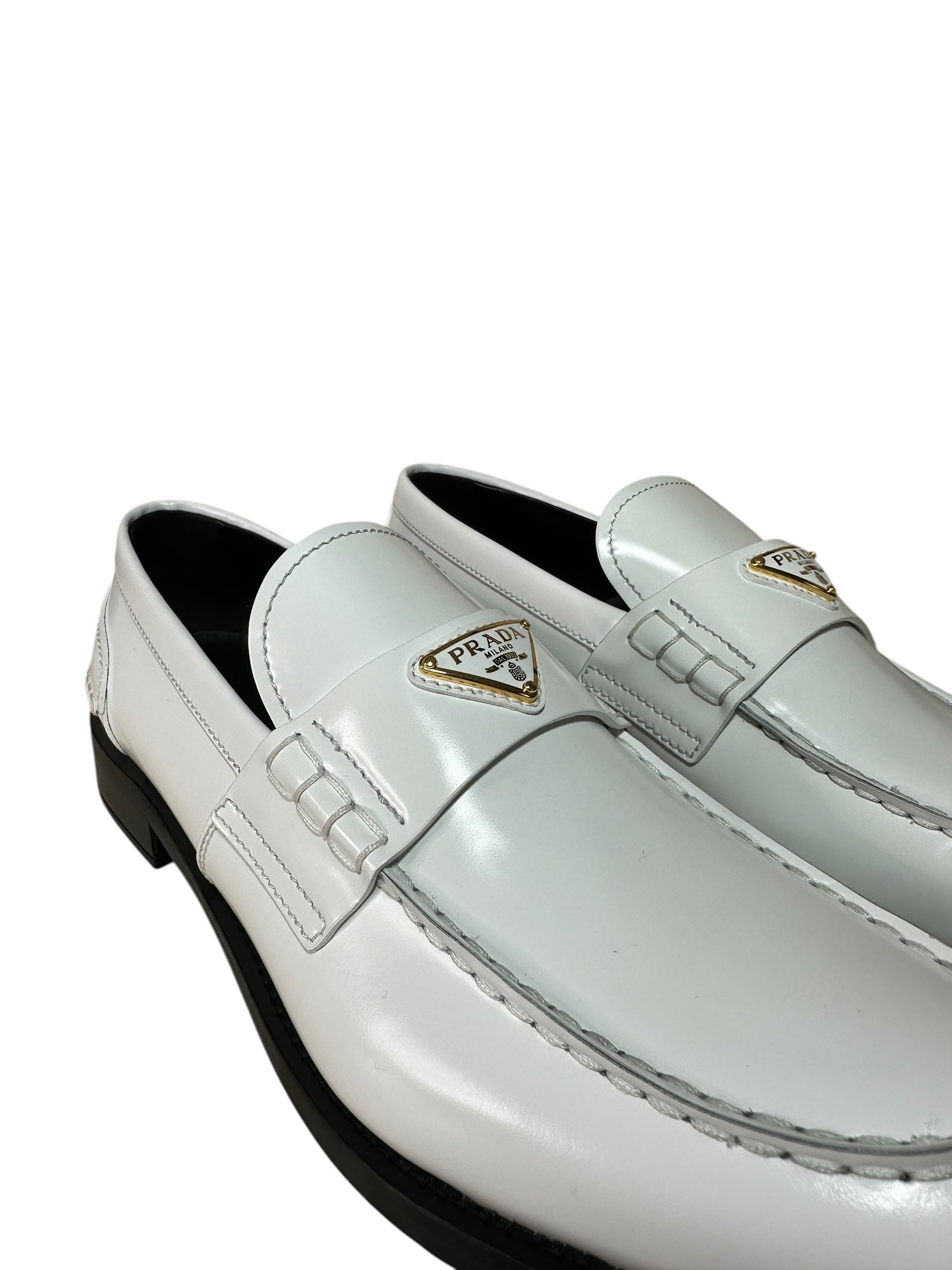 Eleganti mocassini Prada realizzati in pelle bianca lucida, con iconico logo triangolare in metallo dorato sulla mascherina. Design pulito e moderno, suola in gomma nera con logo inciso. Interno in pelle nera con scritta dorata.