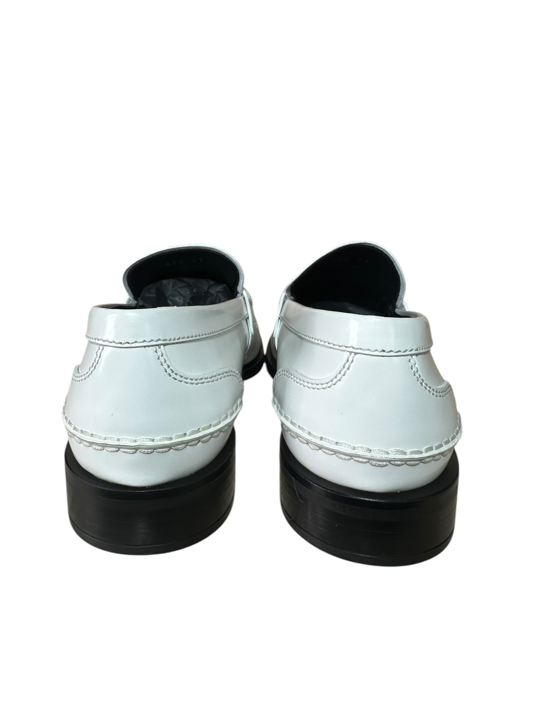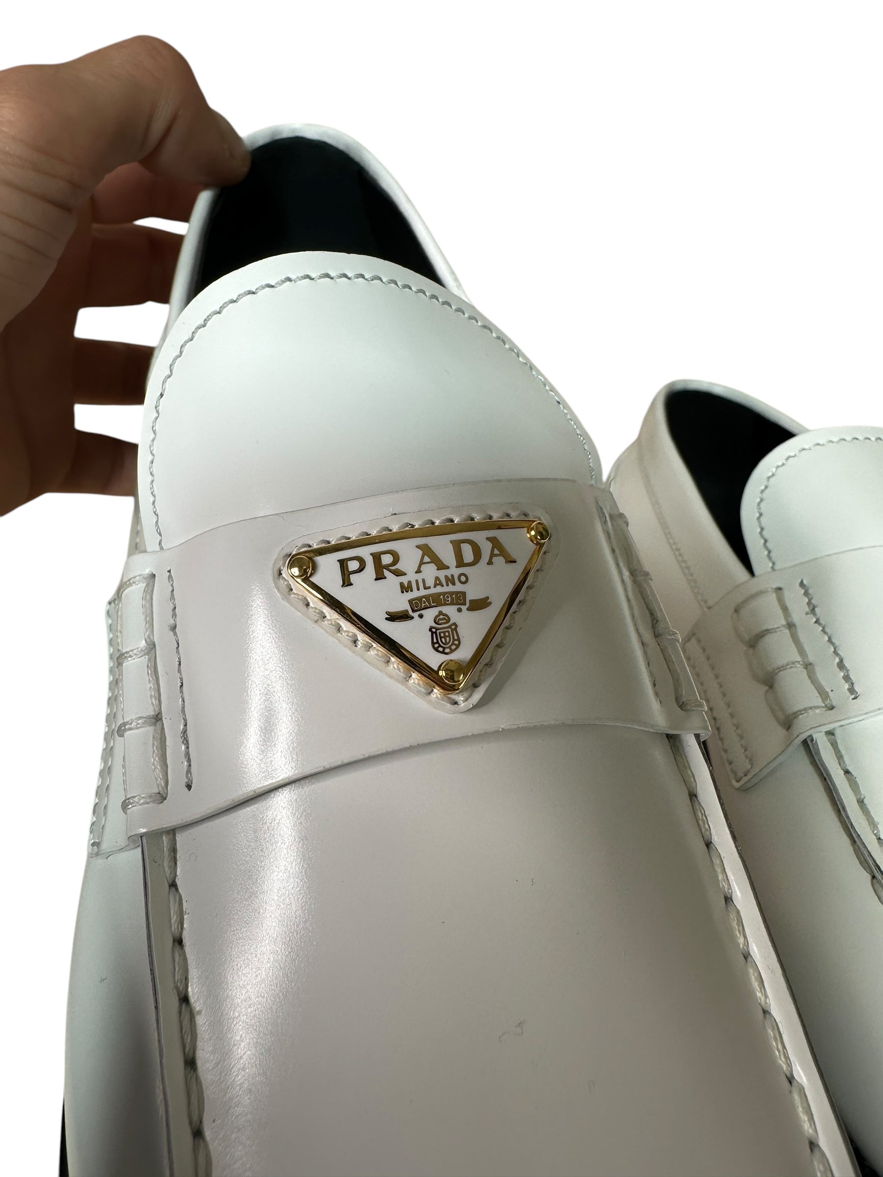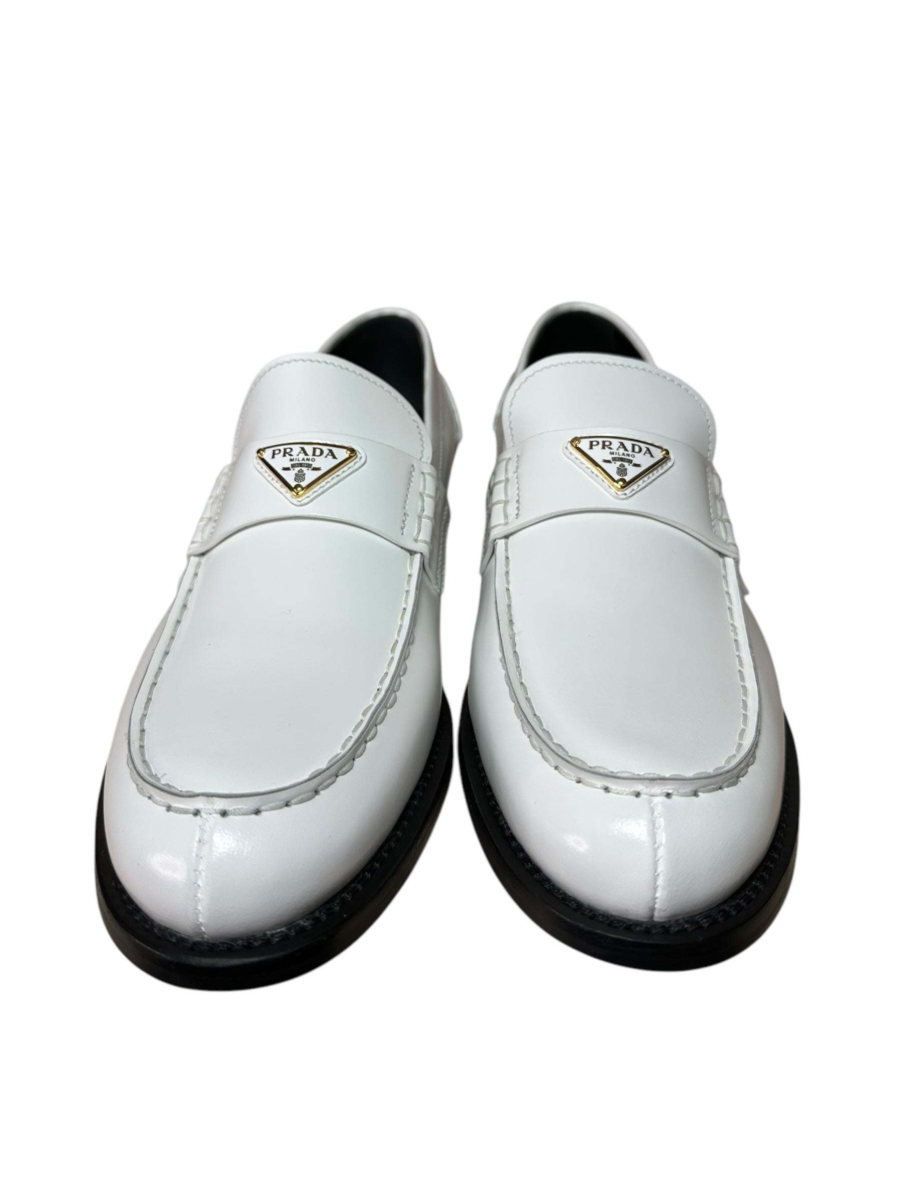 Eleganti mocassini Prada realizzati in pelle bianca lucida, con iconico logo triangolare in metallo dorato sulla mascherina. Design pulito e moderno, suola in gomma nera con logo inciso. Interno in pelle nera con scritta dorata.