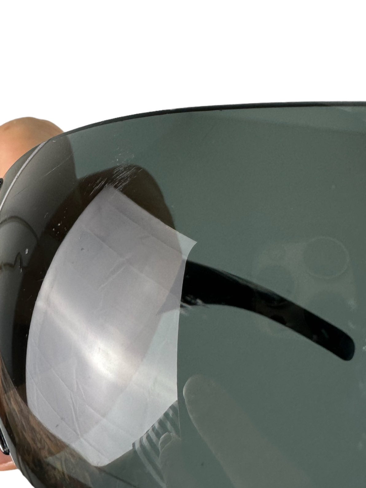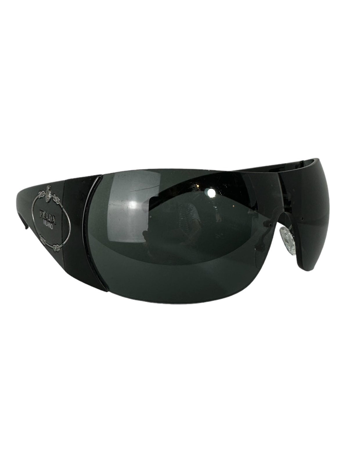 Prada occhiali vintage anni 2000s a mascherina con montatura laterale in pvc e bacchette con logo lavorato in metallo. Piccoli segni di usura sulla lente destra. Vedi foto.