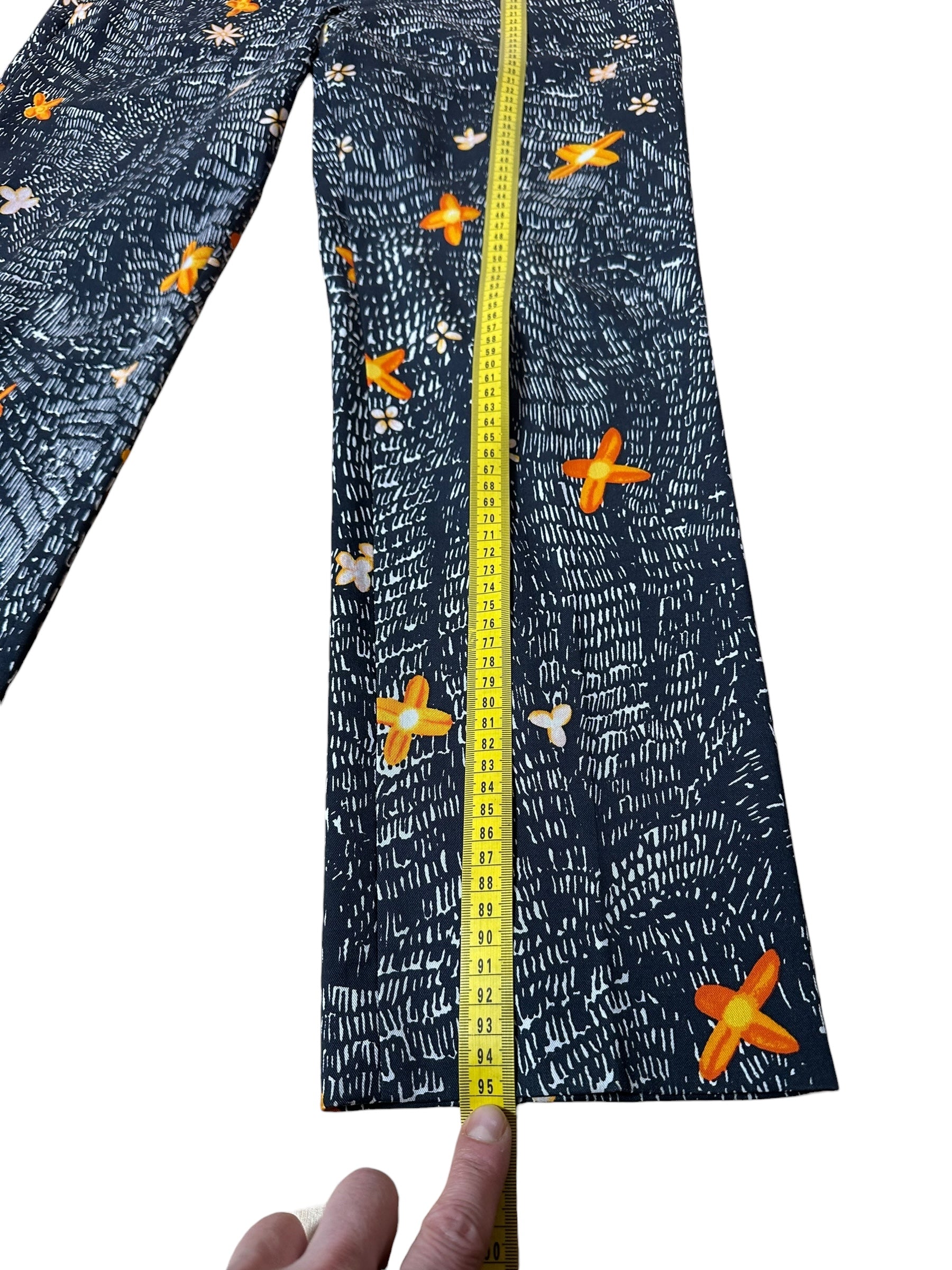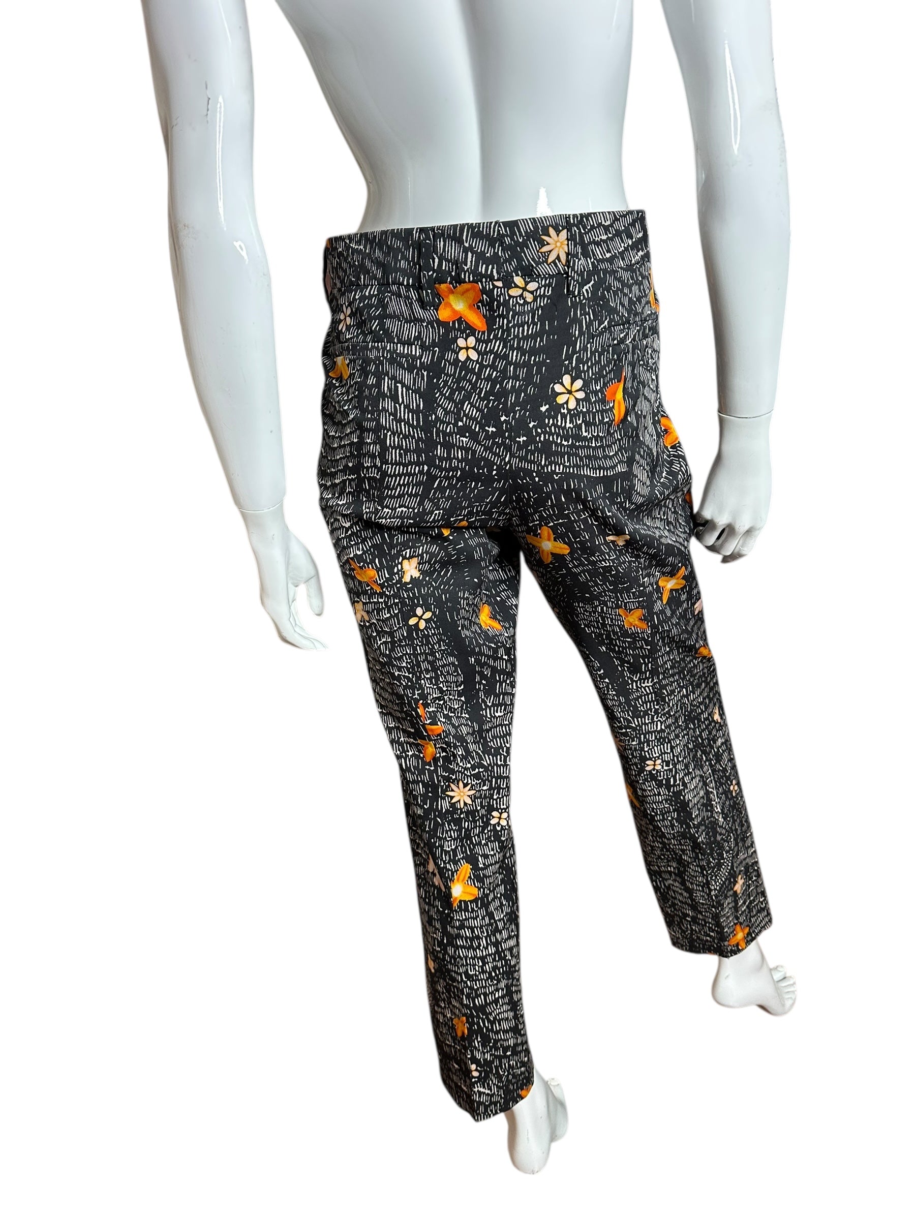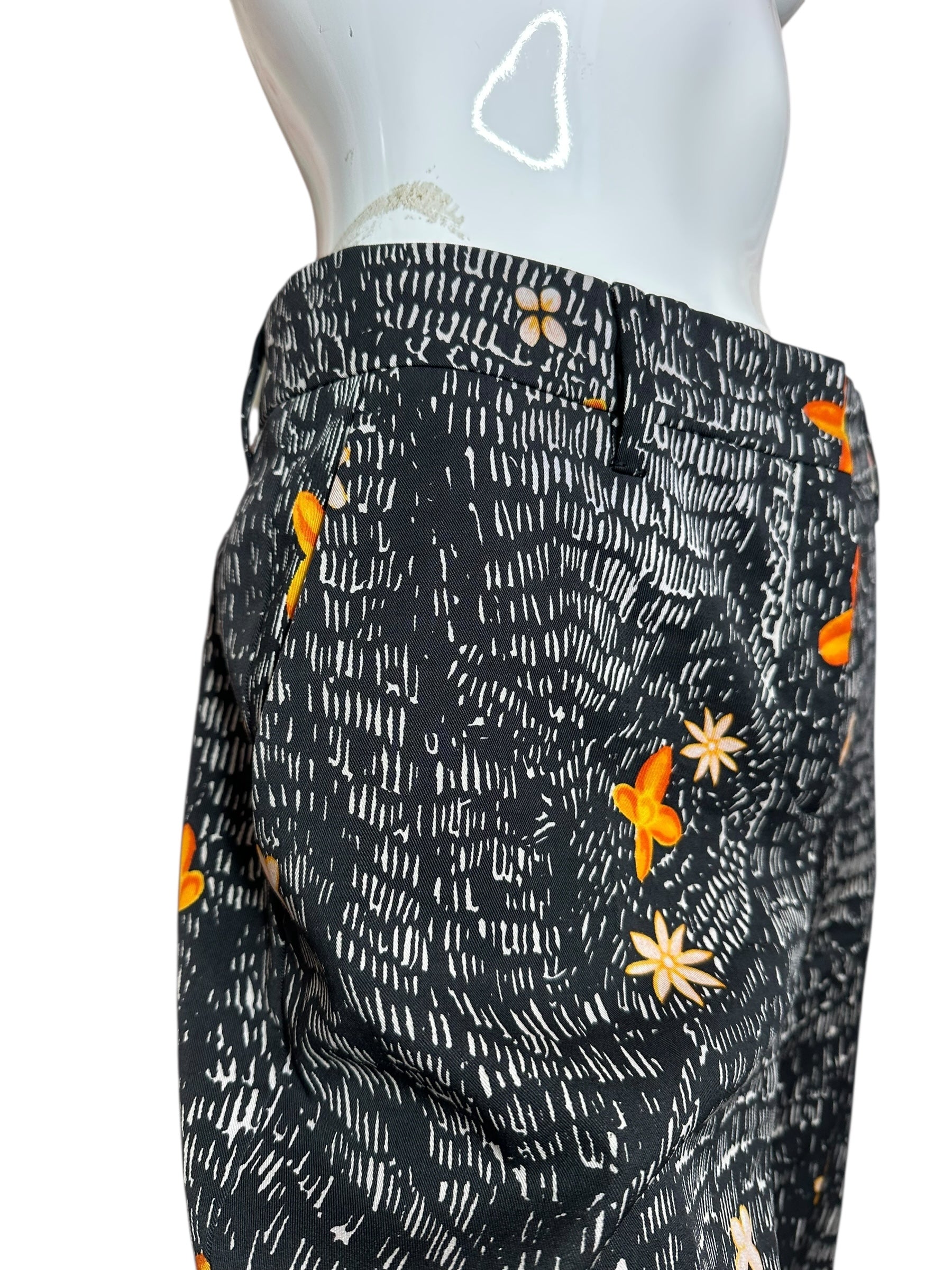 Pantaloni firmati Prada, realizzati in lana vergine con una raffinata stampa grafica su fondo nero arricchita da motivi floreali nei toni dell’arancio, avorio e giallo.