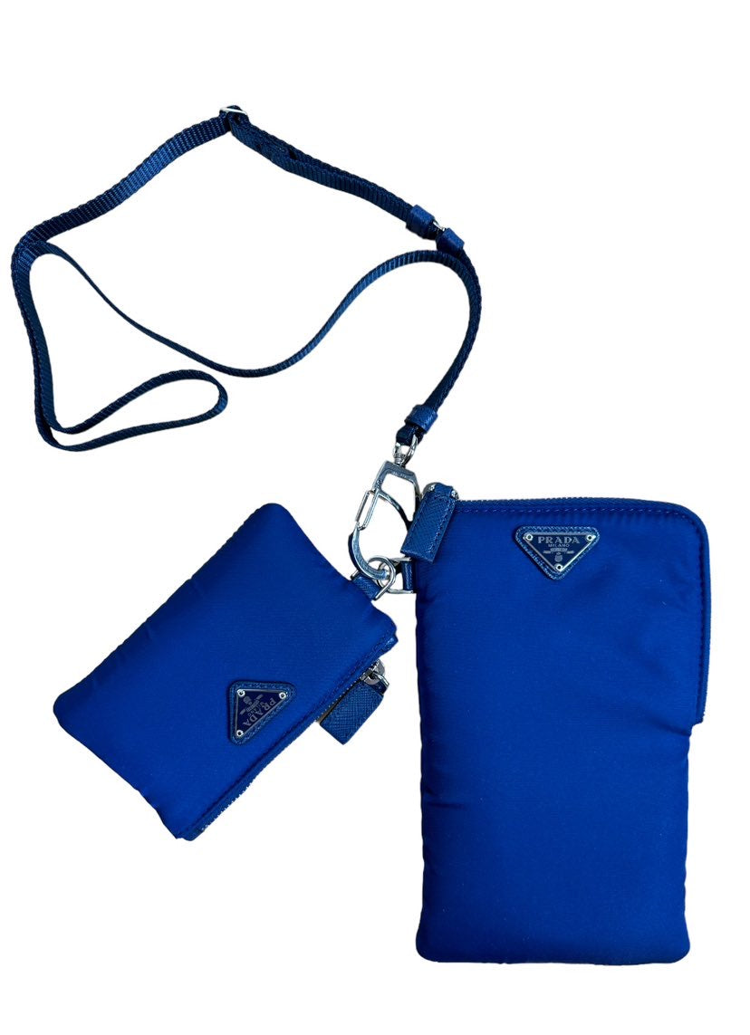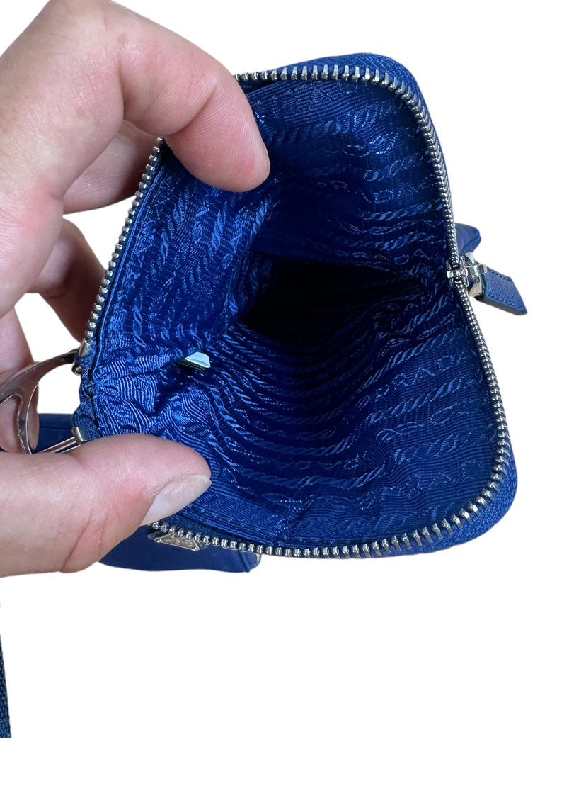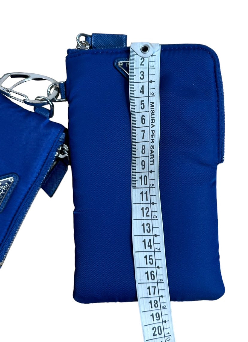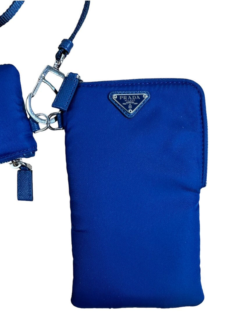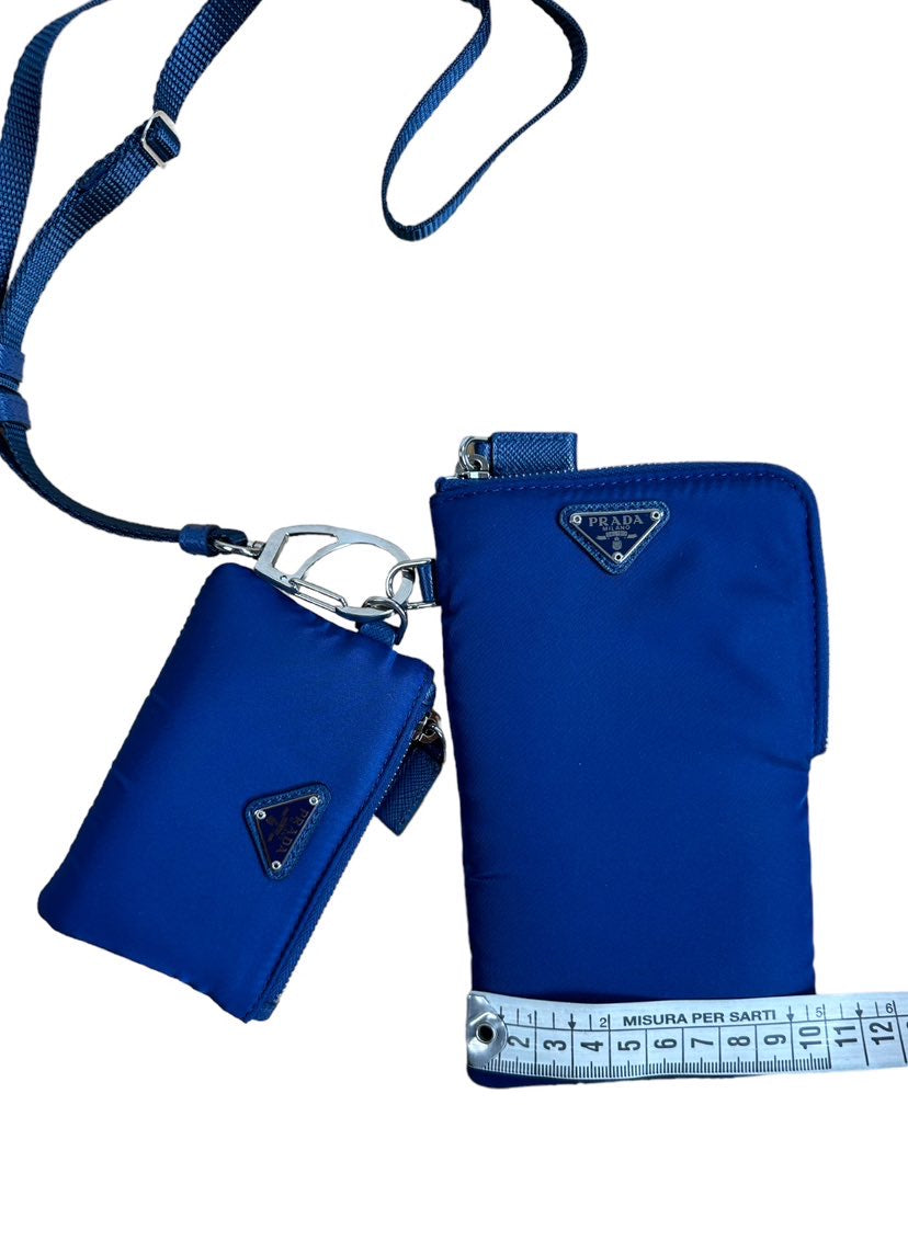 Prada porta telefono in nylon blu con tracolla regolabile e mini pochette porta monete rimovibile.Chiusura con zip in metallo. Misure in foto.