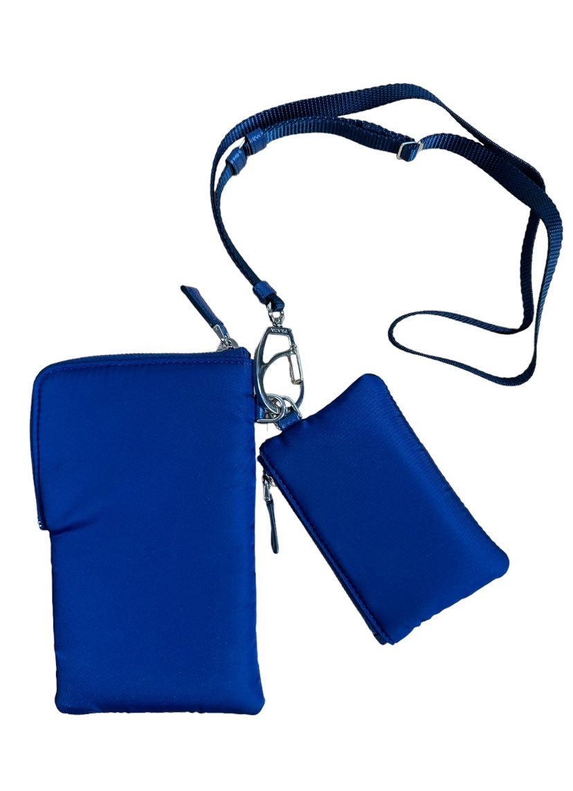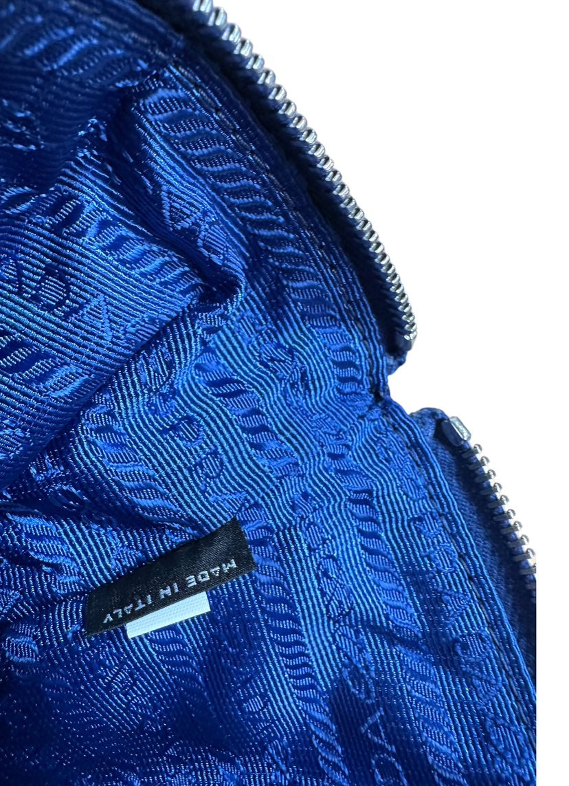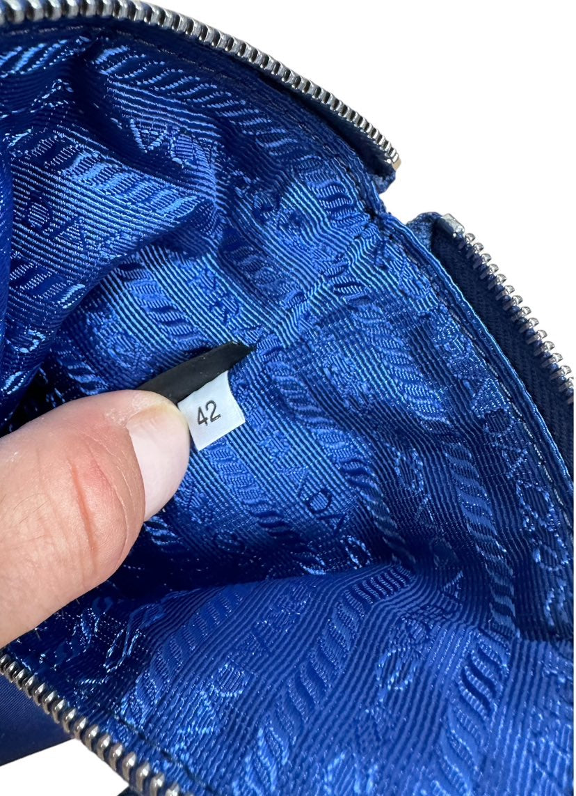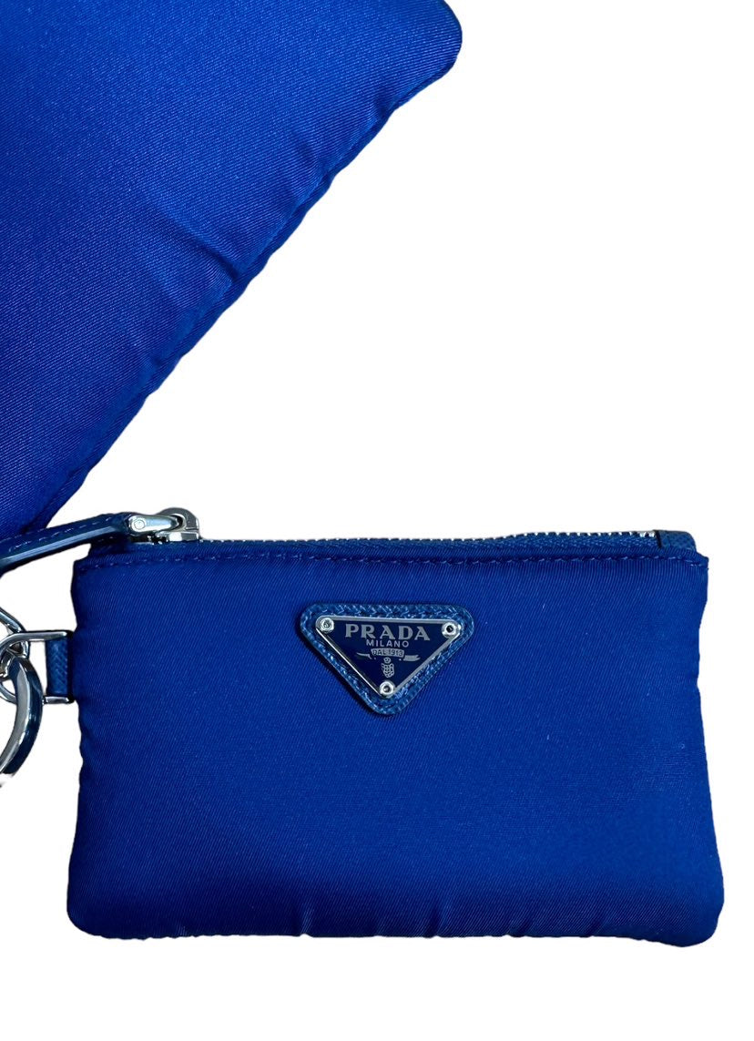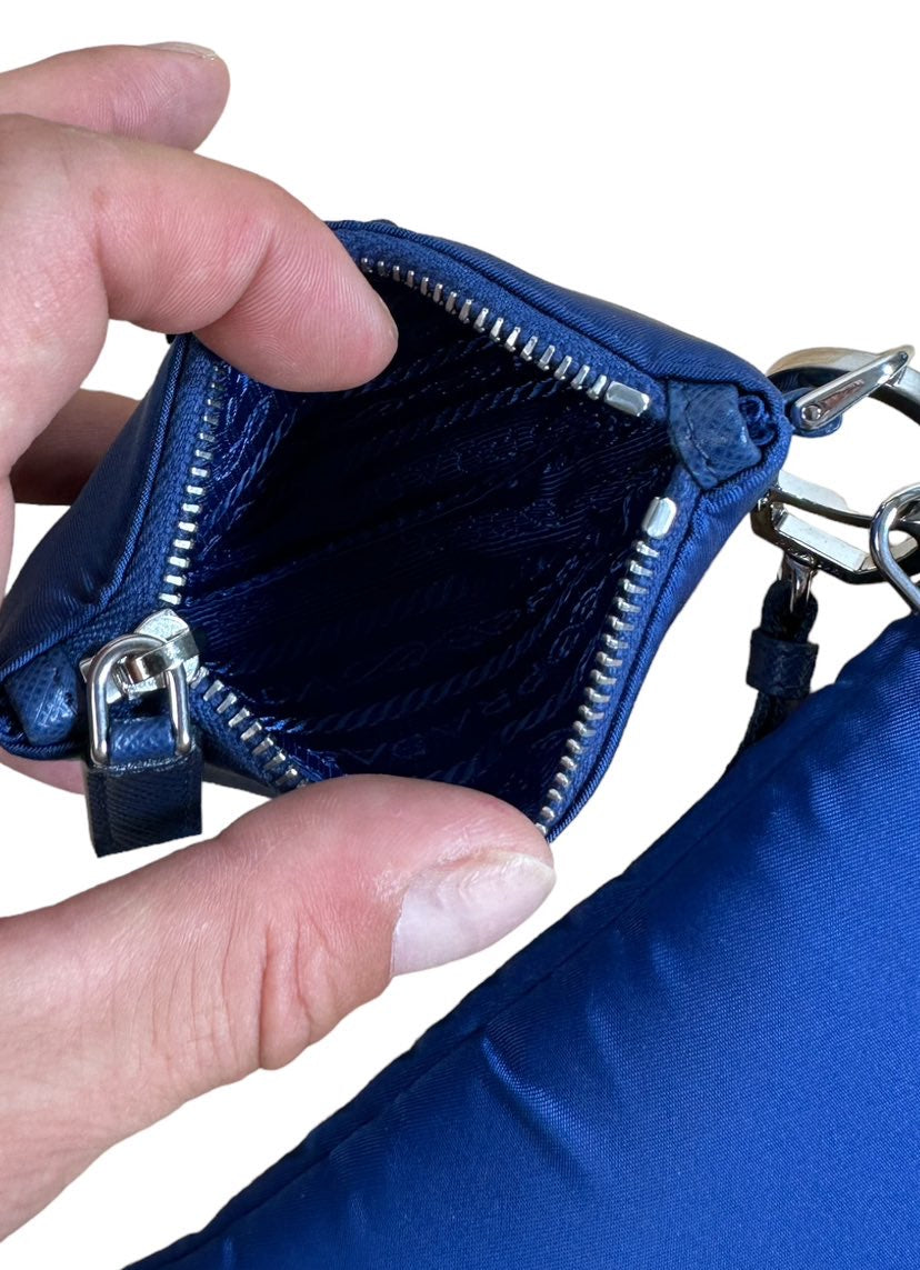 Prada porta telefono in nylon blu con tracolla regolabile e mini pochette porta monete rimovibile.Chiusura con zip in metallo. Misure in foto.