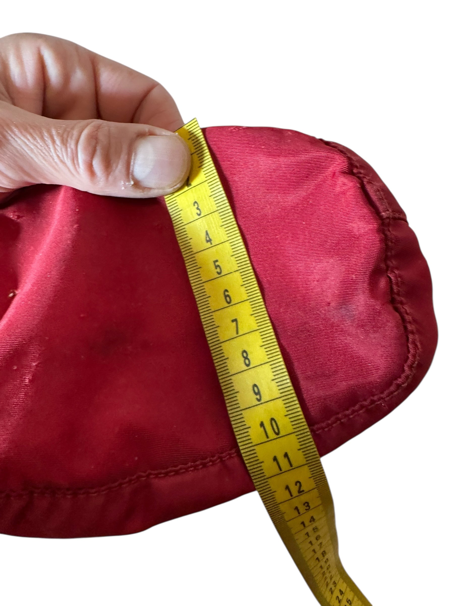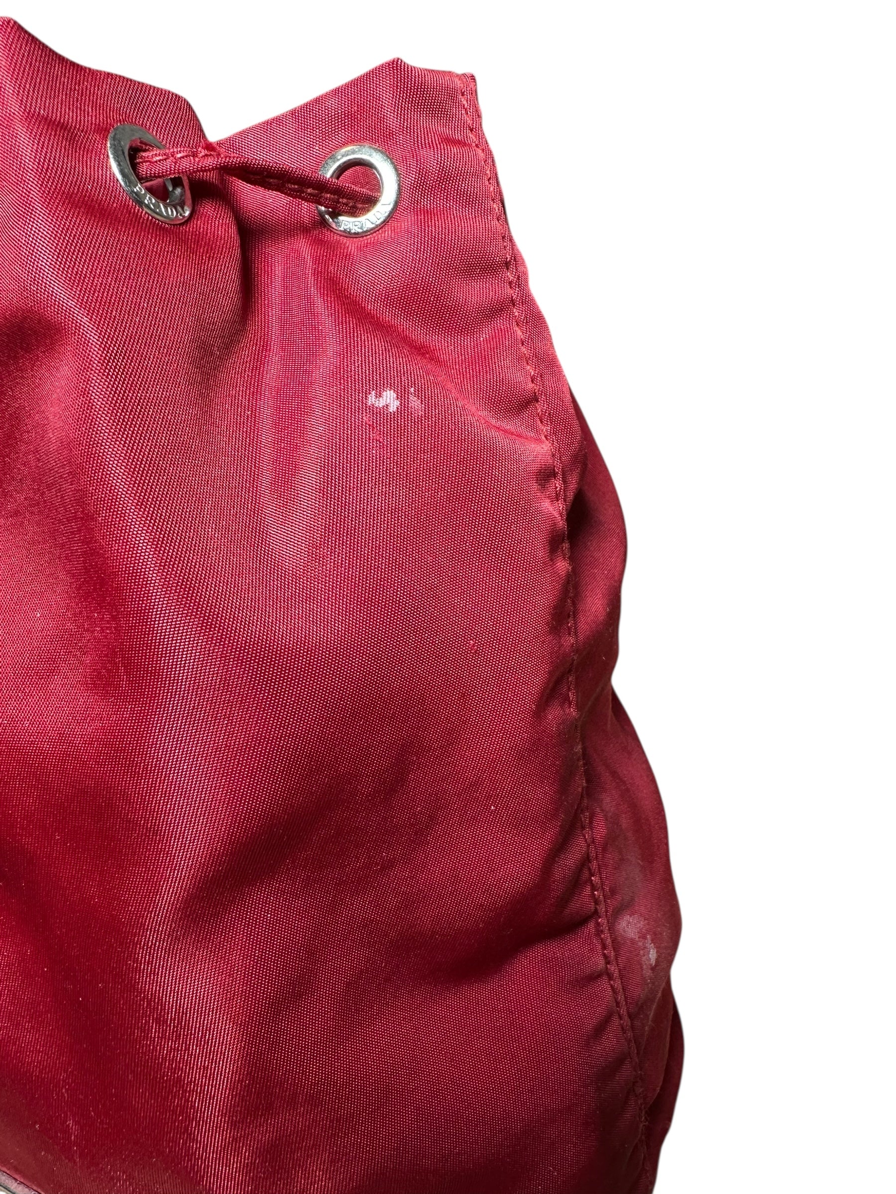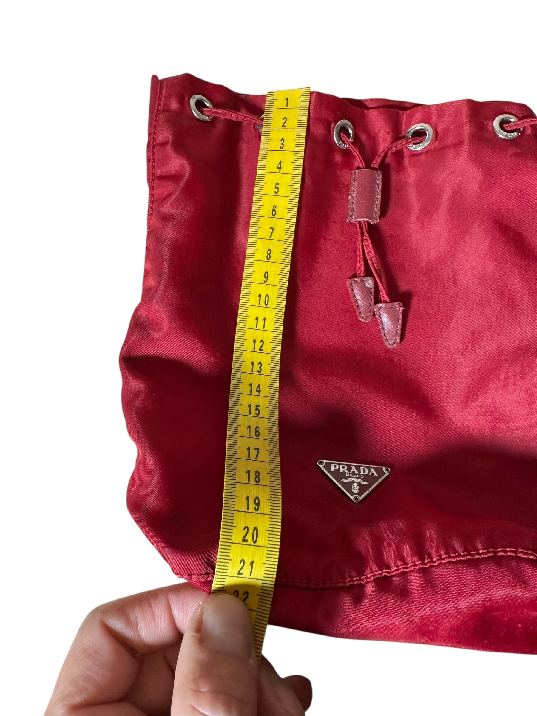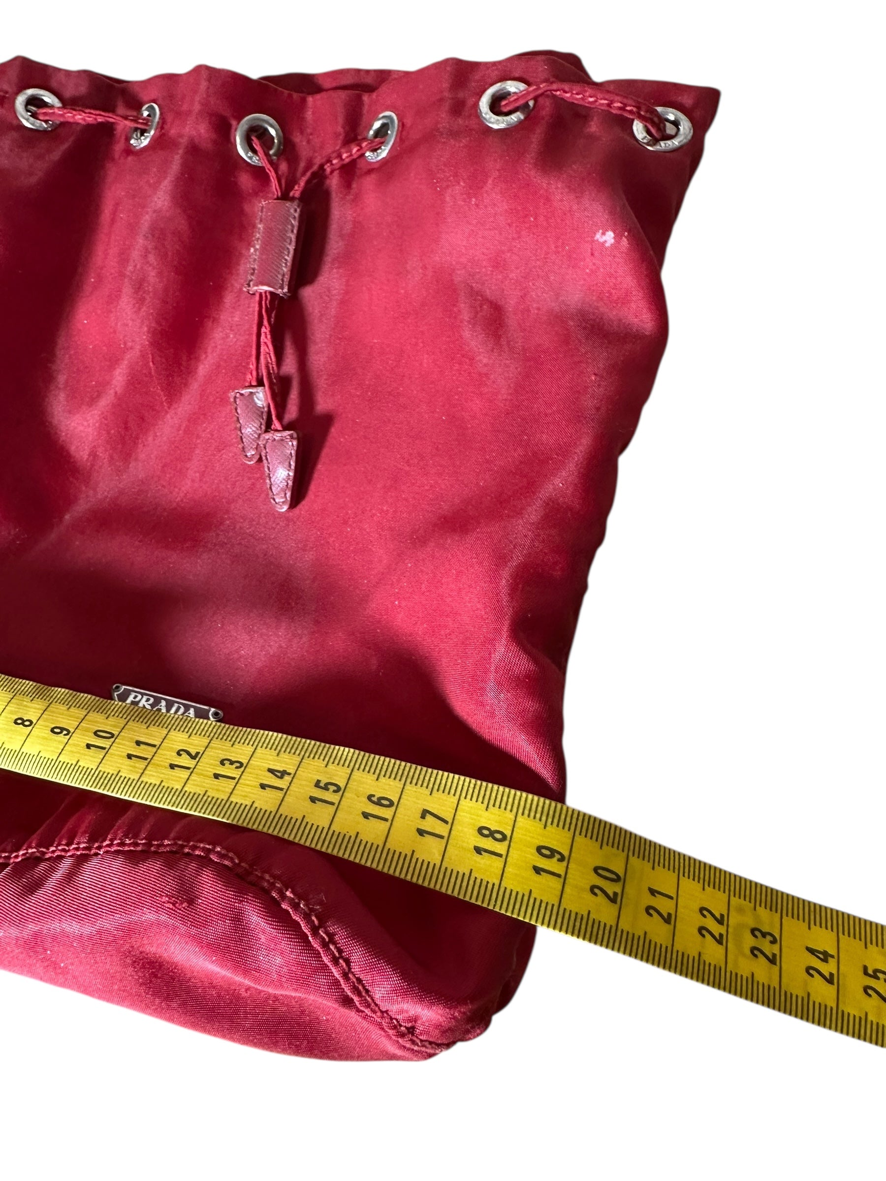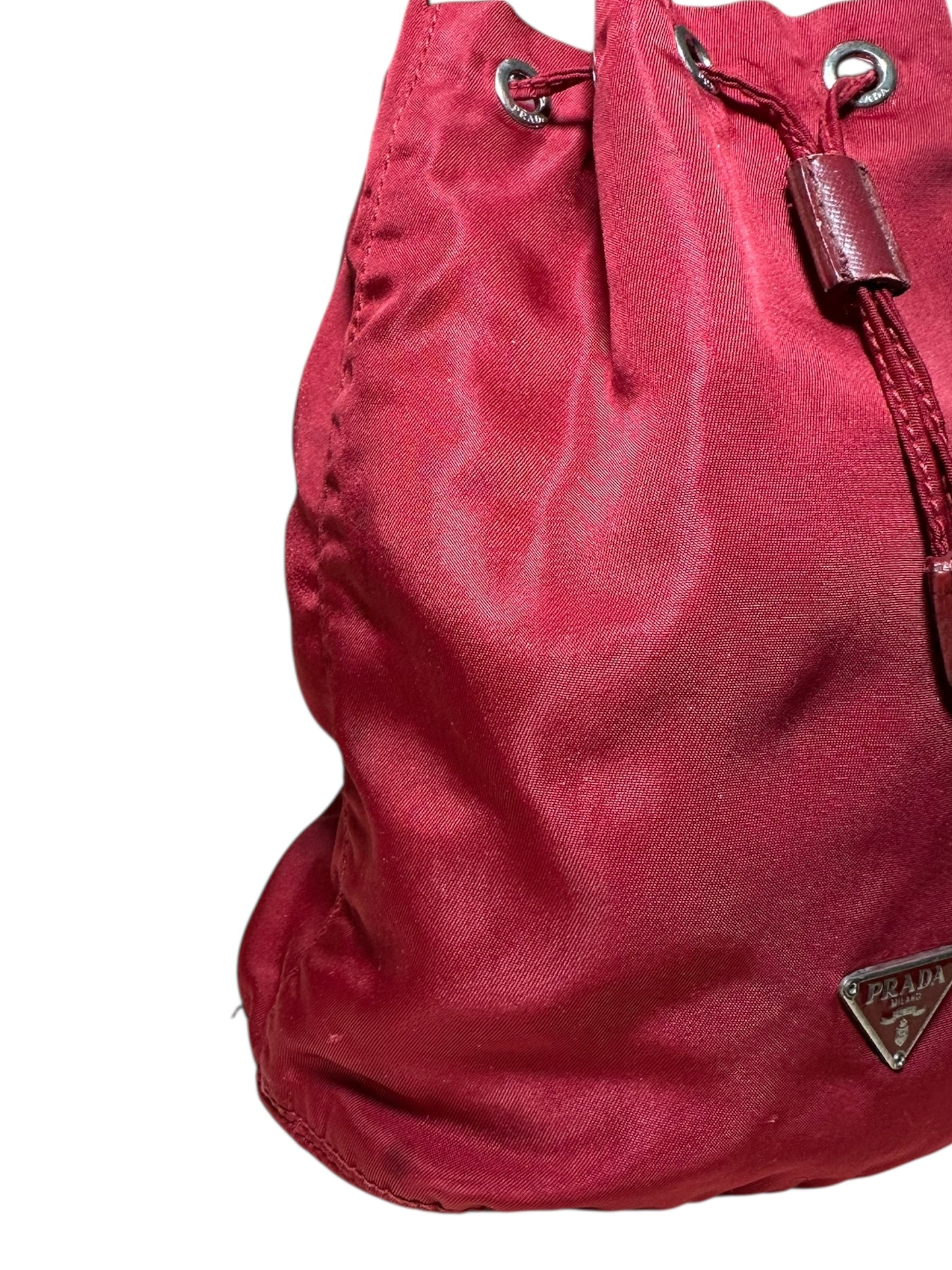 Borsa secchiello vintage firmata Prada, realizzata in nylon tecnico nel classico tono rosso intenso, impreziosita da placca triangolare in metallo applicata sul fronte. Modello iconico e funzionale, caratterizzato da chiusura con coulisse e manico superiore in tessuto coordinato, ideale per un utilizzo quotidiano.