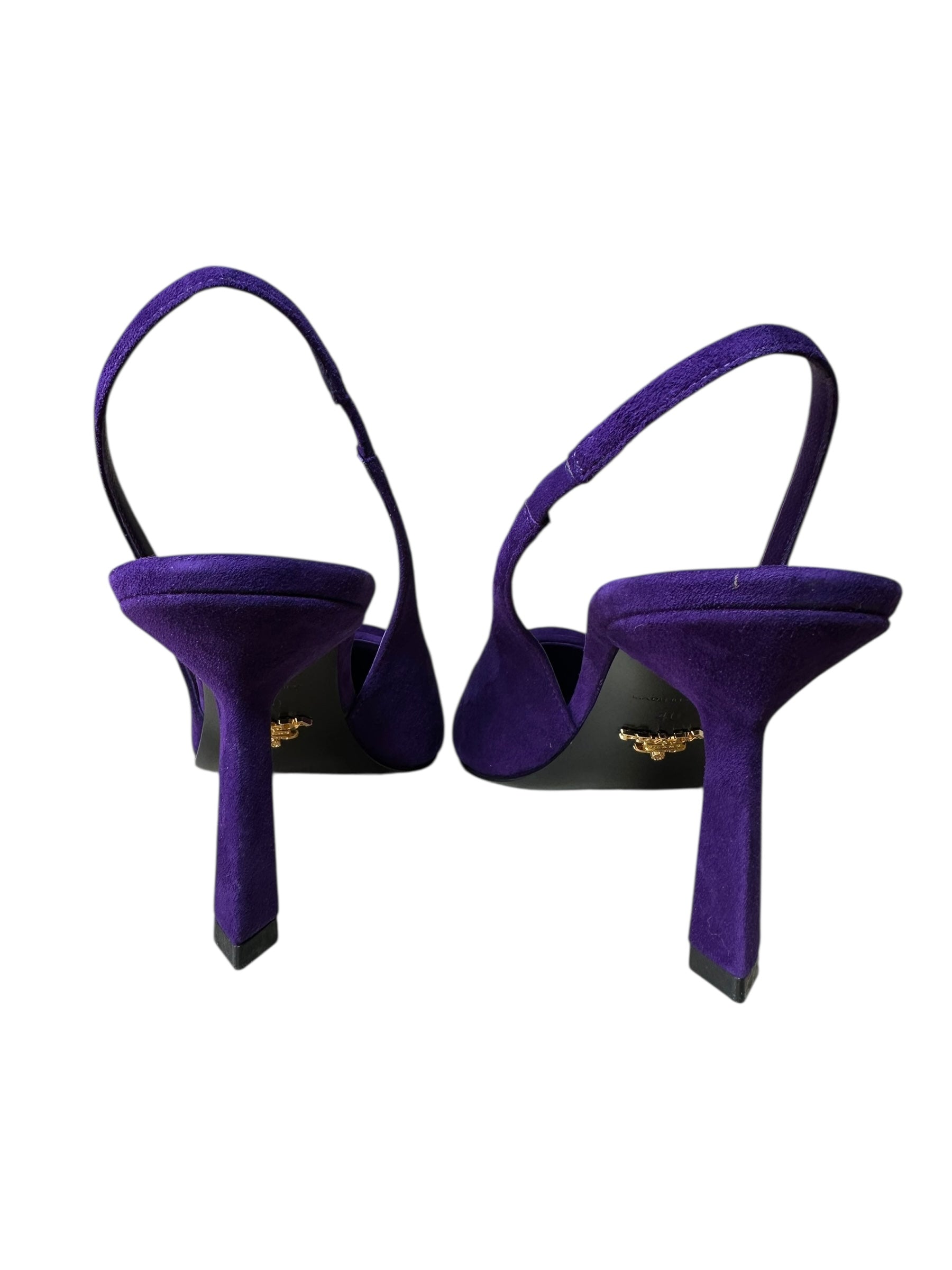 Décolleté slingback firmate Prada realizzate in pelle scamosciata viola, dal design elegante e affusolato.