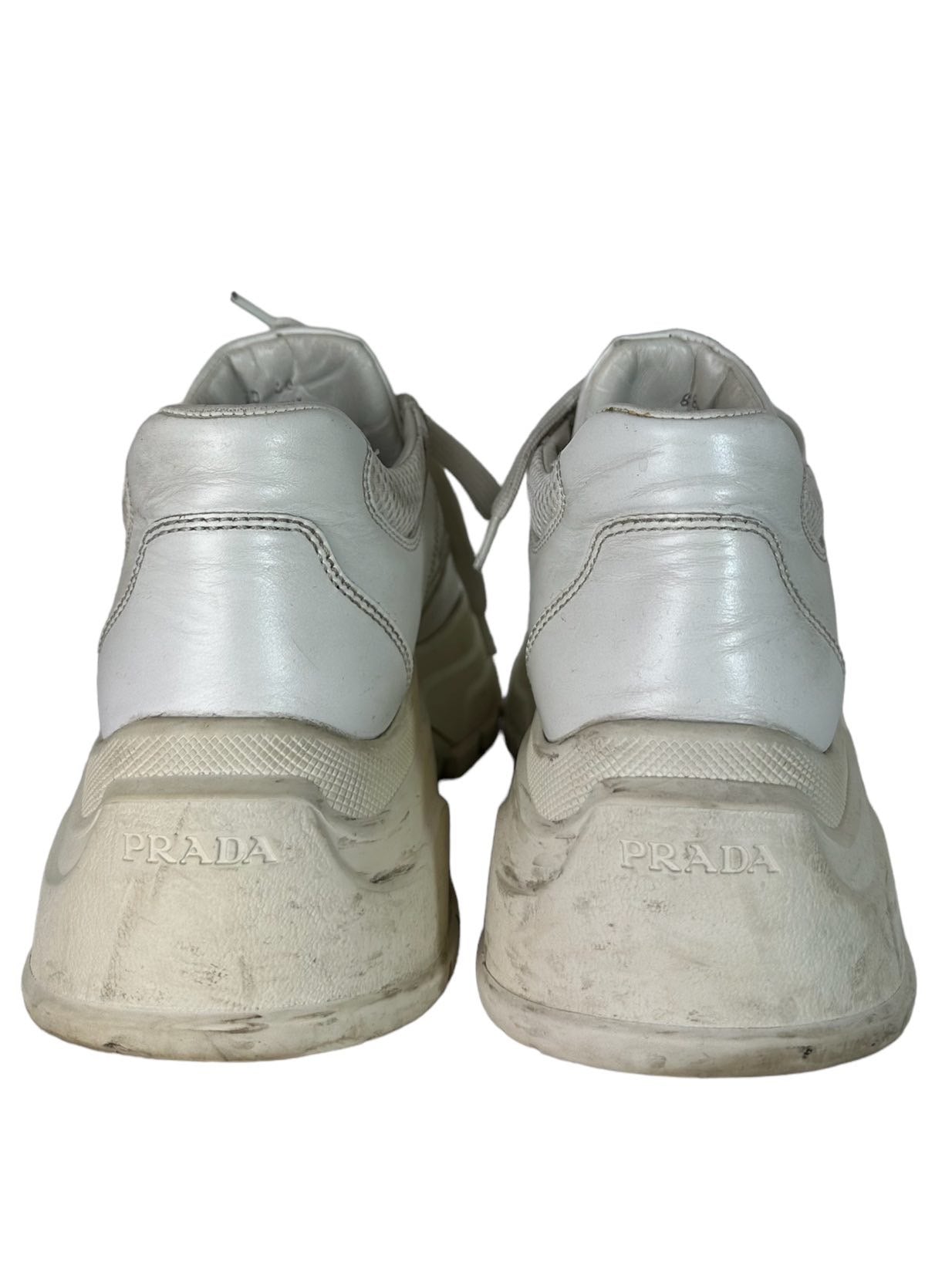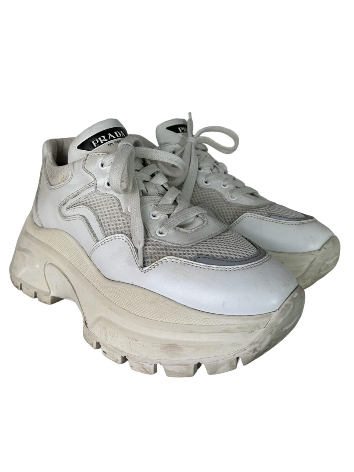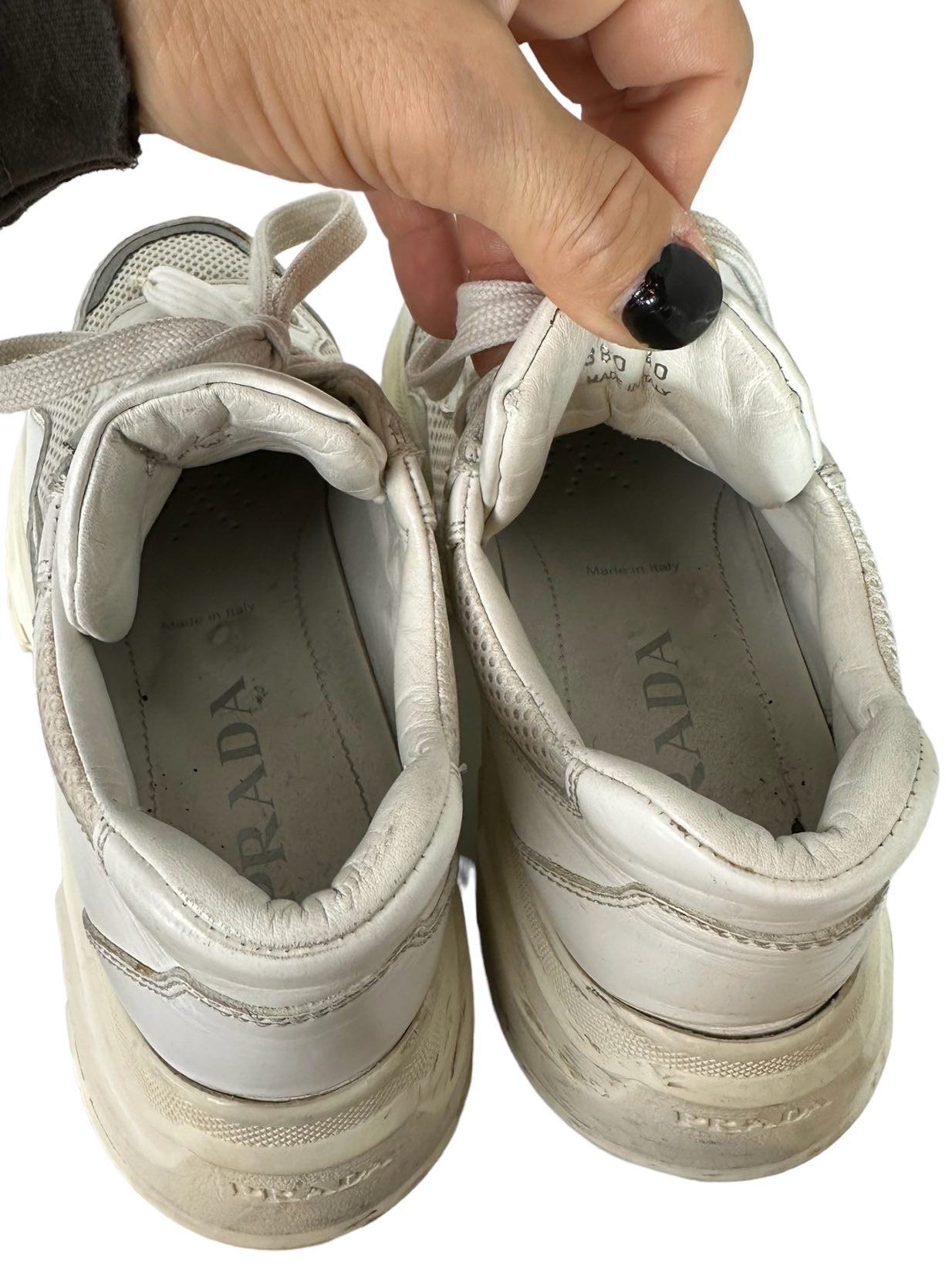 Prada sneakers stringata unisex in pelle e tela bianca con platform in gomma. Logo sul davanti. Presenta alcuni segni di usura visibili in foto. N 40 Buone condizioni. Non vengono spedite con scatola.