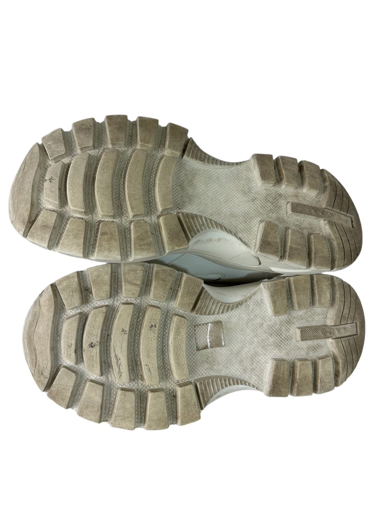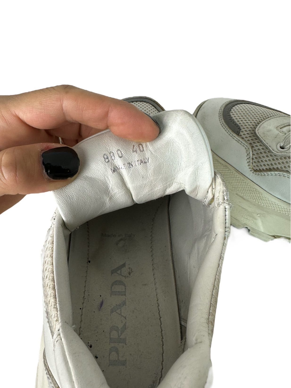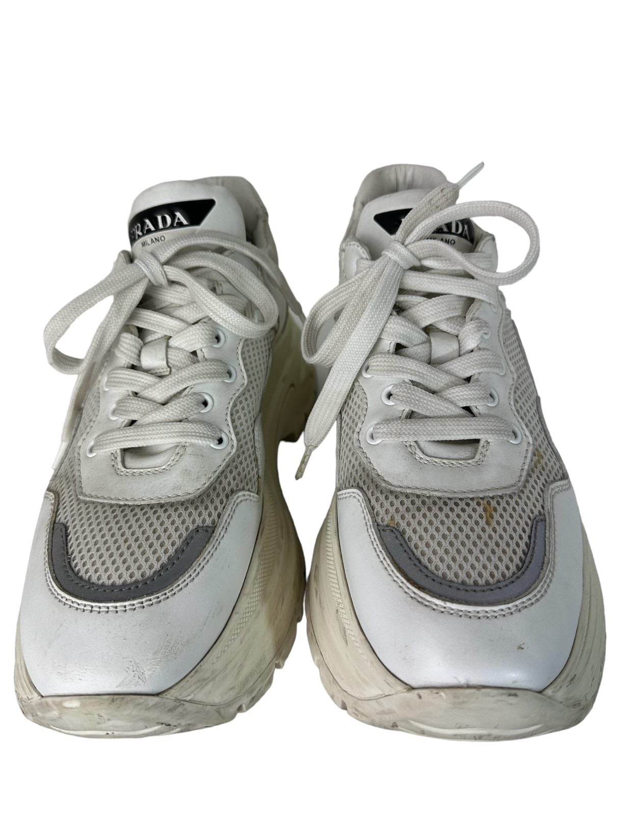 Prada sneakers stringata unisex in pelle e tela bianca con platform in gomma. Logo sul davanti. Presenta alcuni segni di usura visibili in foto. N 40 Buone condizioni. Non vengono spedite con scatola.