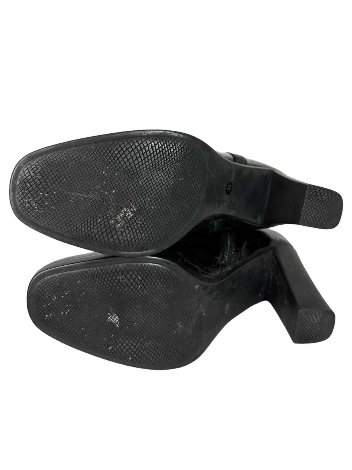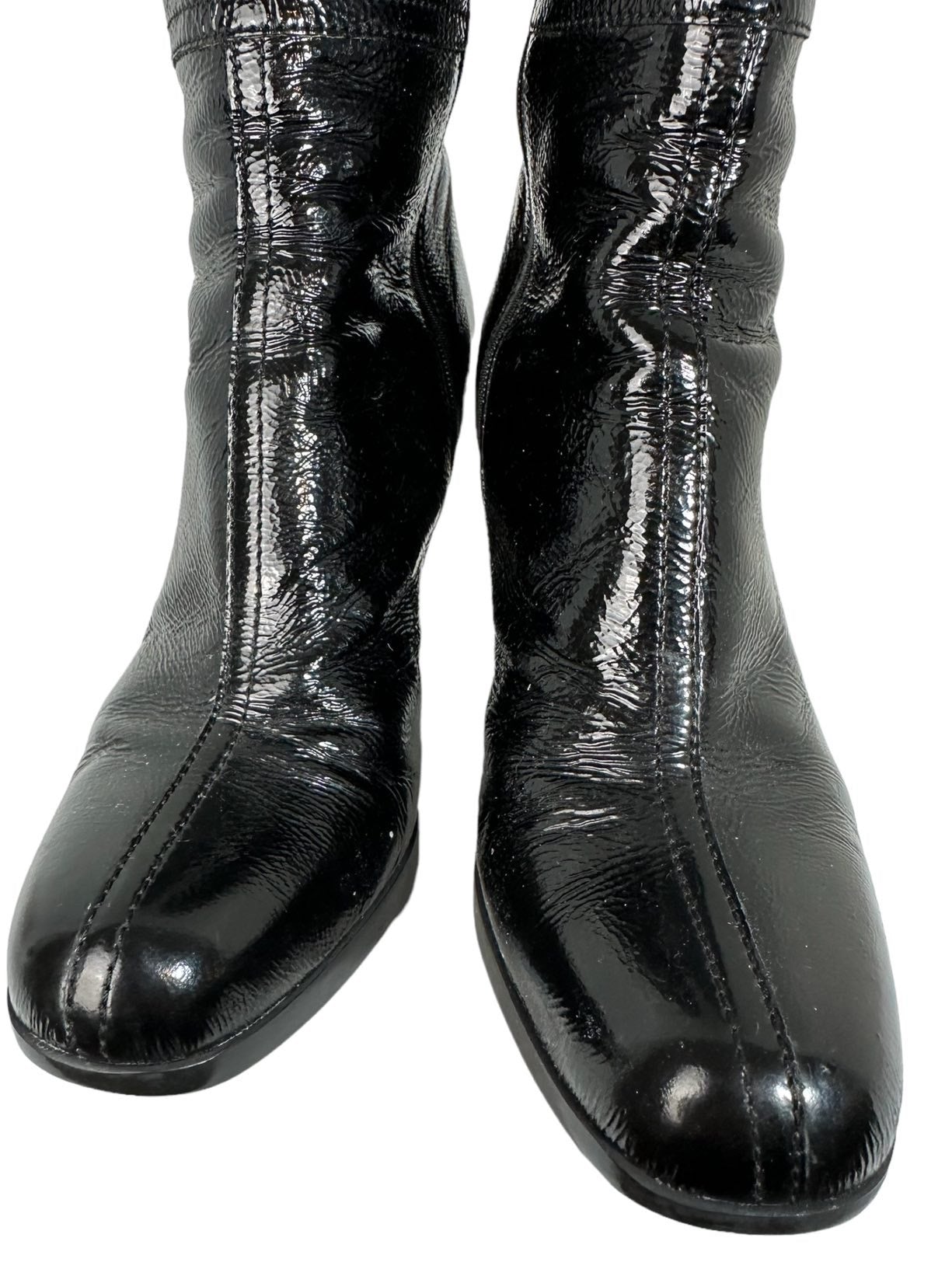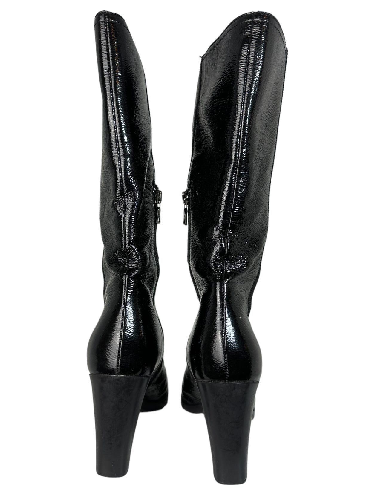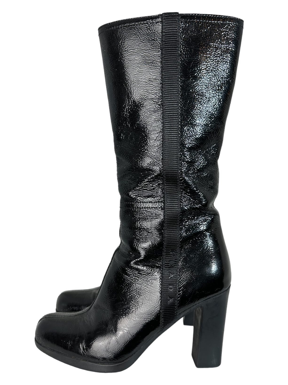 Prada stivali vintage in vernice nera con tacco quadrato in gomma, chiusura a zip sul lato. N. 35