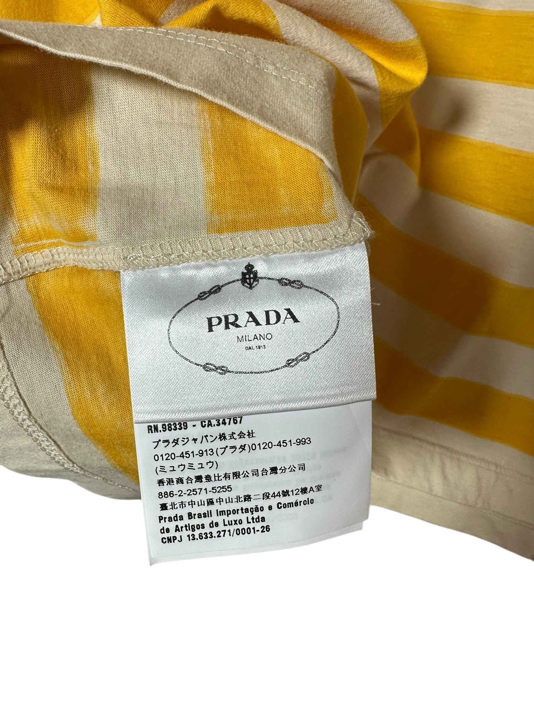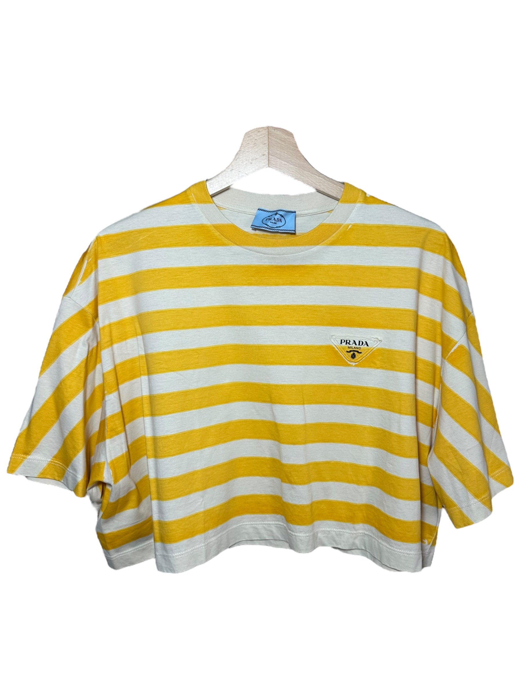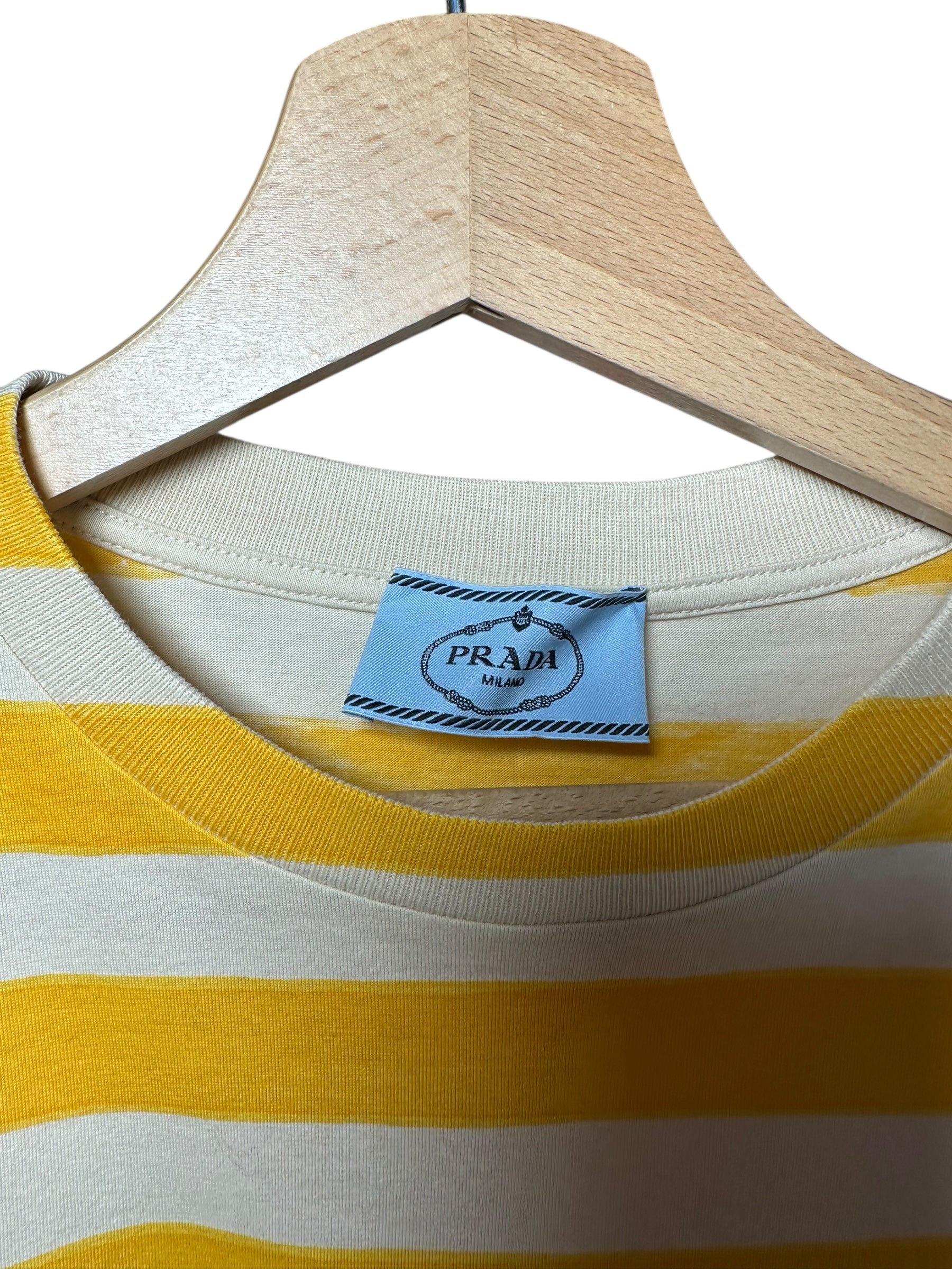 T-shirt crop firmata Prada, realizzata in morbido jersey di cotone 100%, con stampa a righe orizzontali nei toni giallo soleil e bianco panna. Il modello ha una vestibilità ampia e corta, con maniche a spalla scesa e girocollo rifinito in maglia a costine. Sul petto è applicato il classico logo triangolare in tessuto con scritta “PRADA Milano”, mentre all’interno è presente l’etichetta azzurra con cuciture nere. Le leggere sbiaditure sulle righe gialle sono parte integrante del design originale del capo.