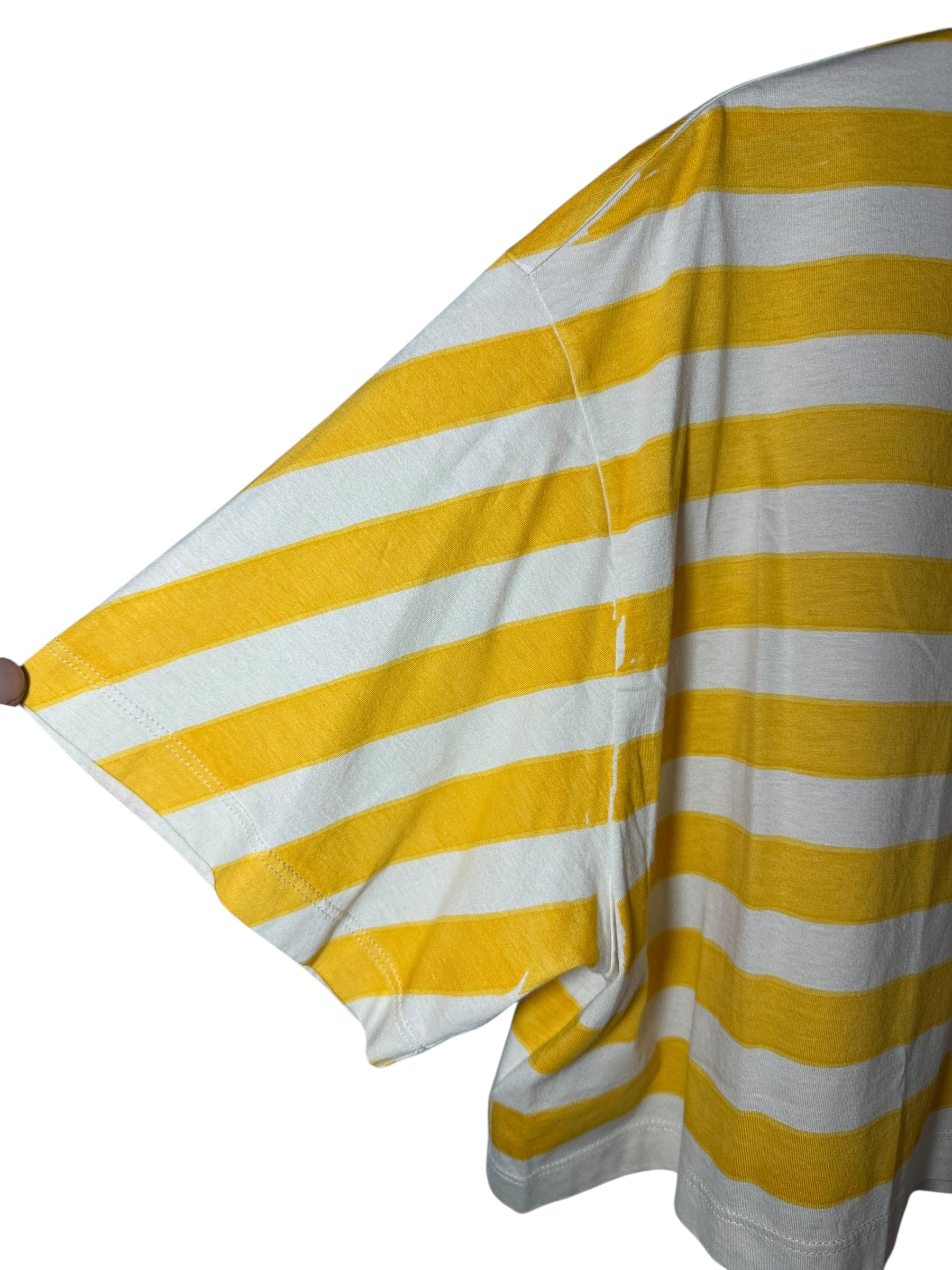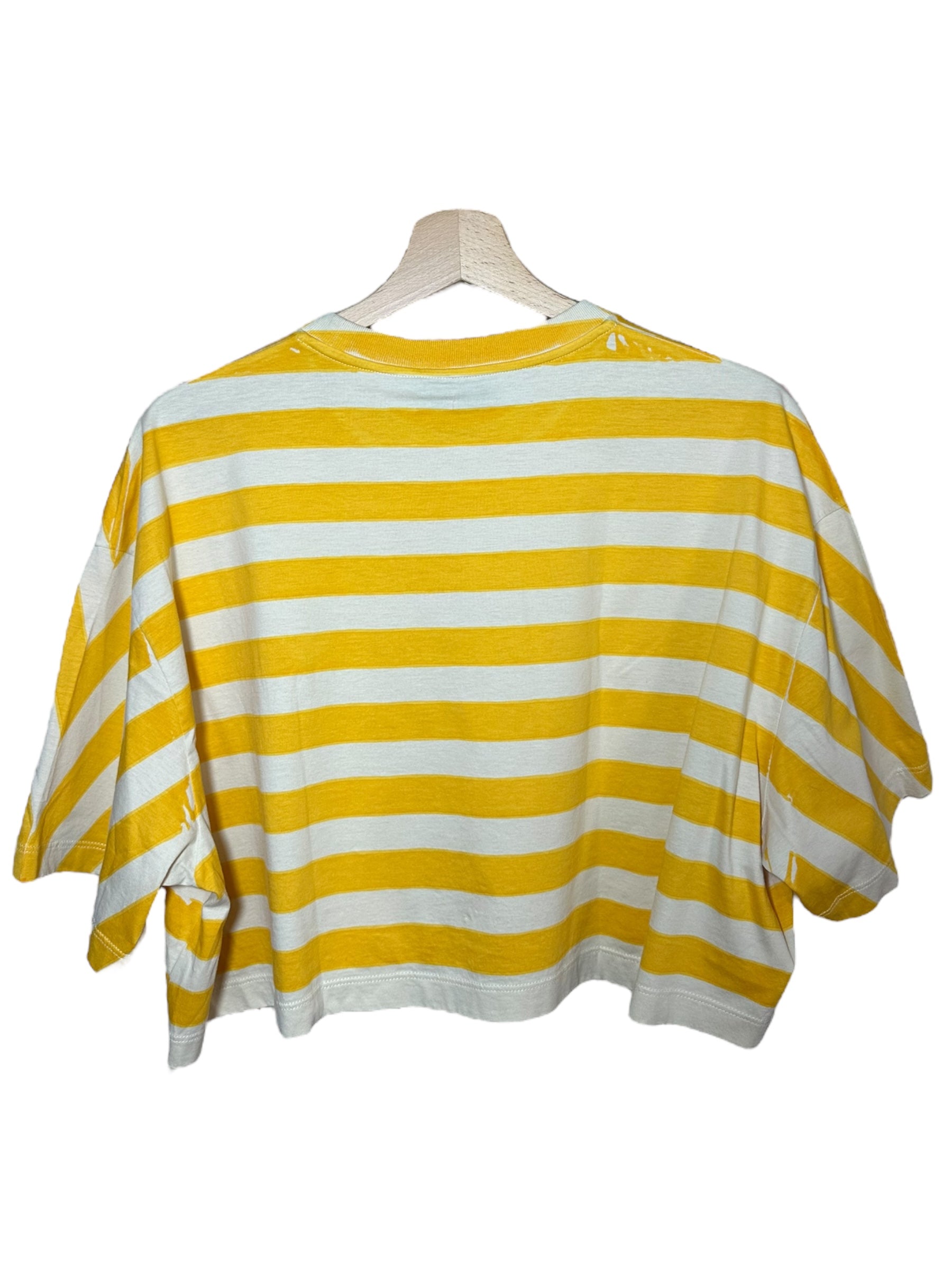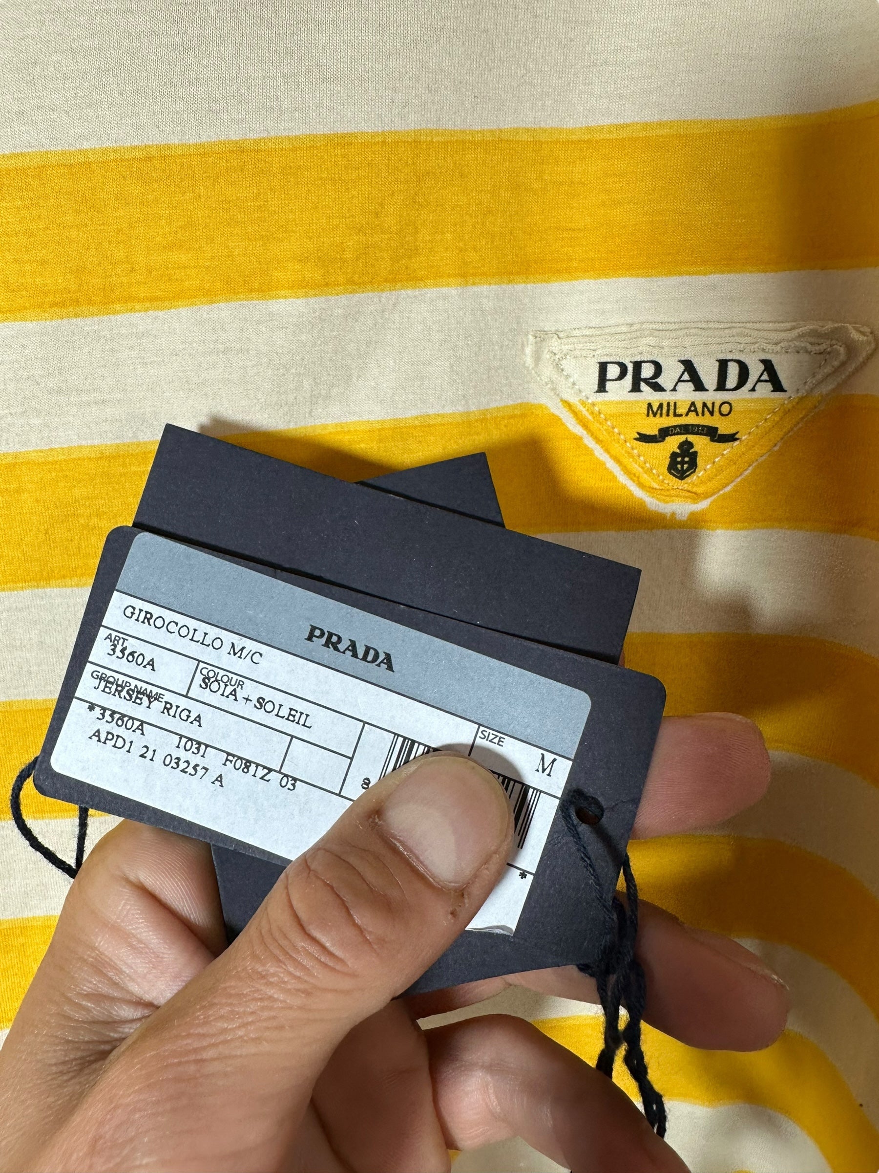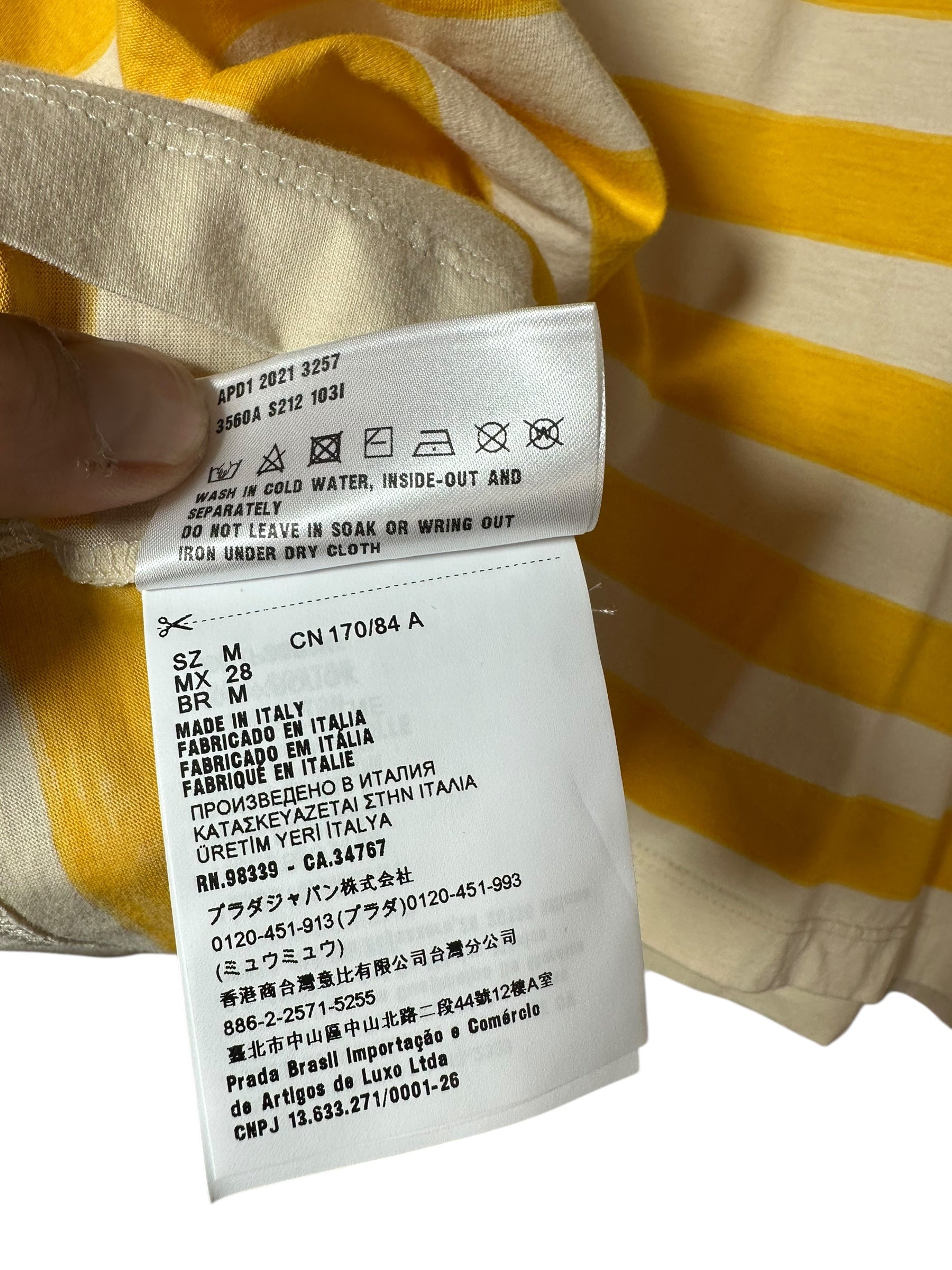 T-shirt crop firmata Prada, realizzata in morbido jersey di cotone 100%, con stampa a righe orizzontali nei toni giallo soleil e bianco panna. Il modello ha una vestibilità ampia e corta, con maniche a spalla scesa e girocollo rifinito in maglia a costine. Sul petto è applicato il classico logo triangolare in tessuto con scritta “PRADA Milano”, mentre all’interno è presente l’etichetta azzurra con cuciture nere. Le leggere sbiaditure sulle righe gialle sono parte integrante del design originale del capo.