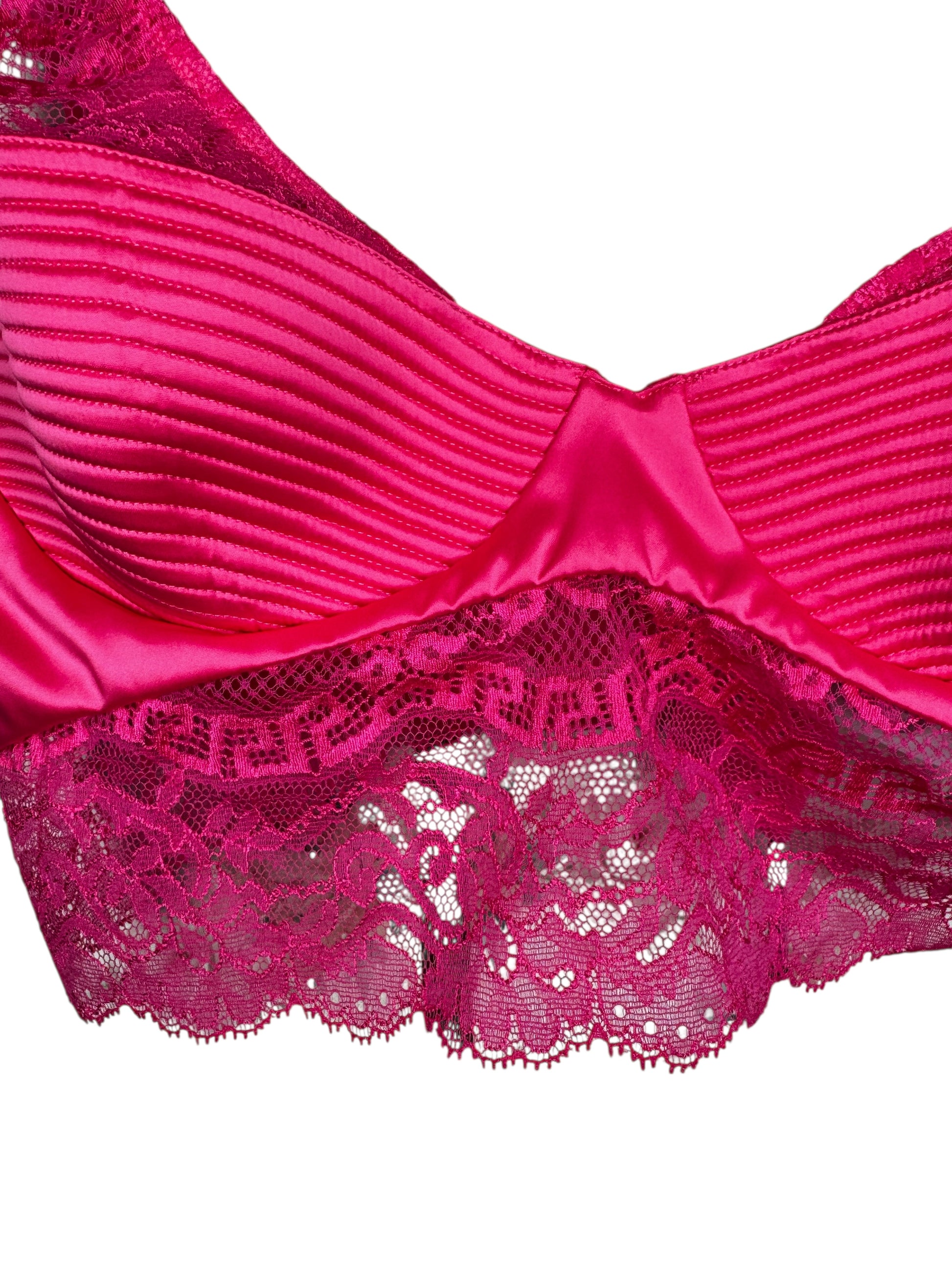 Reggiseno Versace in pizzo e raso color fucsia, nuovo con etichette. Realizzato in Italia con materiali di alta qualità, presenta coppe strutturate in raso e pizzo con motivo Greca. Modello elegante, ideale come lingerie di lusso.