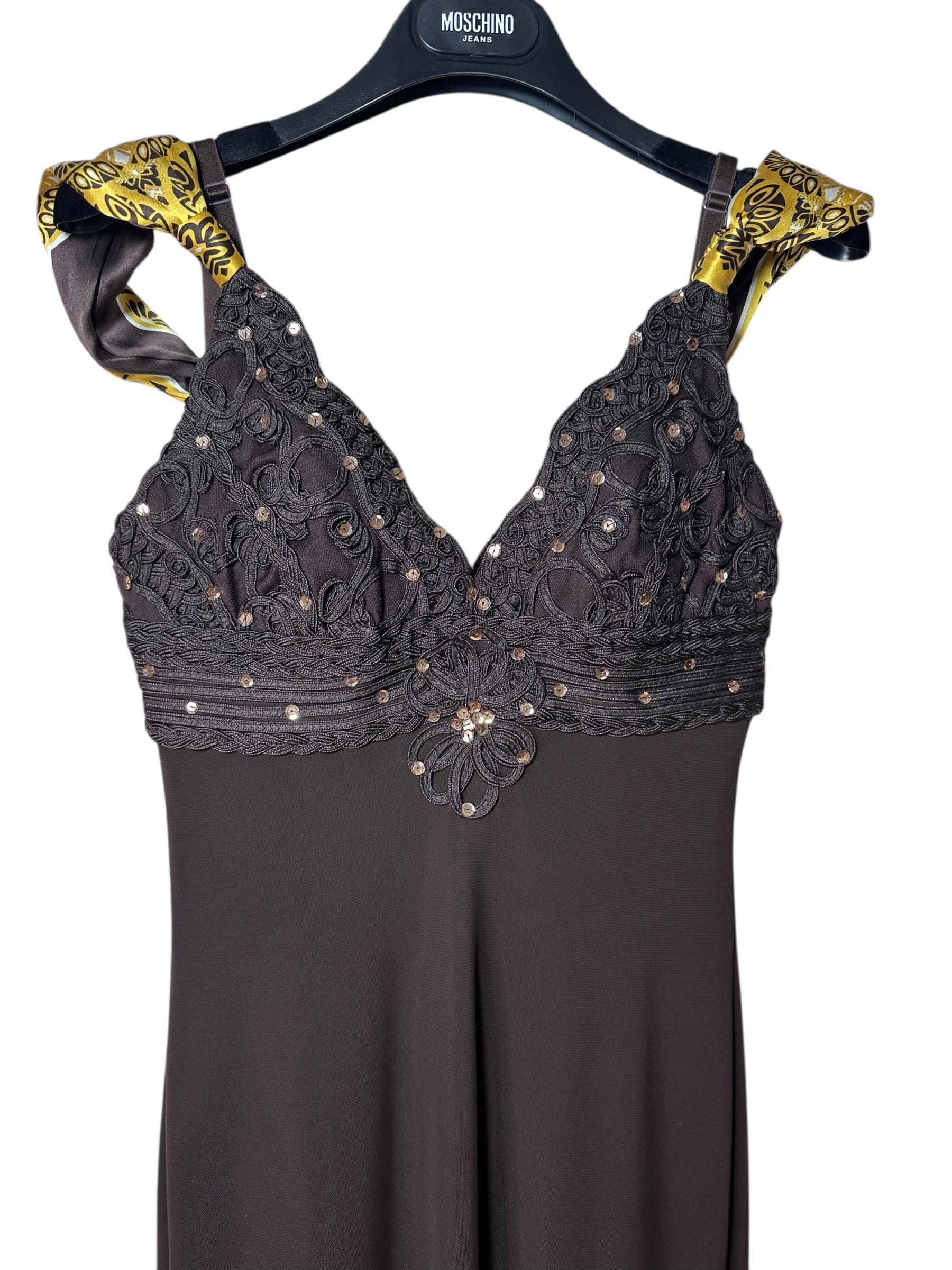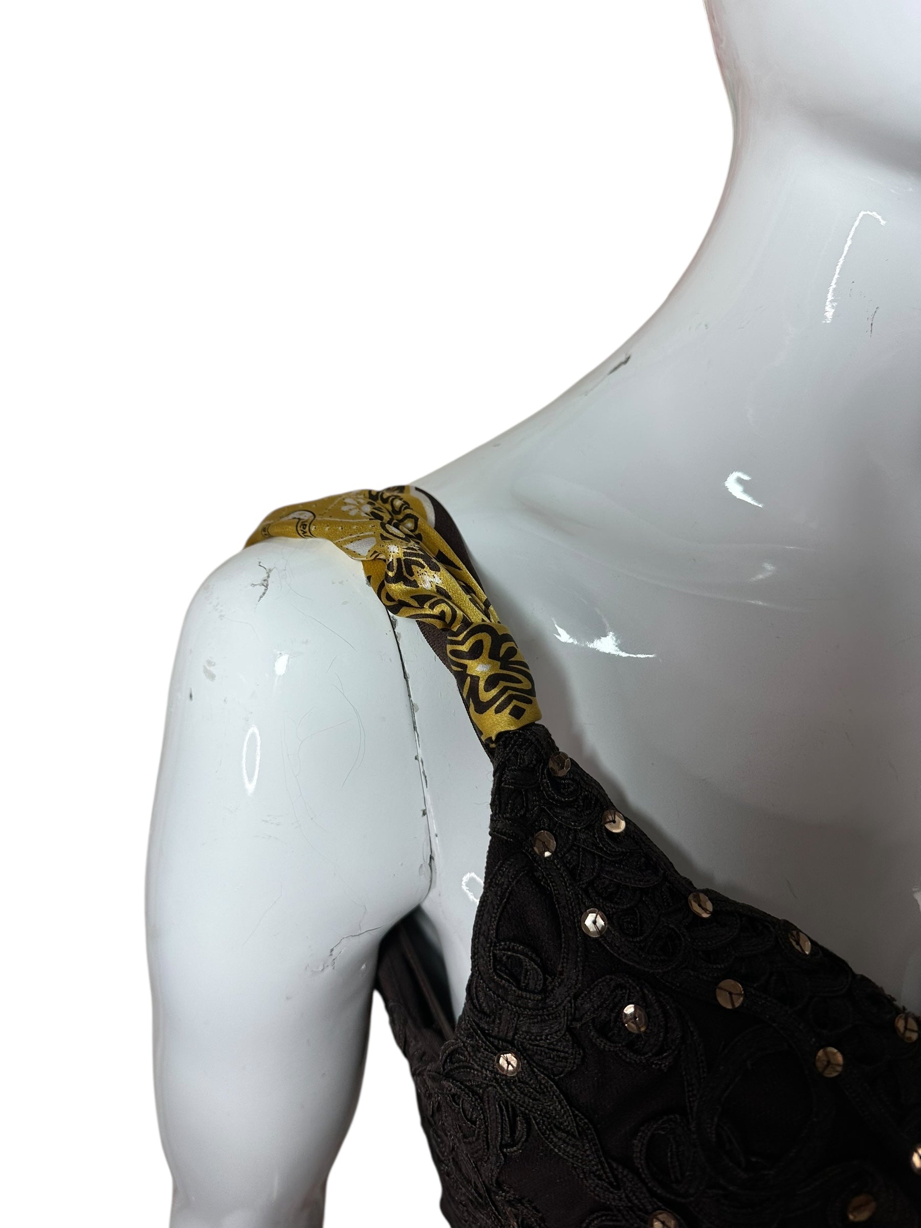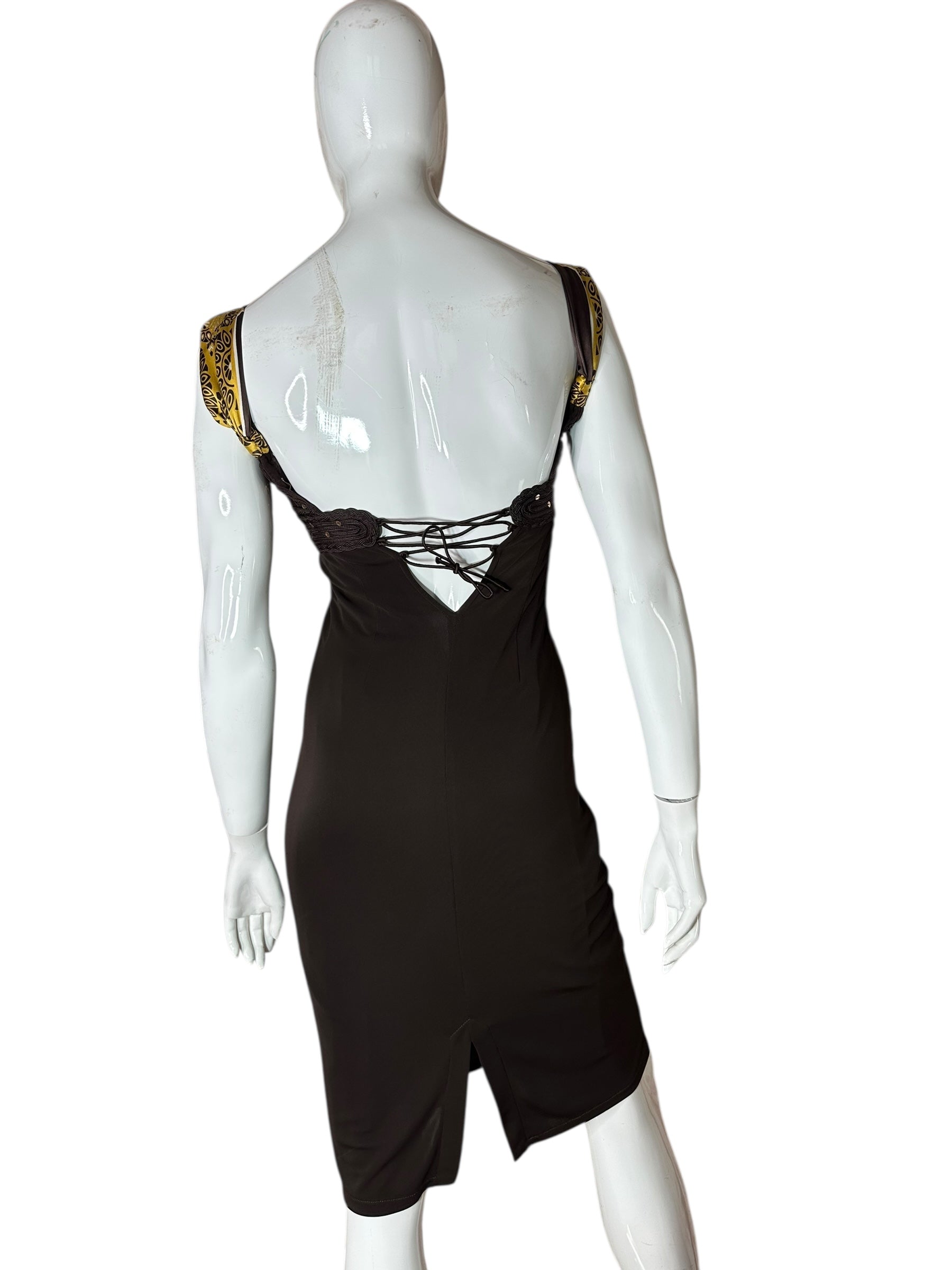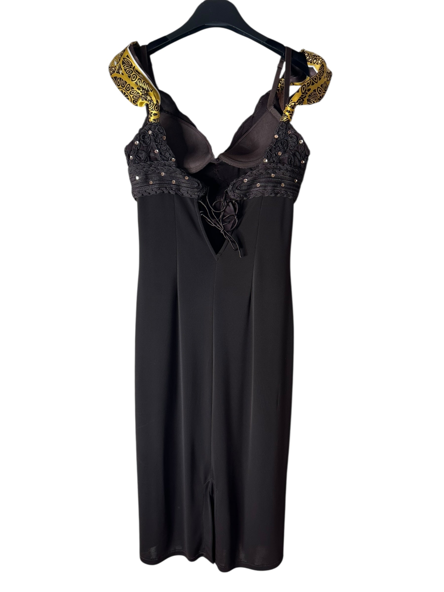 Abito vintage firmato Roberto Cavalli, caratterizzato da un elegante design a tubino con scollo a cuore e spalline annodate in seta stampata con motivo bandana nei toni del giallo e nero. Il corpetto è interamente ricamato con passamanerie intrecciate e piccoli strass neri, mentre la parte posteriore presenta un’allacciatura con laccetti incrociati su schiena scoperta a V. Il tessuto è un jersey stretch con sottoveste incorporata, che garantisce una vestibilità aderente e confortevole. L’etichetta di composizione è stata tagliata, ma il tessuto principale risulta elasticizzato e la seta delle spalline è visivamente e al tatto riconoscibile. Sul retro è presente uno spacco centrale.