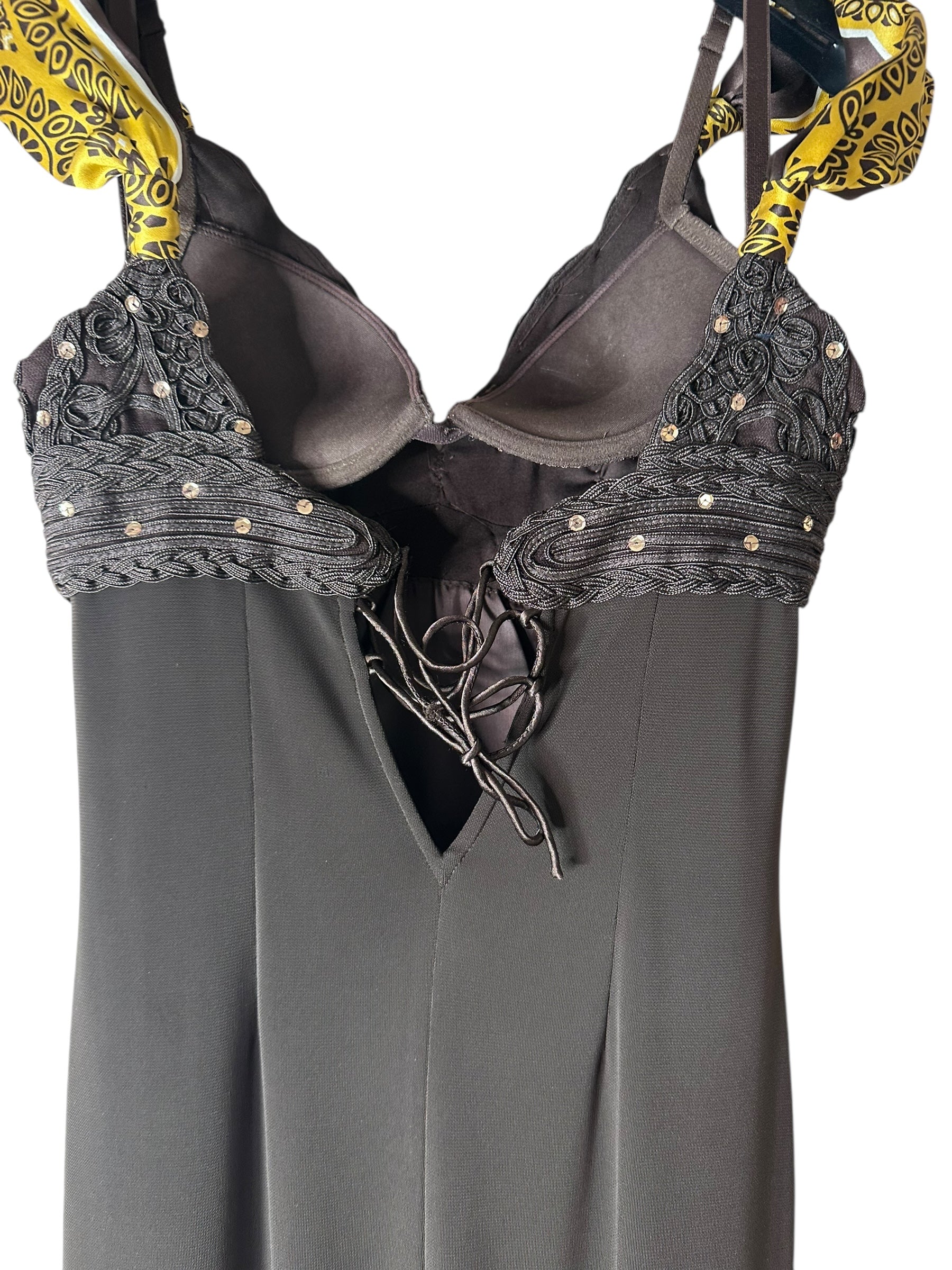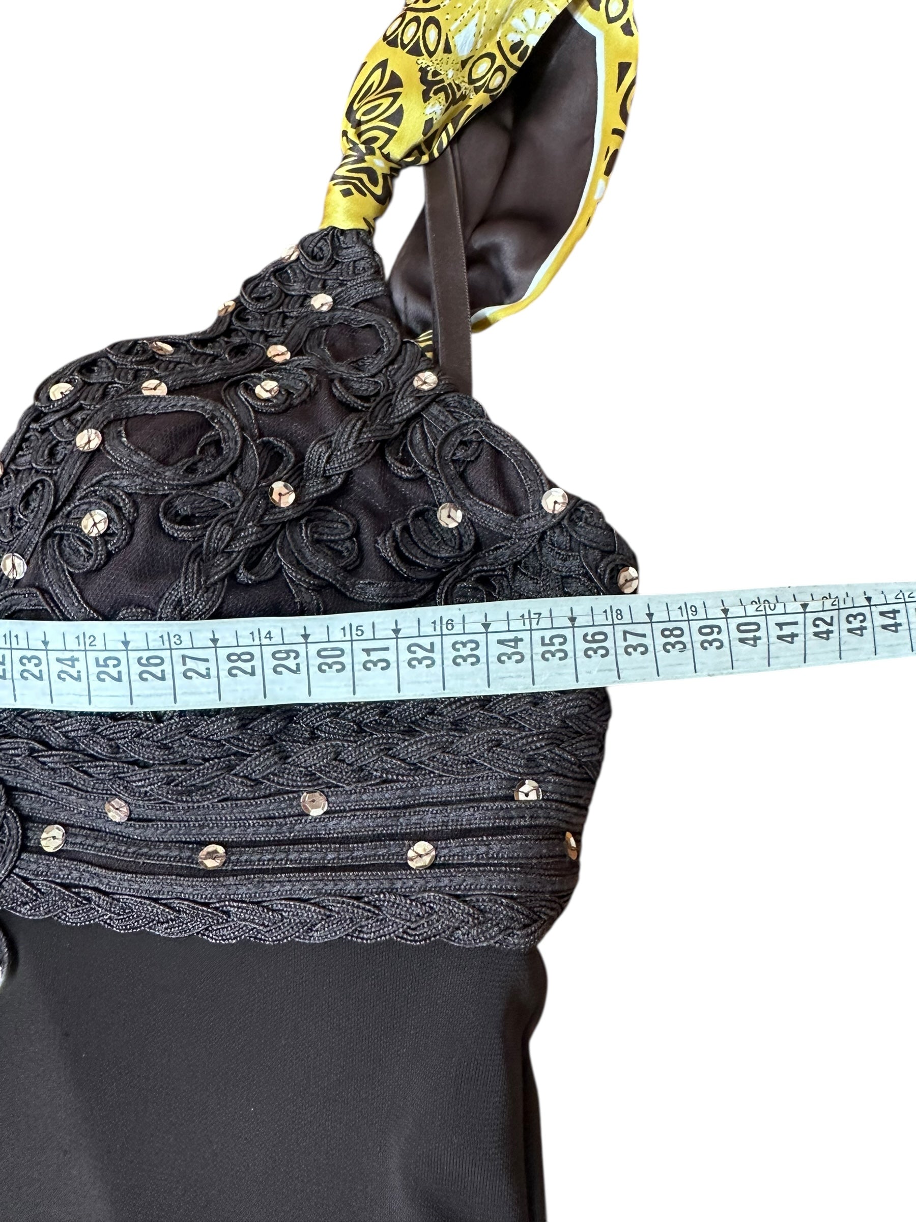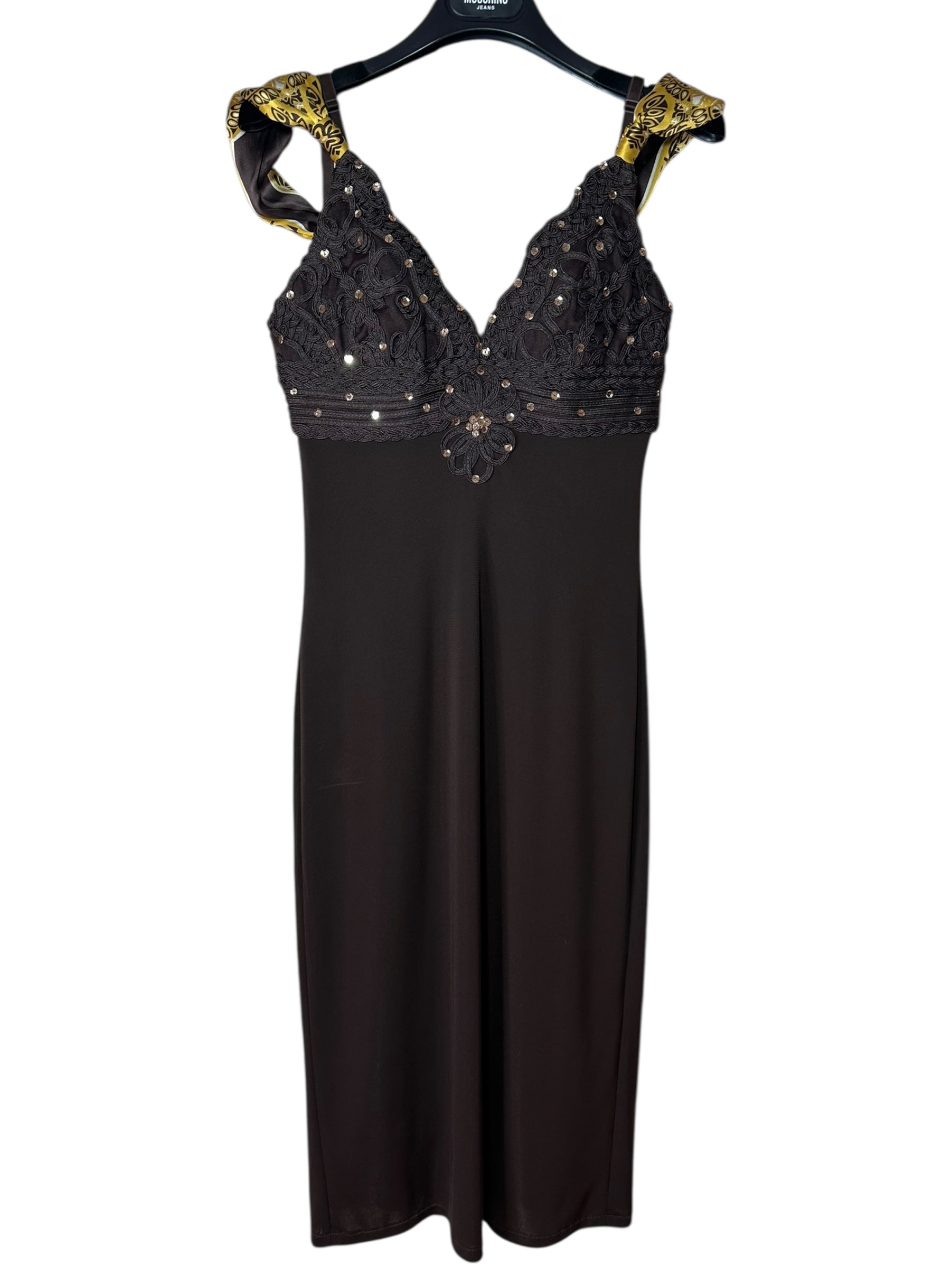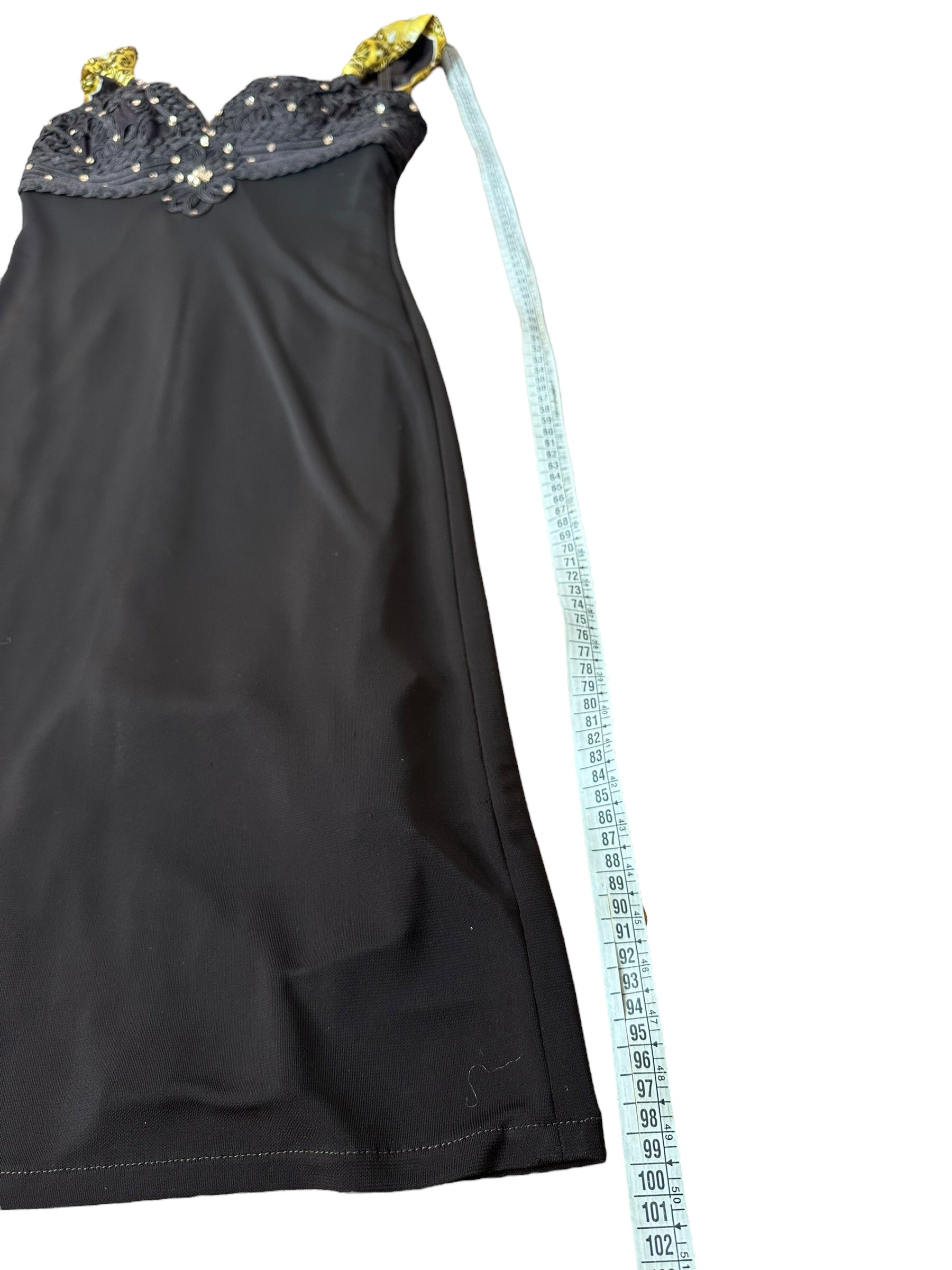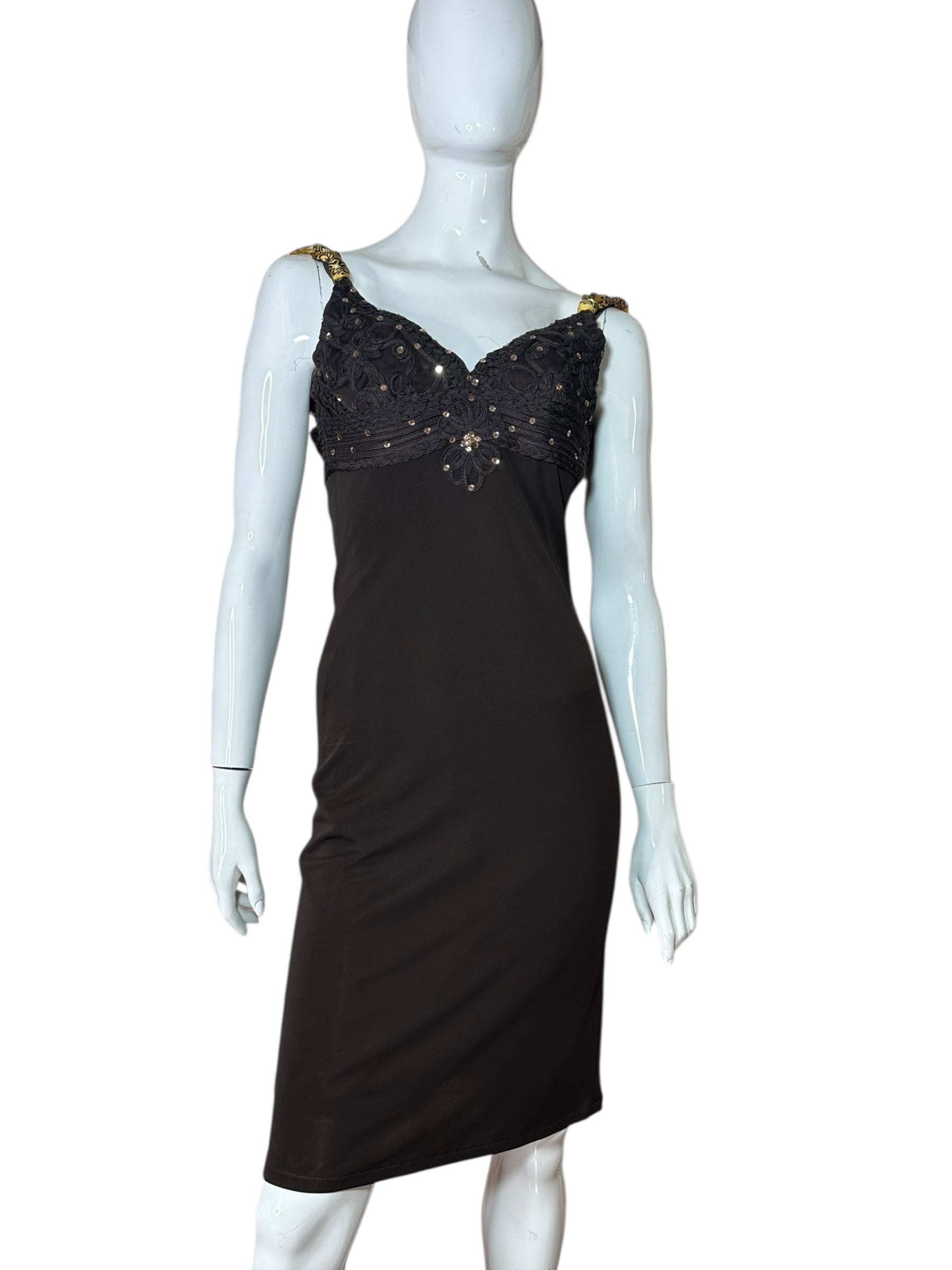 Abito vintage firmato Roberto Cavalli, caratterizzato da un elegante design a tubino con scollo a cuore e spalline annodate in seta stampata con motivo bandana nei toni del giallo e nero. Il corpetto è interamente ricamato con passamanerie intrecciate e piccoli strass neri, mentre la parte posteriore presenta un’allacciatura con laccetti incrociati su schiena scoperta a V. Il tessuto è un jersey stretch con sottoveste incorporata, che garantisce una vestibilità aderente e confortevole. L’etichetta di composizione è stata tagliata, ma il tessuto principale risulta elasticizzato e la seta delle spalline è visivamente e al tatto riconoscibile. Sul retro è presente uno spacco centrale.