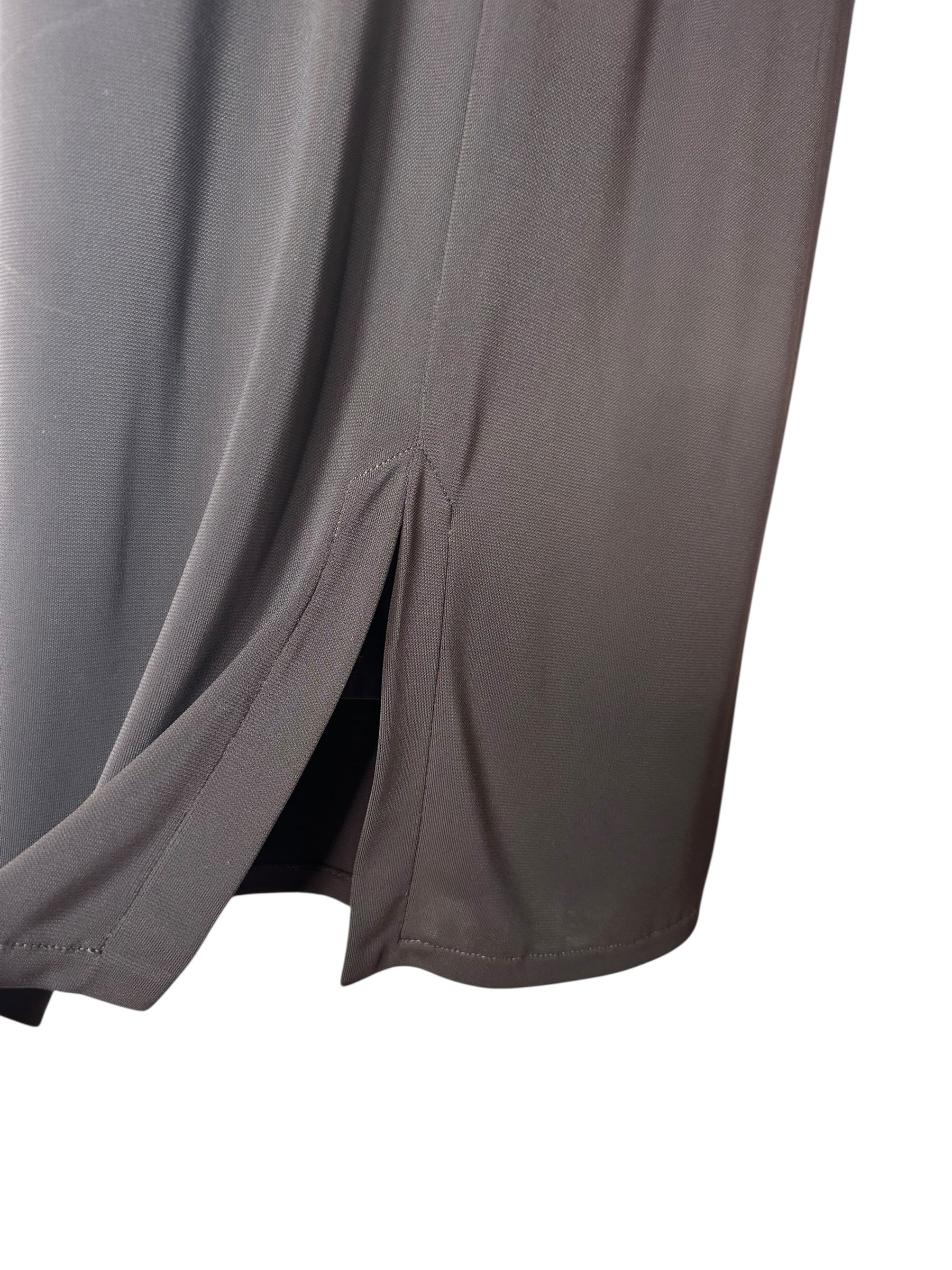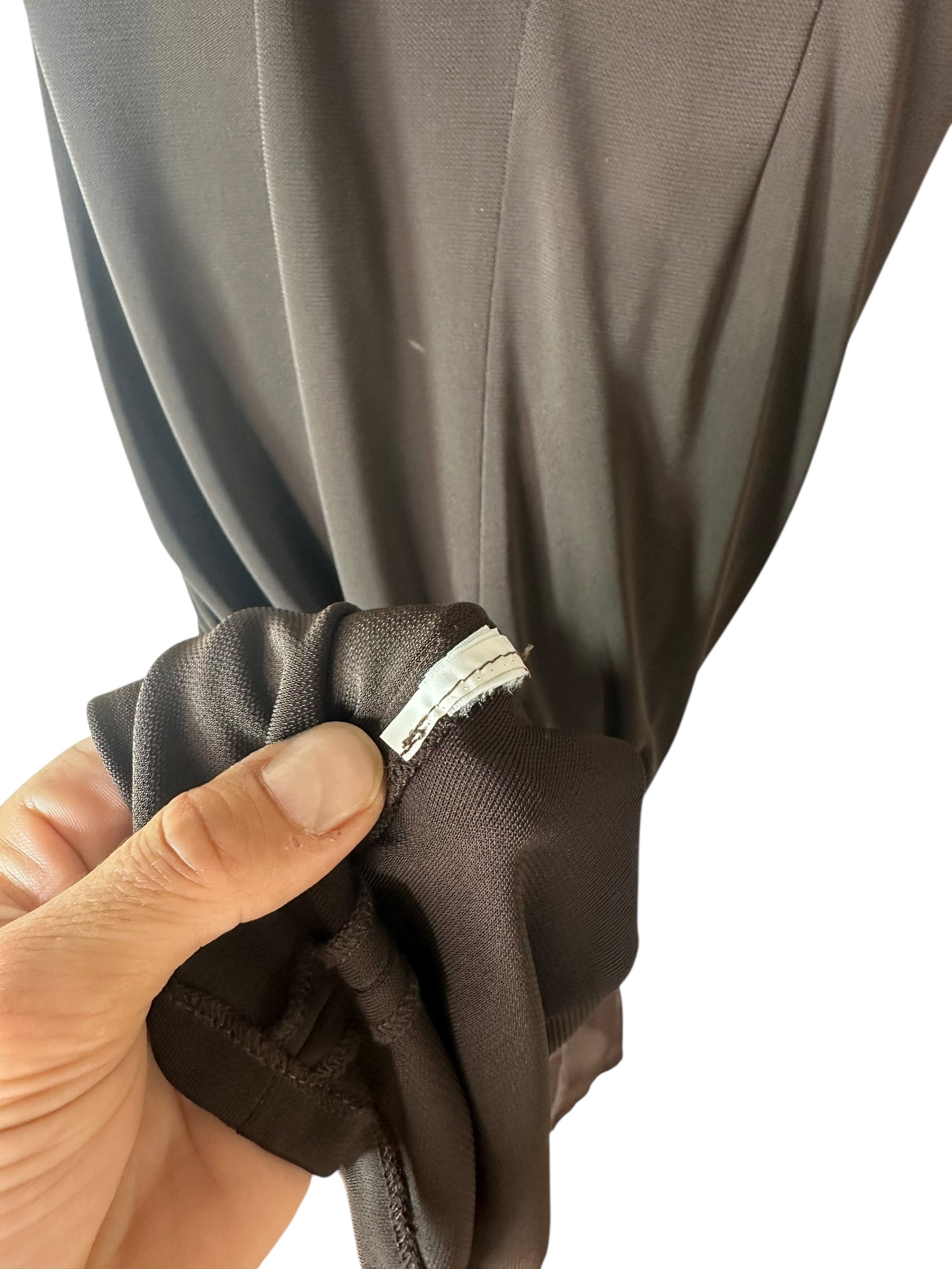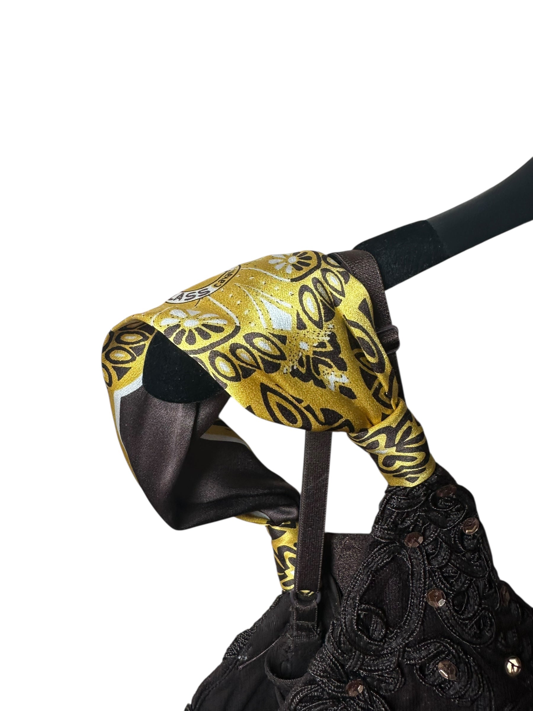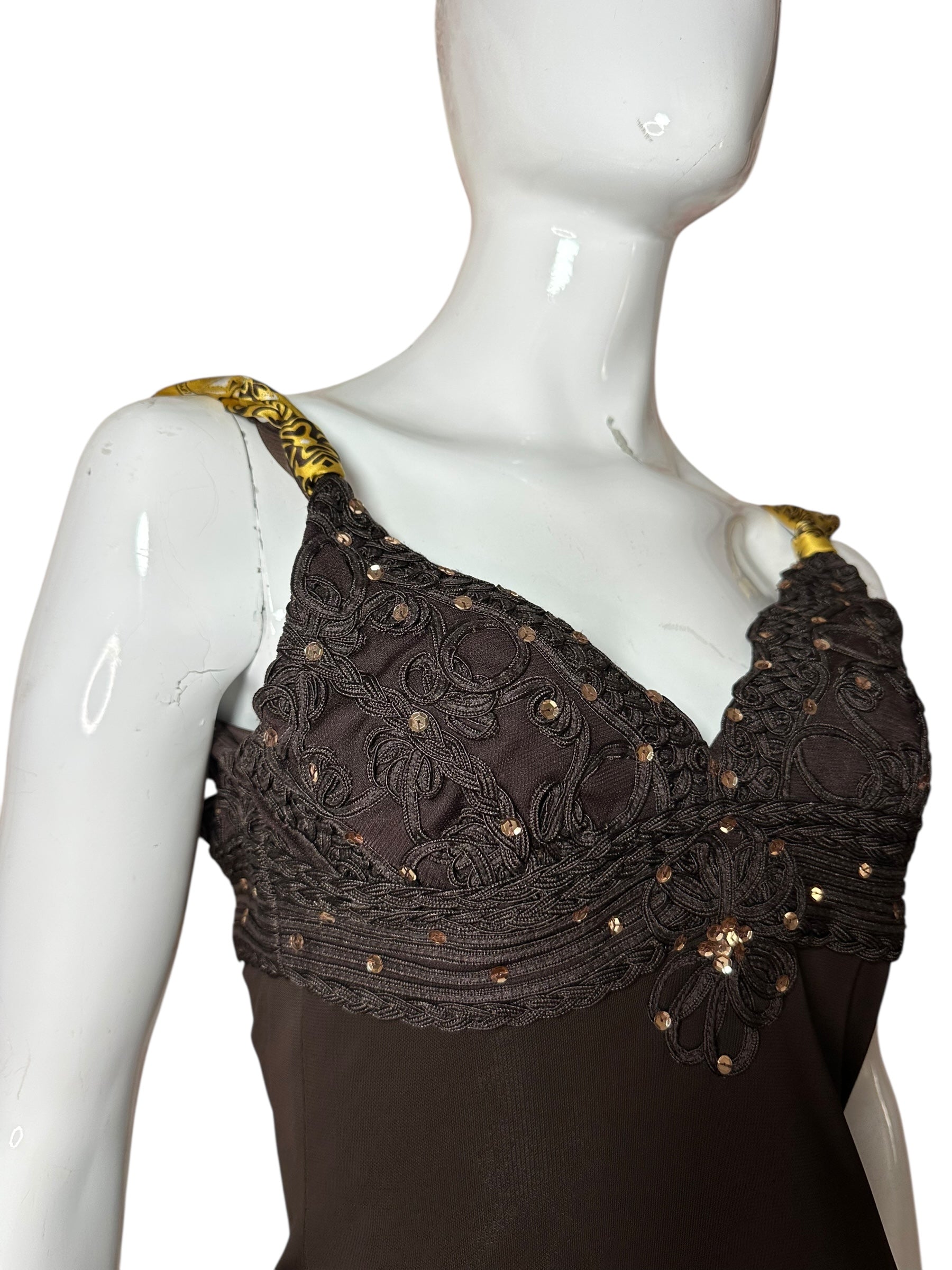 Abito vintage firmato Roberto Cavalli, caratterizzato da un elegante design a tubino con scollo a cuore e spalline annodate in seta stampata con motivo bandana nei toni del giallo e nero. Il corpetto è interamente ricamato con passamanerie intrecciate e piccoli strass neri, mentre la parte posteriore presenta un’allacciatura con laccetti incrociati su schiena scoperta a V. Il tessuto è un jersey stretch con sottoveste incorporata, che garantisce una vestibilità aderente e confortevole. L’etichetta di composizione è stata tagliata, ma il tessuto principale risulta elasticizzato e la seta delle spalline è visivamente e al tatto riconoscibile. Sul retro è presente uno spacco centrale.