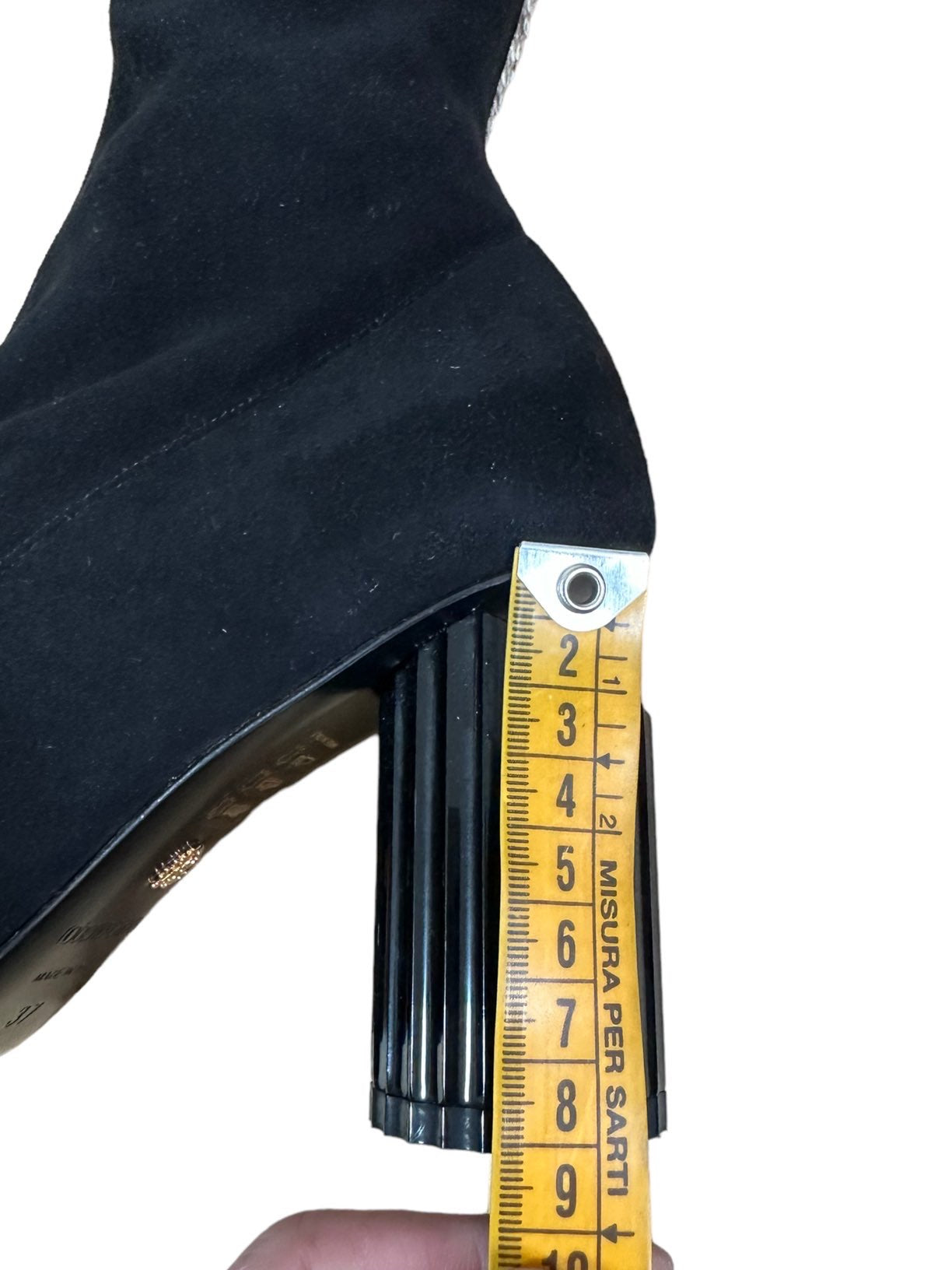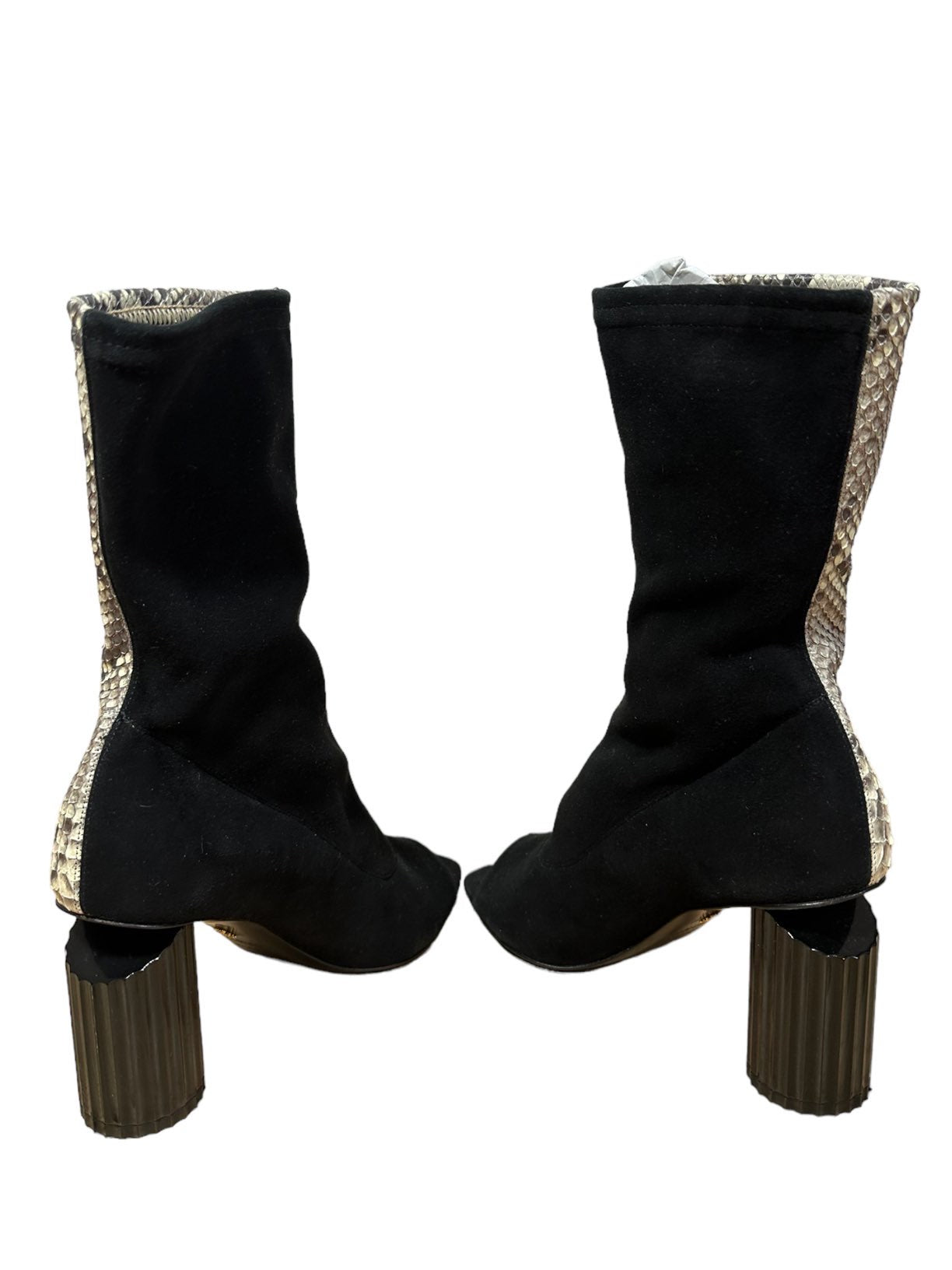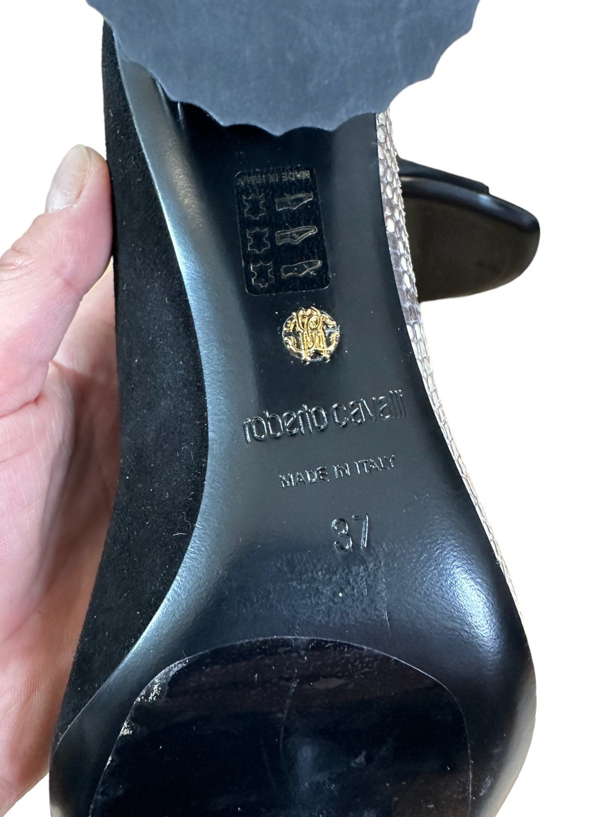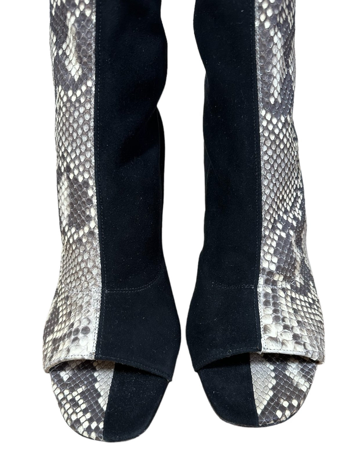 Roberto Cavalli stivali in camoscio e rettile elasticizzato con punta scoperta e tacco cilindrico lavorato. N.37 Articolo di seconda mano, non vengono spediti con scatola.