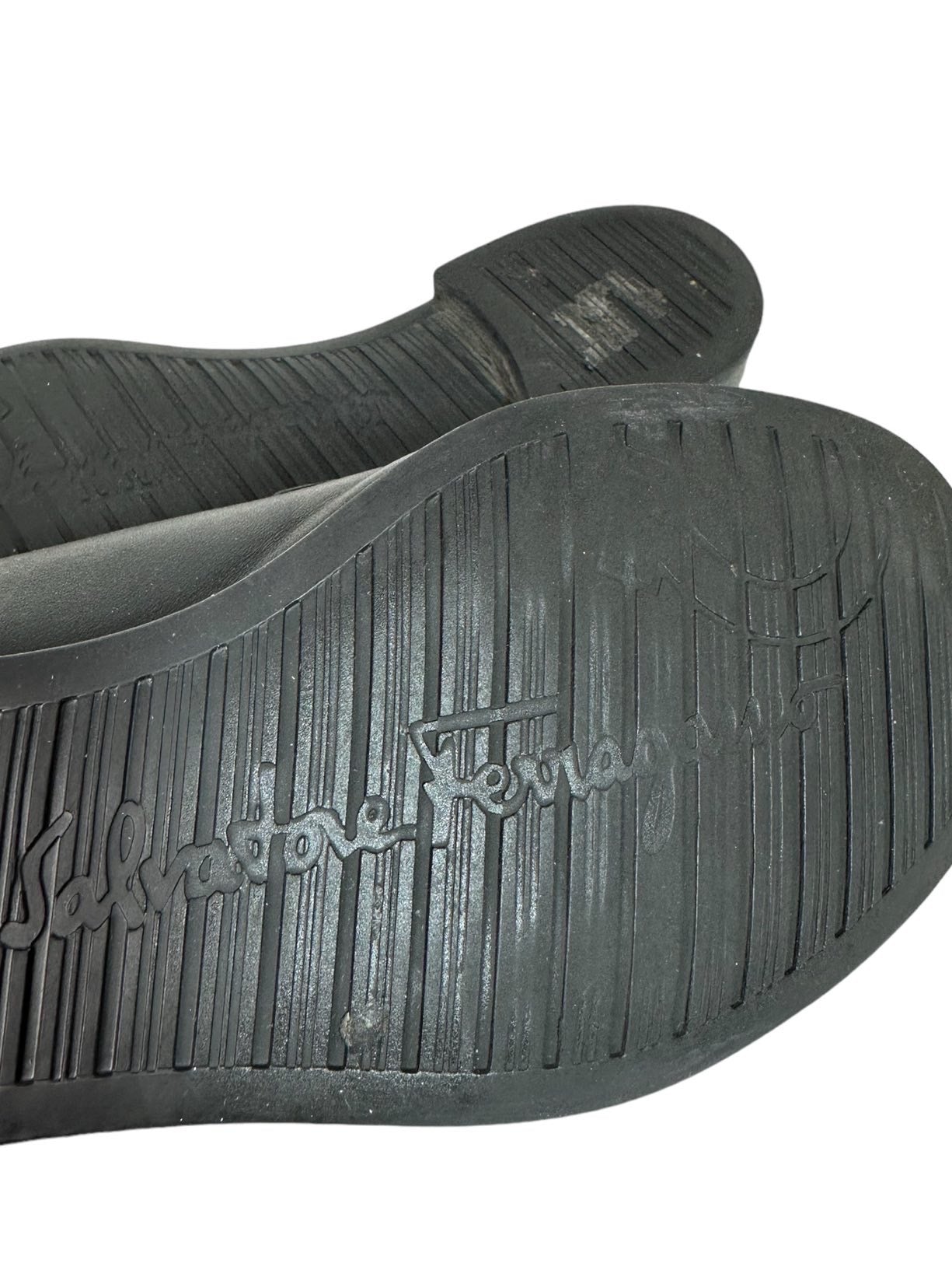 Salvatore Ferragamo mocassino donna in pelle nera con inserto a logo in metallo sul davanti. Lievi segni di usura all’altezza di un tallone. N 6.5 (38.5)