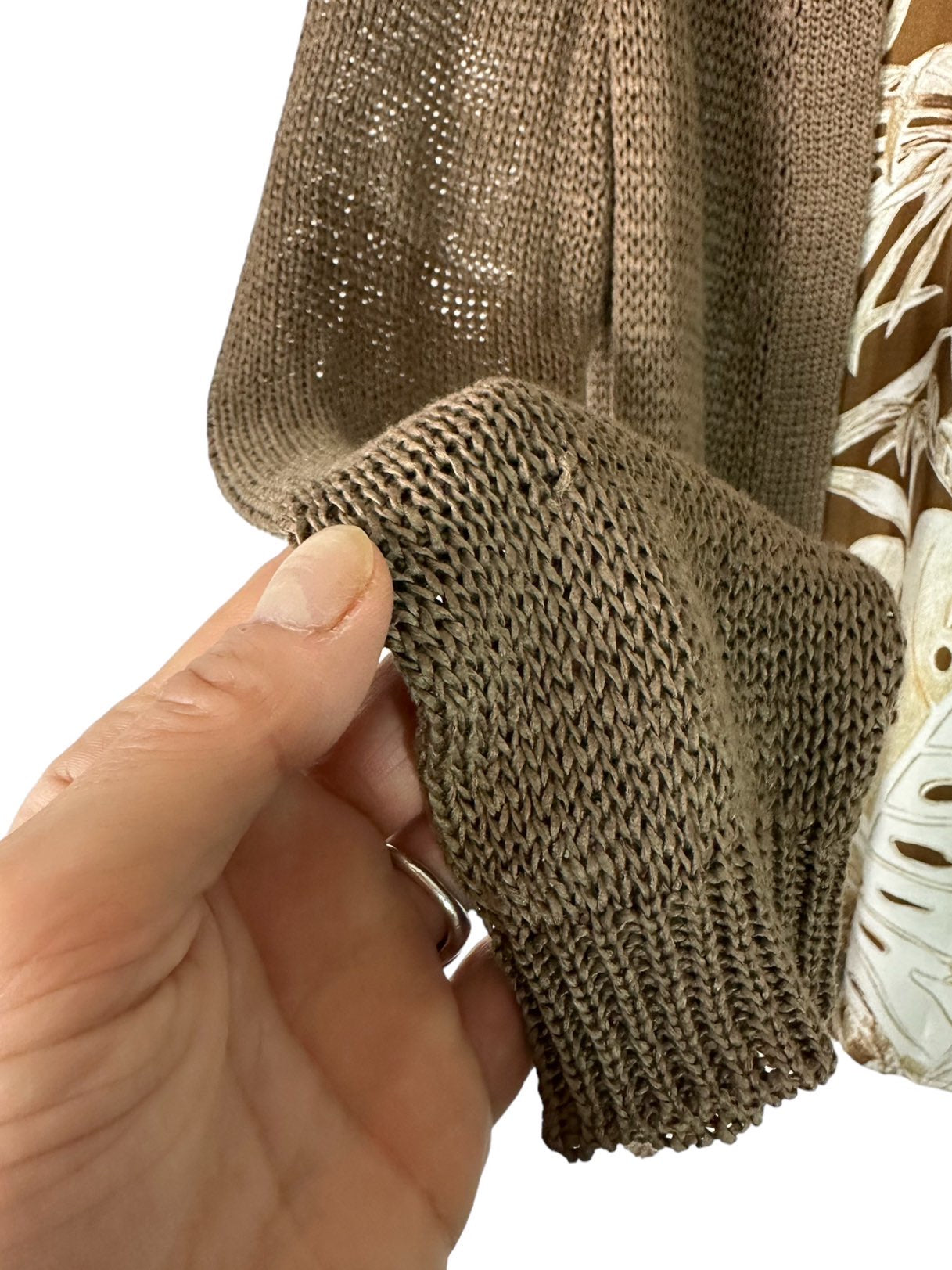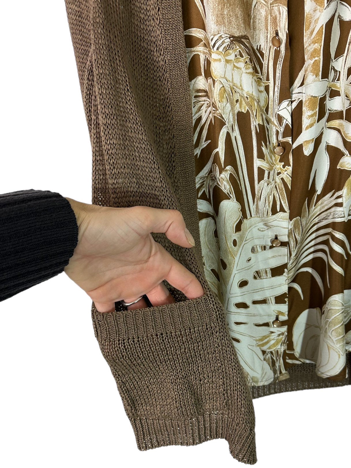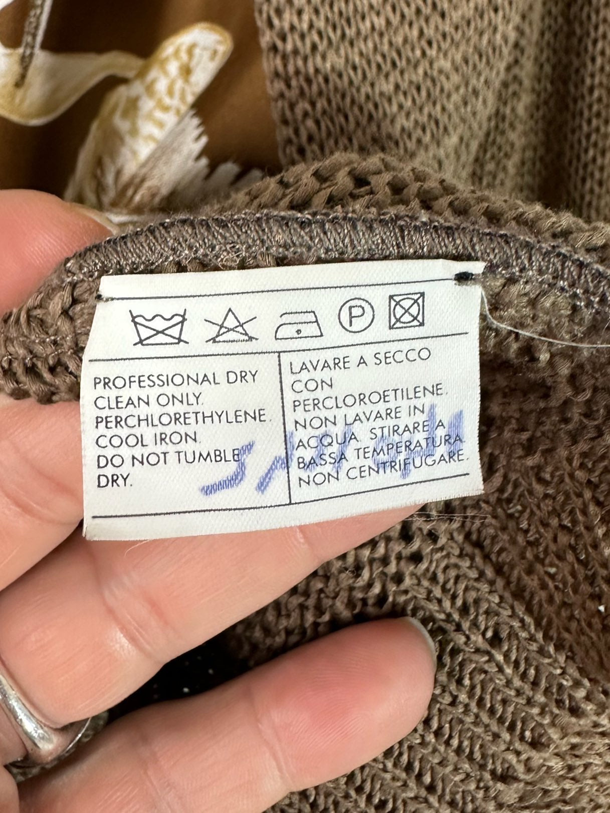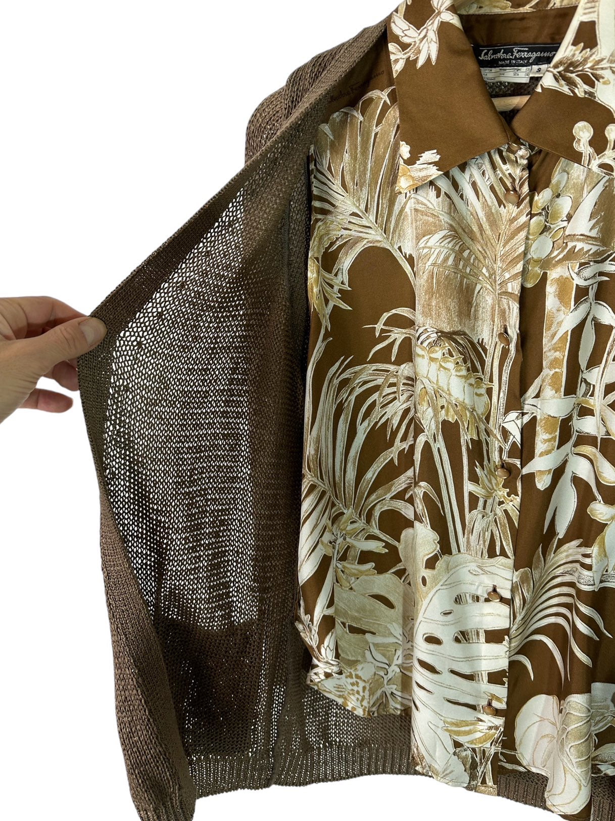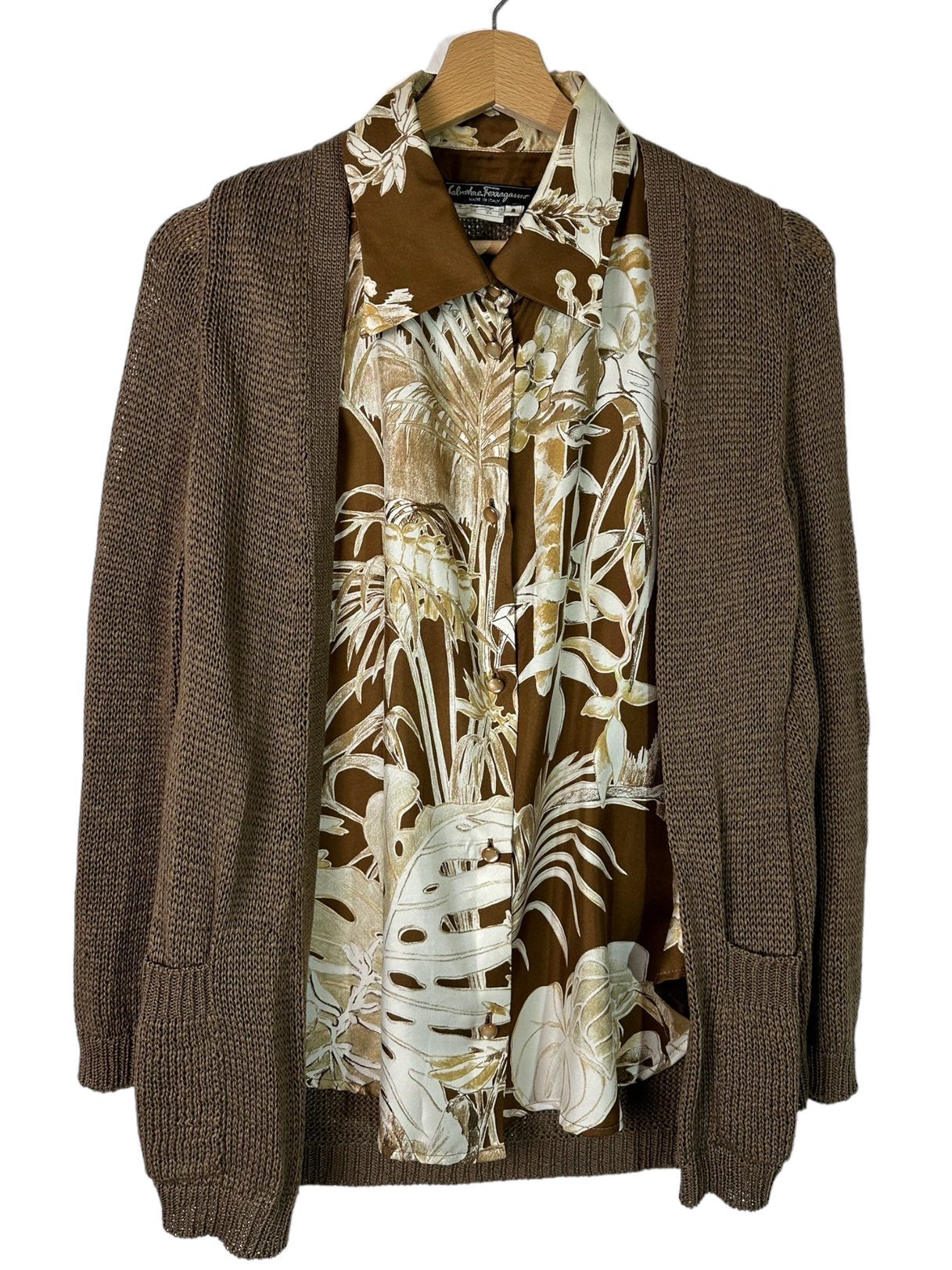 Salvatore Ferragamo set vintage composta da camicia smanicata in seta stampata cucita sotto un cardigan di N cotone color nocciola con tasche laterali. Tg .S