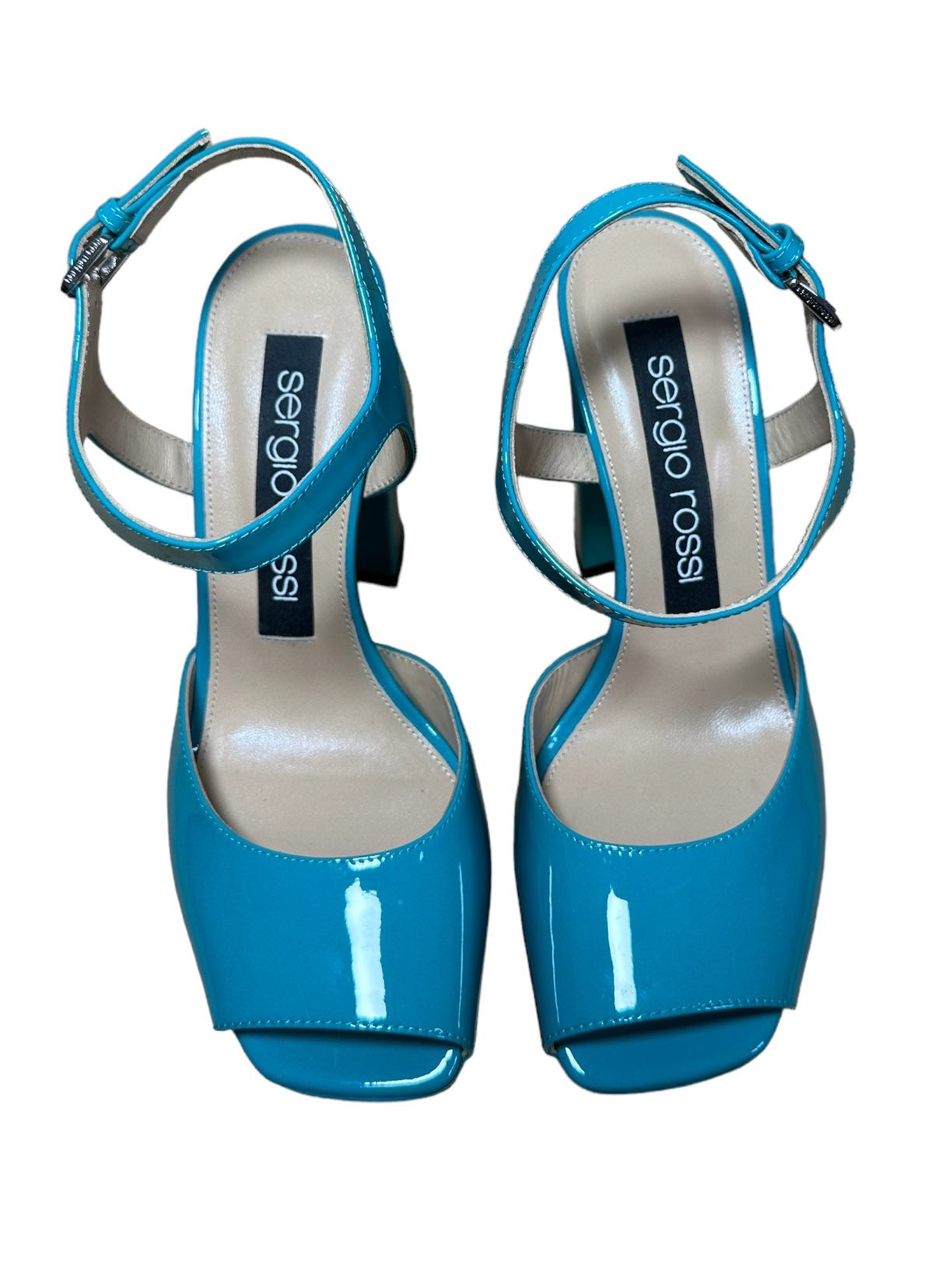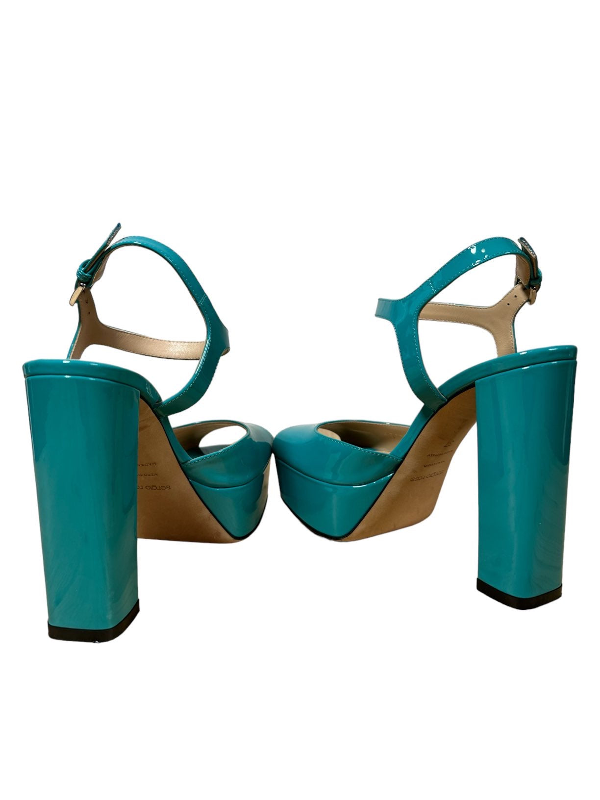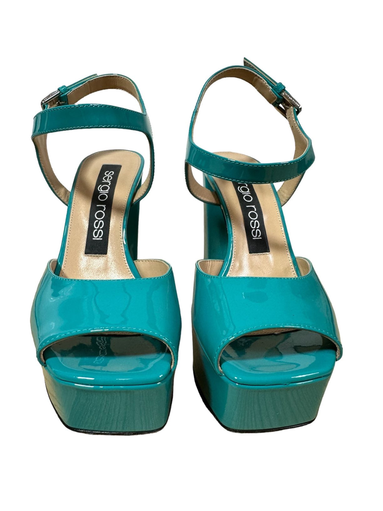 Sergio Rossi sandalo in pelle lucida color Tiffany con cinturino regolabile alla caviglia, plateaux e logo sul tacco. N. 37 Articolo di seconda mano, non vengono spediti con statola