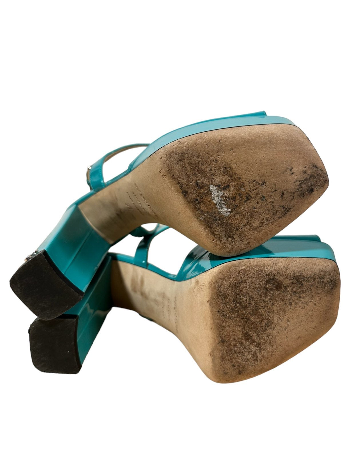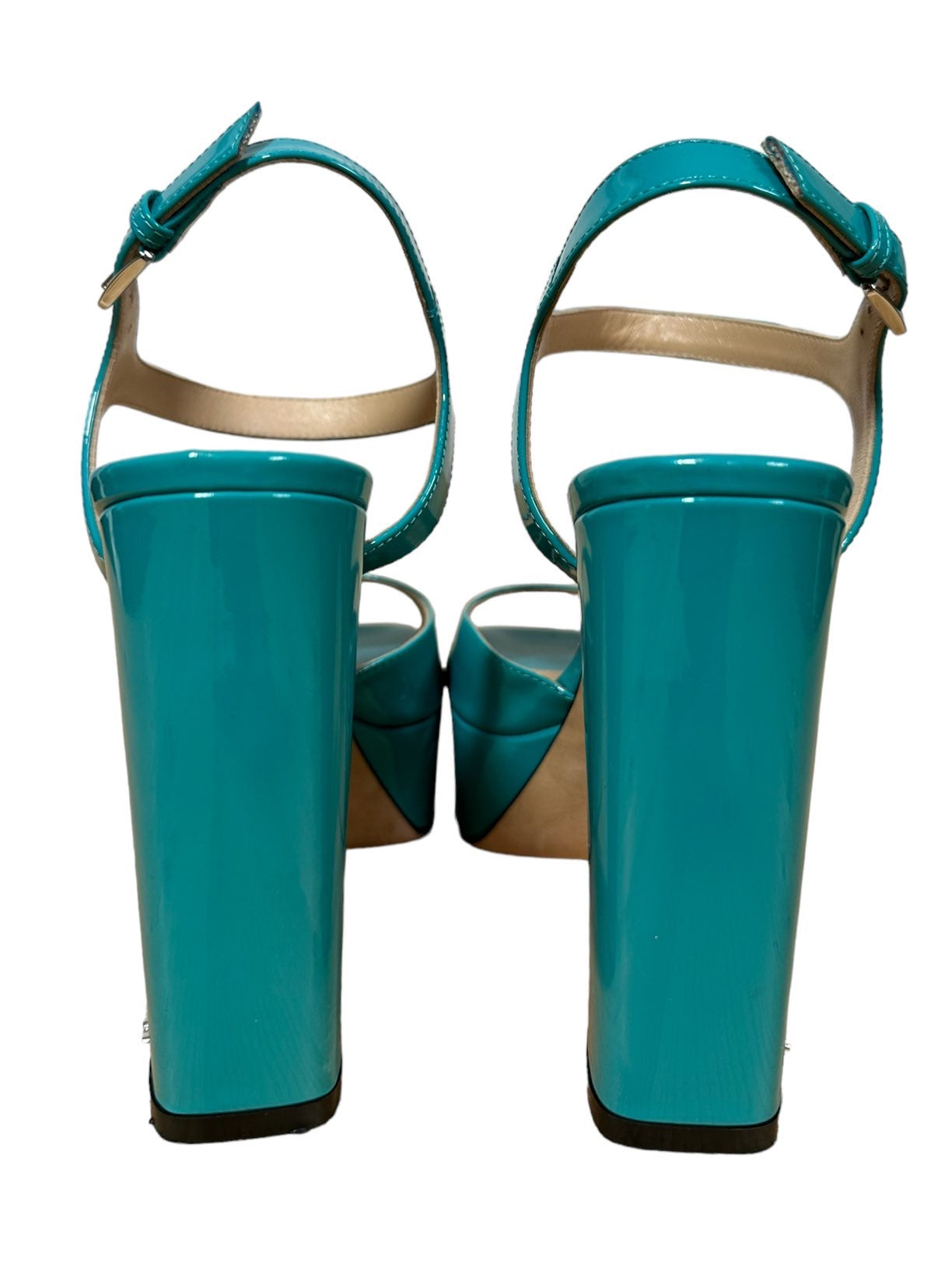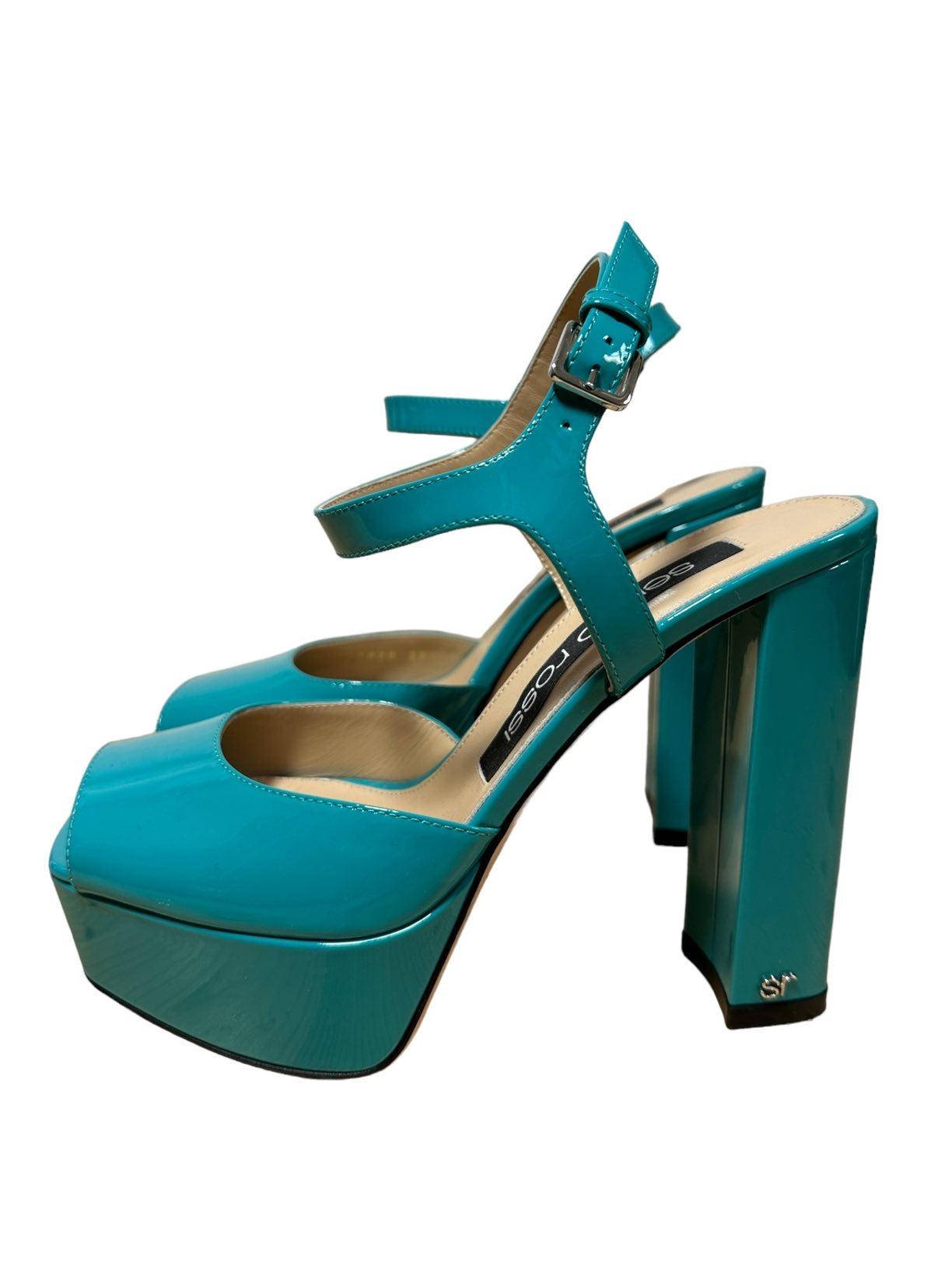 Sergio Rossi sandalo in pelle lucida color Tiffany con cinturino regolabile alla caviglia, plateaux e logo sul tacco. N. 37 Articolo di seconda mano, non vengono spediti con statola