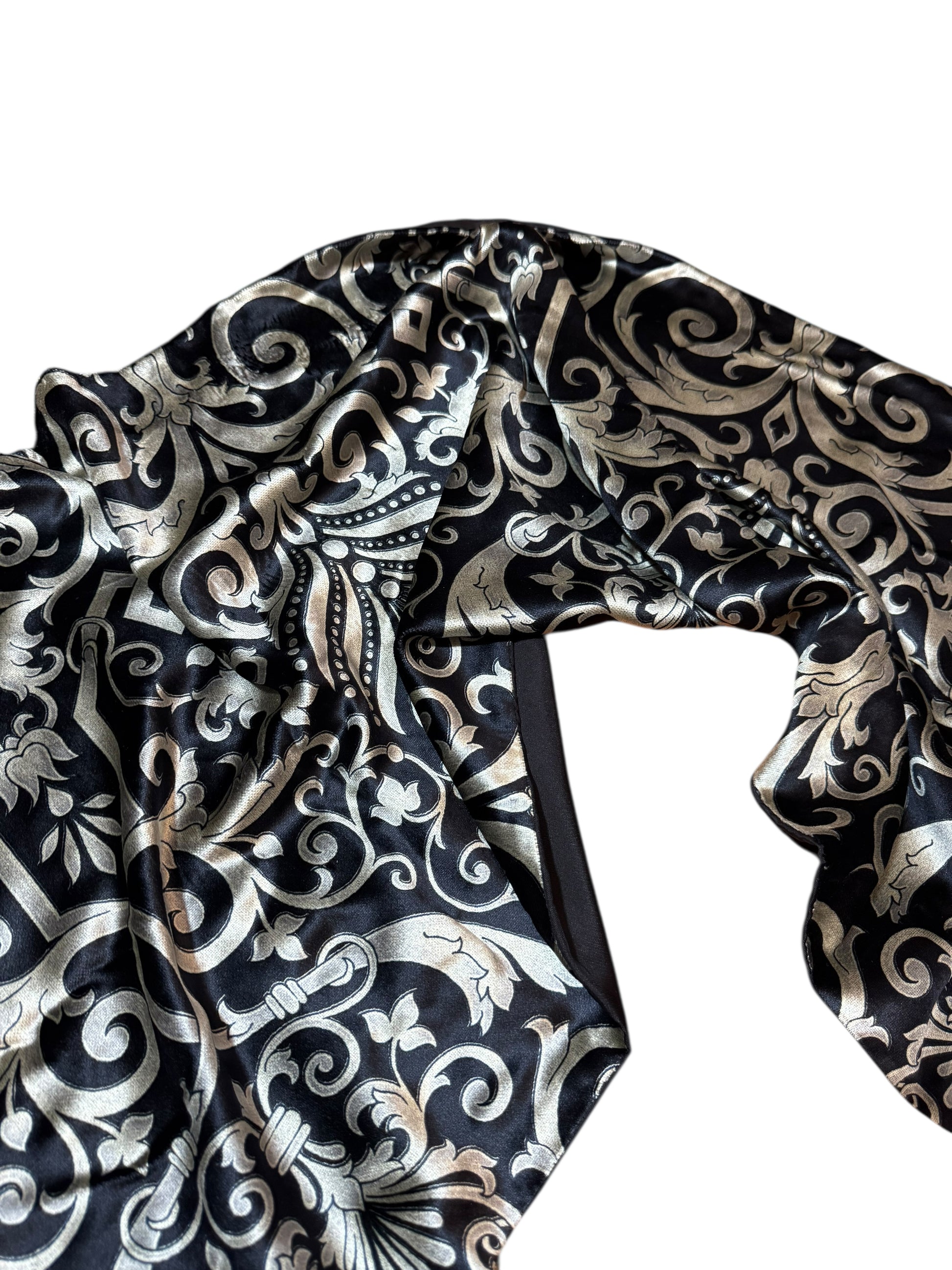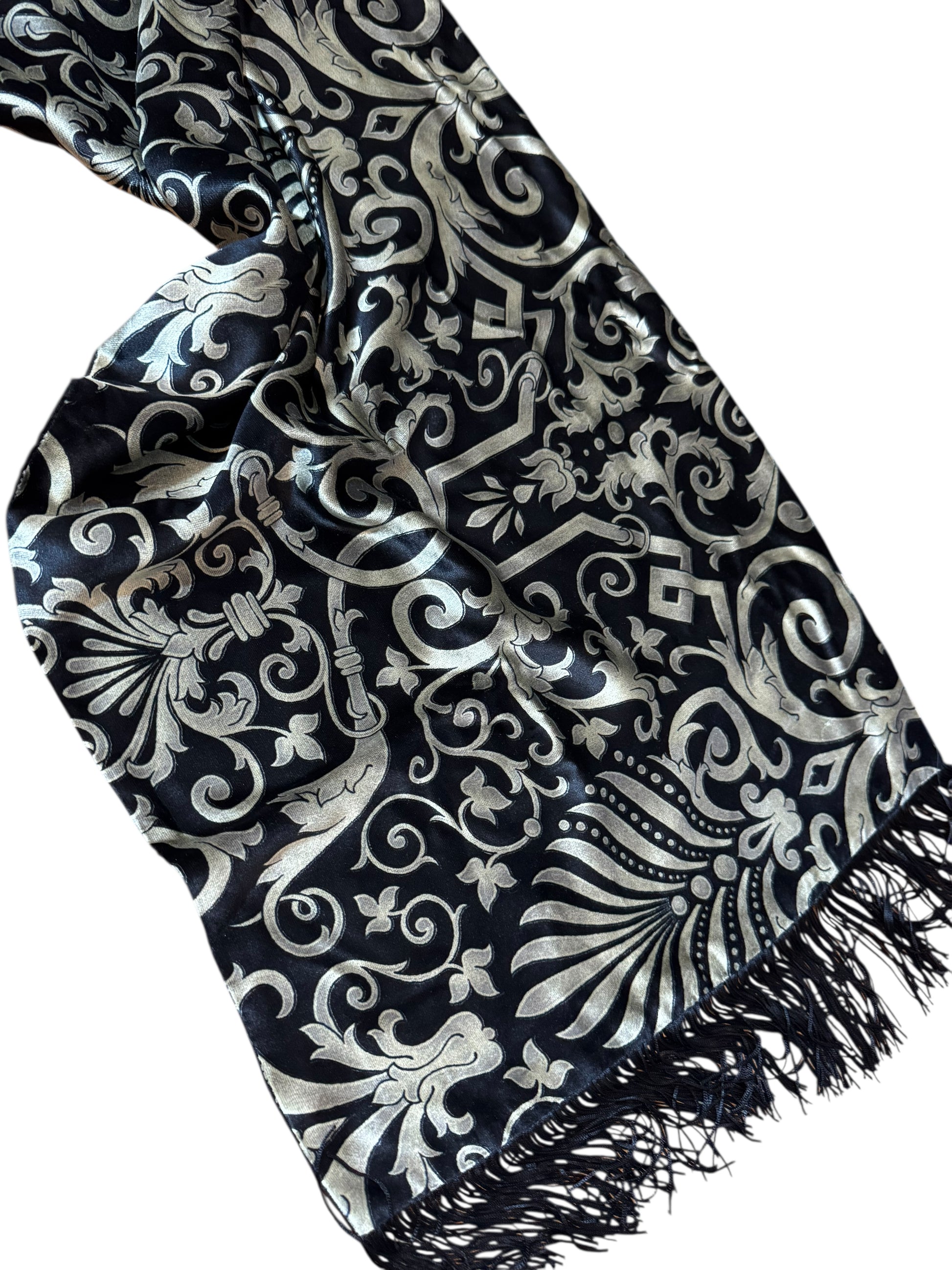 Elegante sciarpa vintage Gianni Versace, realizzata in 100% seta e cupro, con iconica stampa barocca nero/oro e finiture con frange nere. Prodotto Made in Italy, da collezione. Ideale per look raffinati e ricercati.