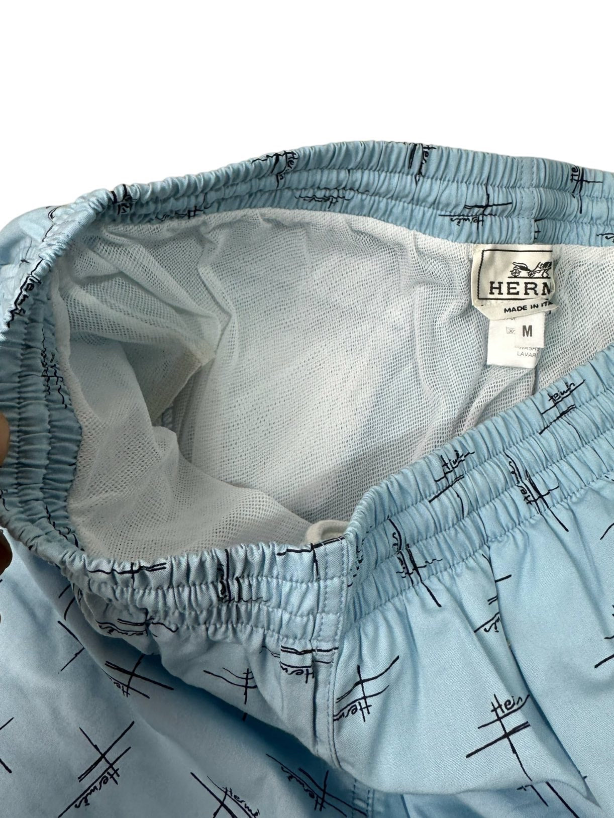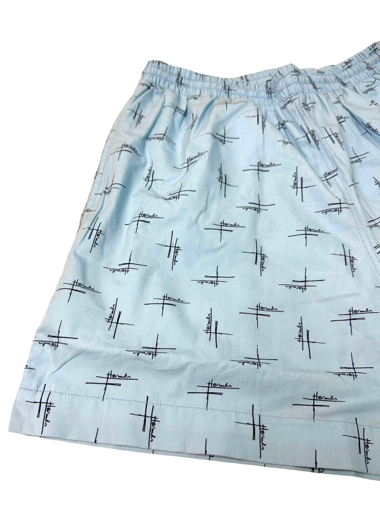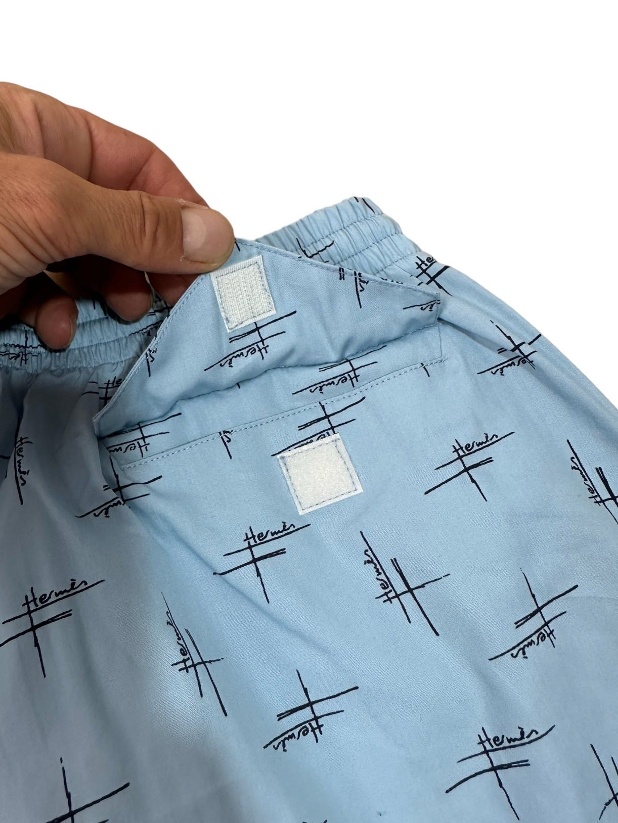 Hermès costume da bagno maschile a pantaloncino in cotone azzurro con piccoli loghi stampati. Tasche laterali e sul retro. Tg. M