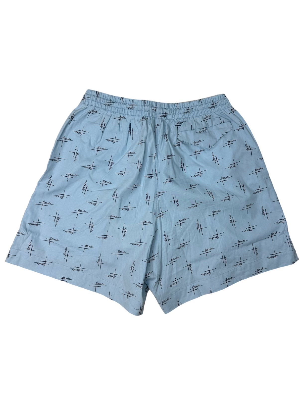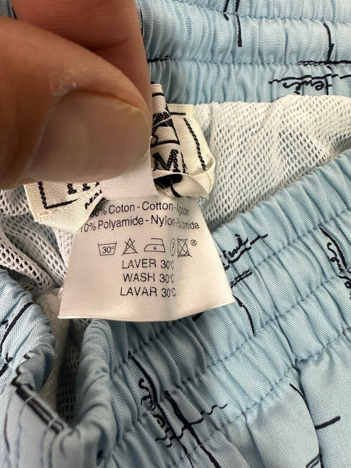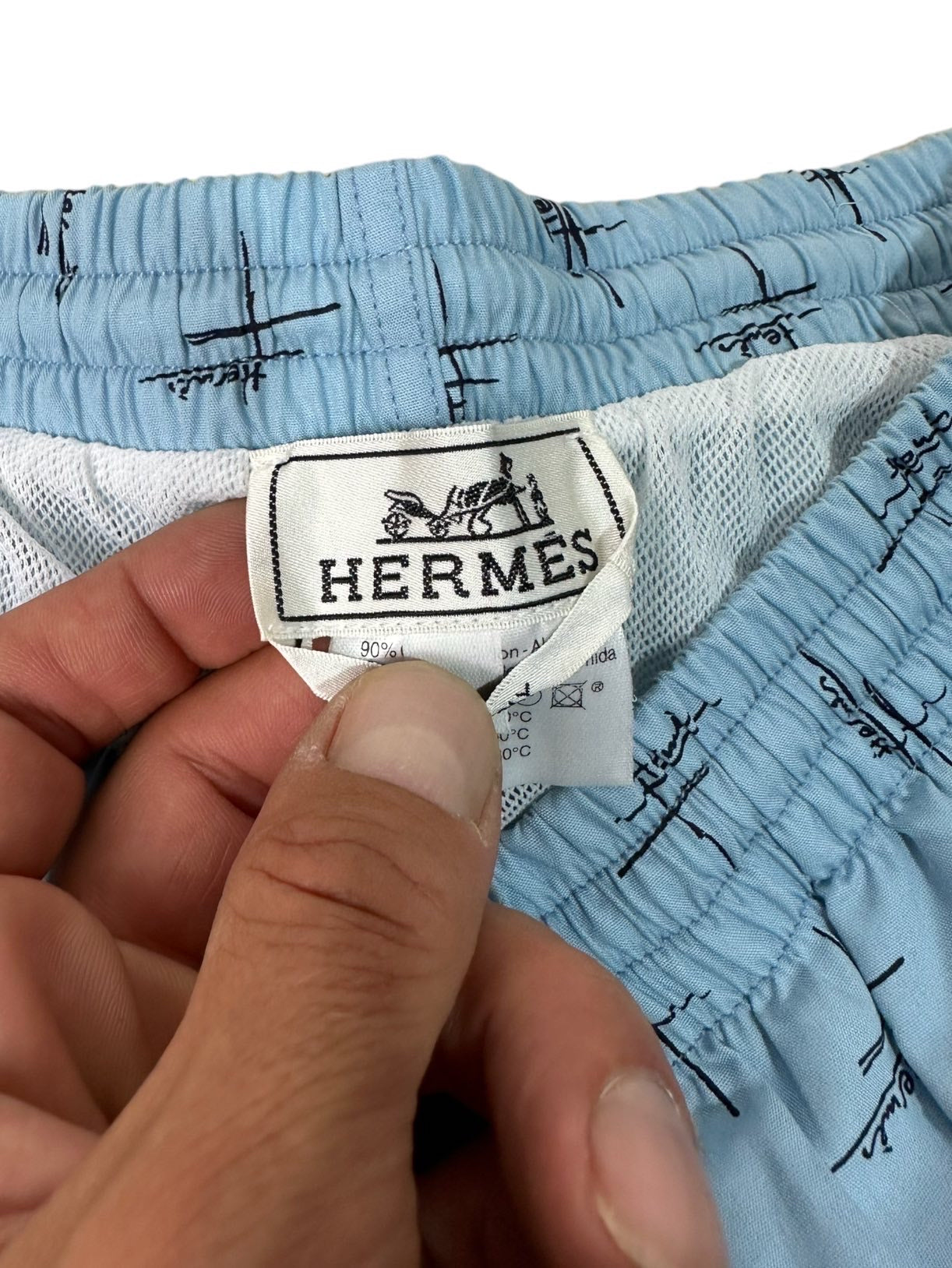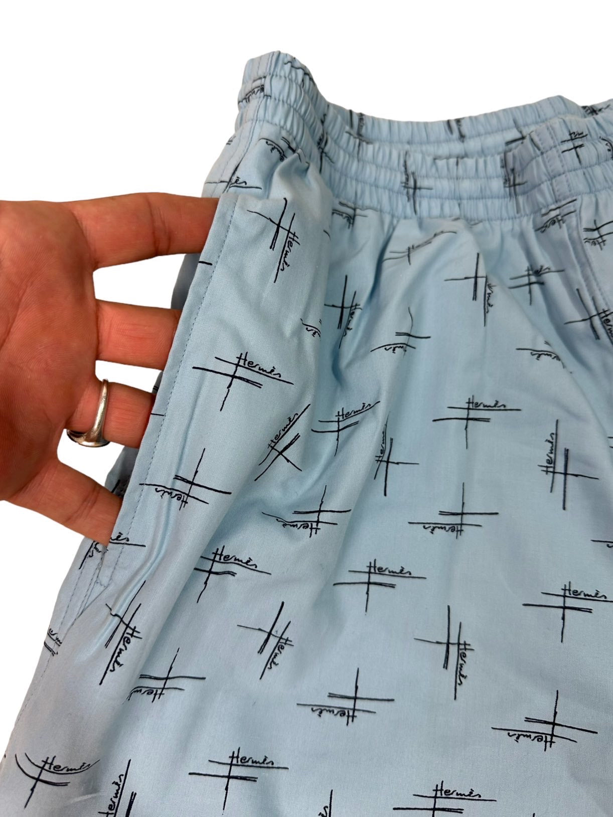 Hermès costume da bagno maschile a pantaloncino in cotone azzurro con piccoli loghi stampati. Tasche laterali e sul retro. Tg. M