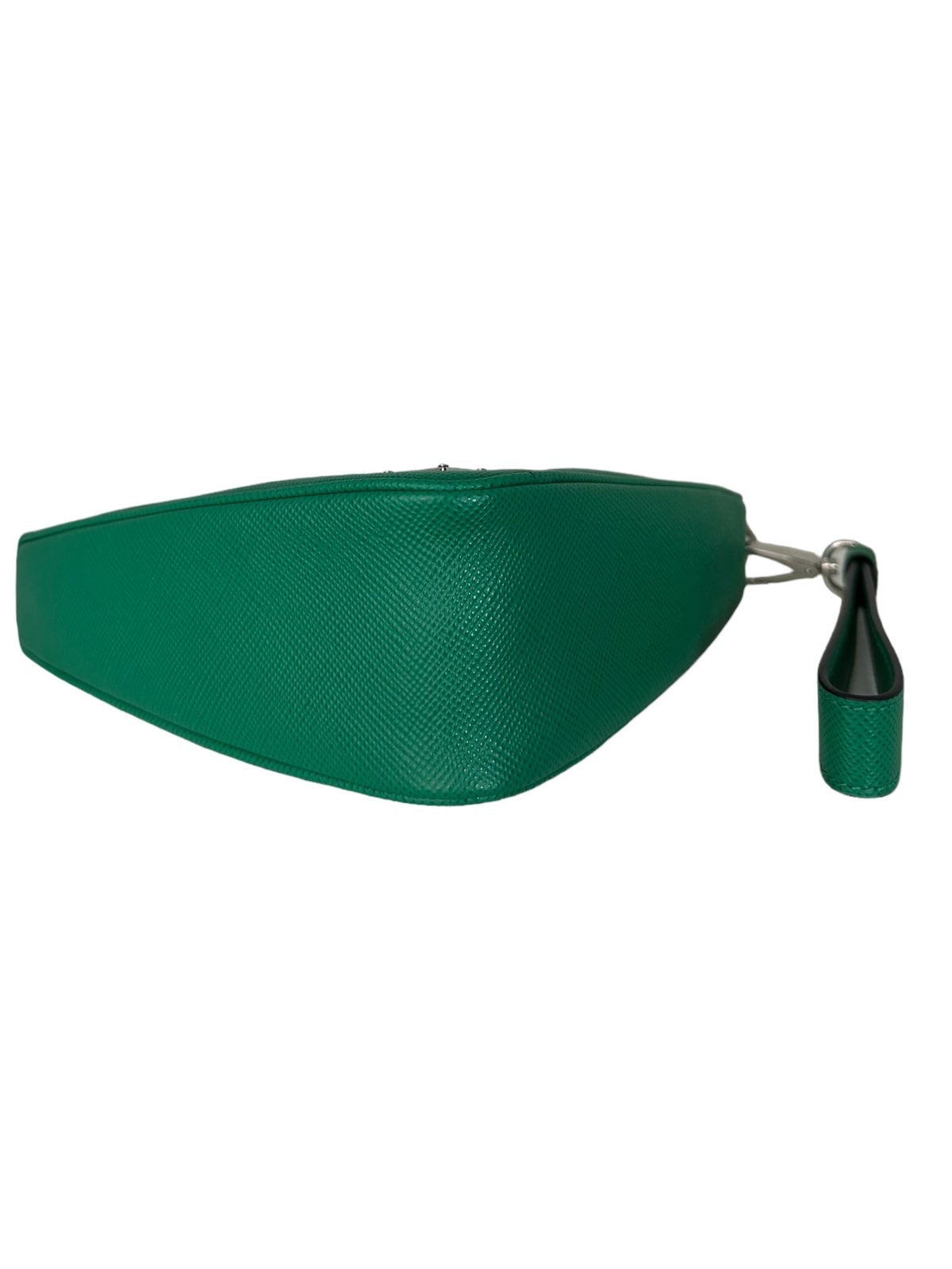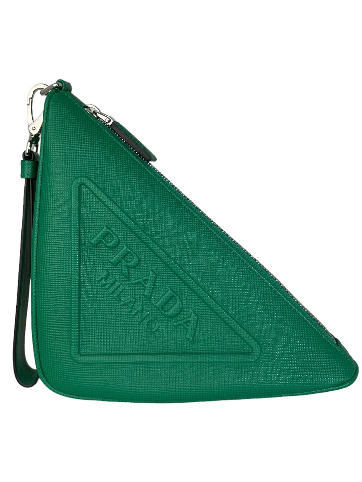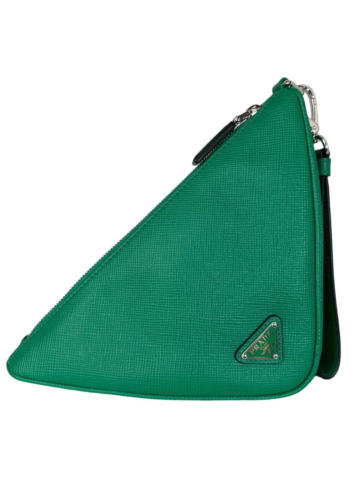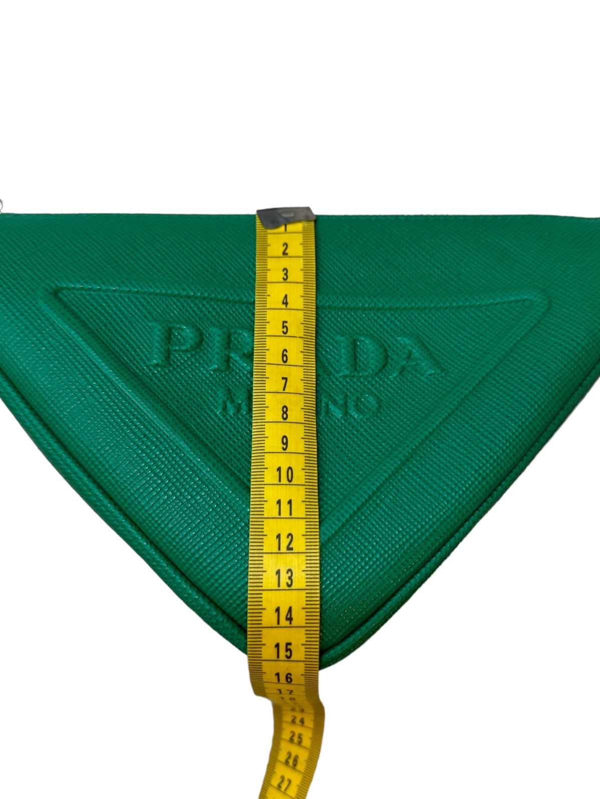 Prada borsa in pelle saffiano verde a triangolo con manico rimovibile, hardware in metallo argentato e chiusura a zip. Risponde di un ampio spazio interno che può contenere un telefono cellulare di grandi misure e l’occorrente necessario.
