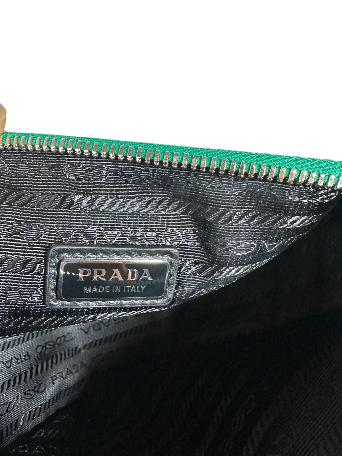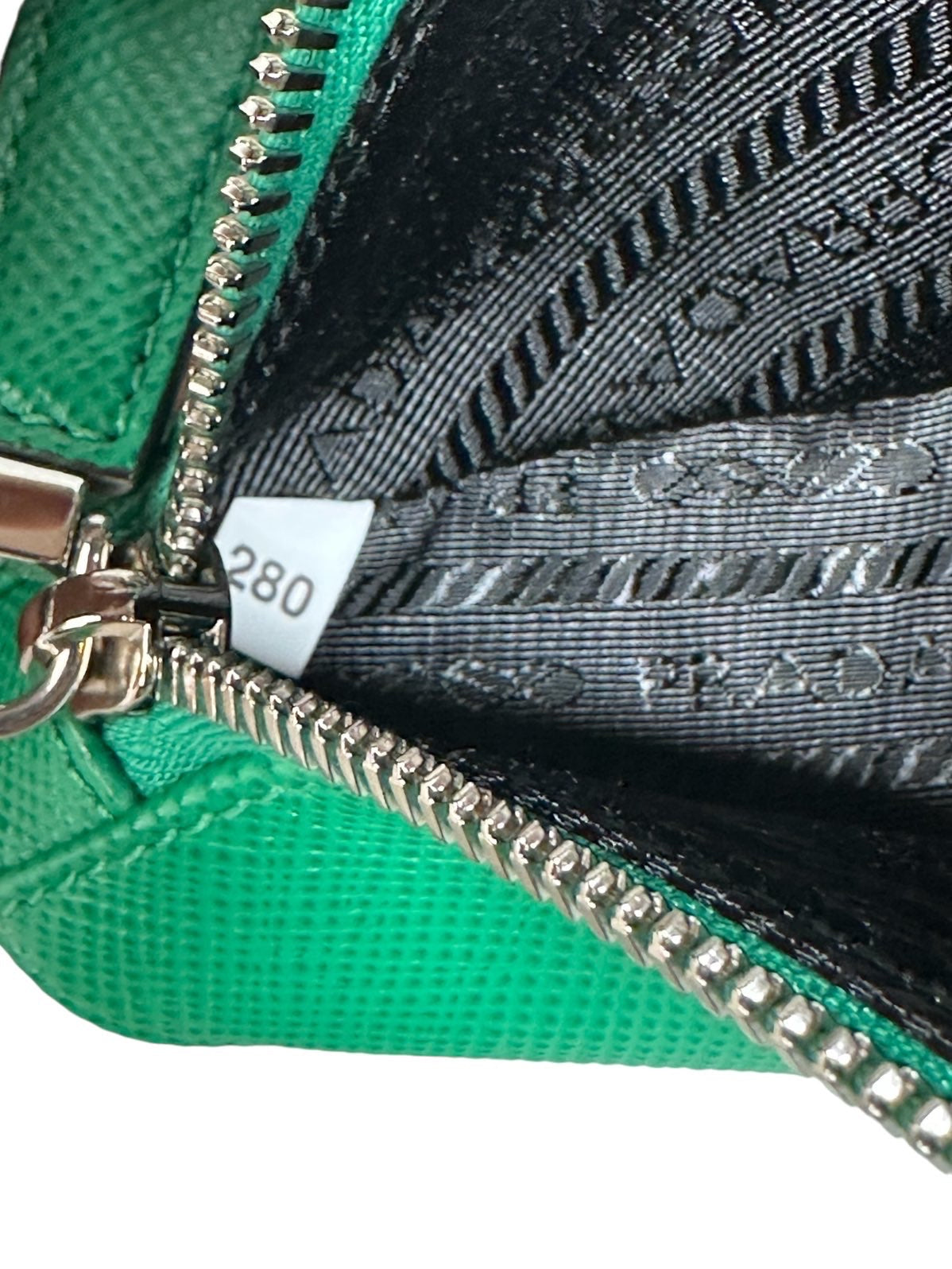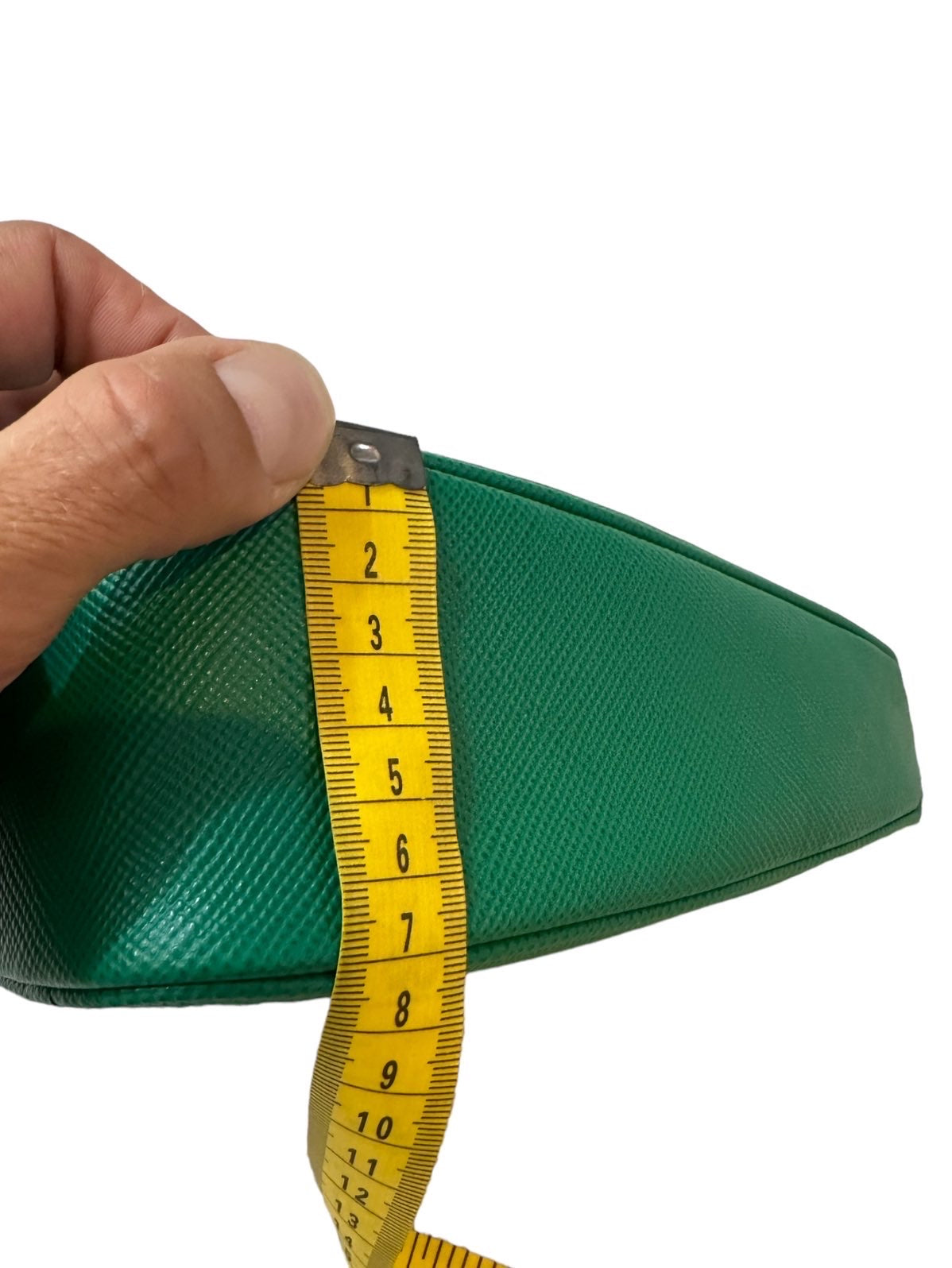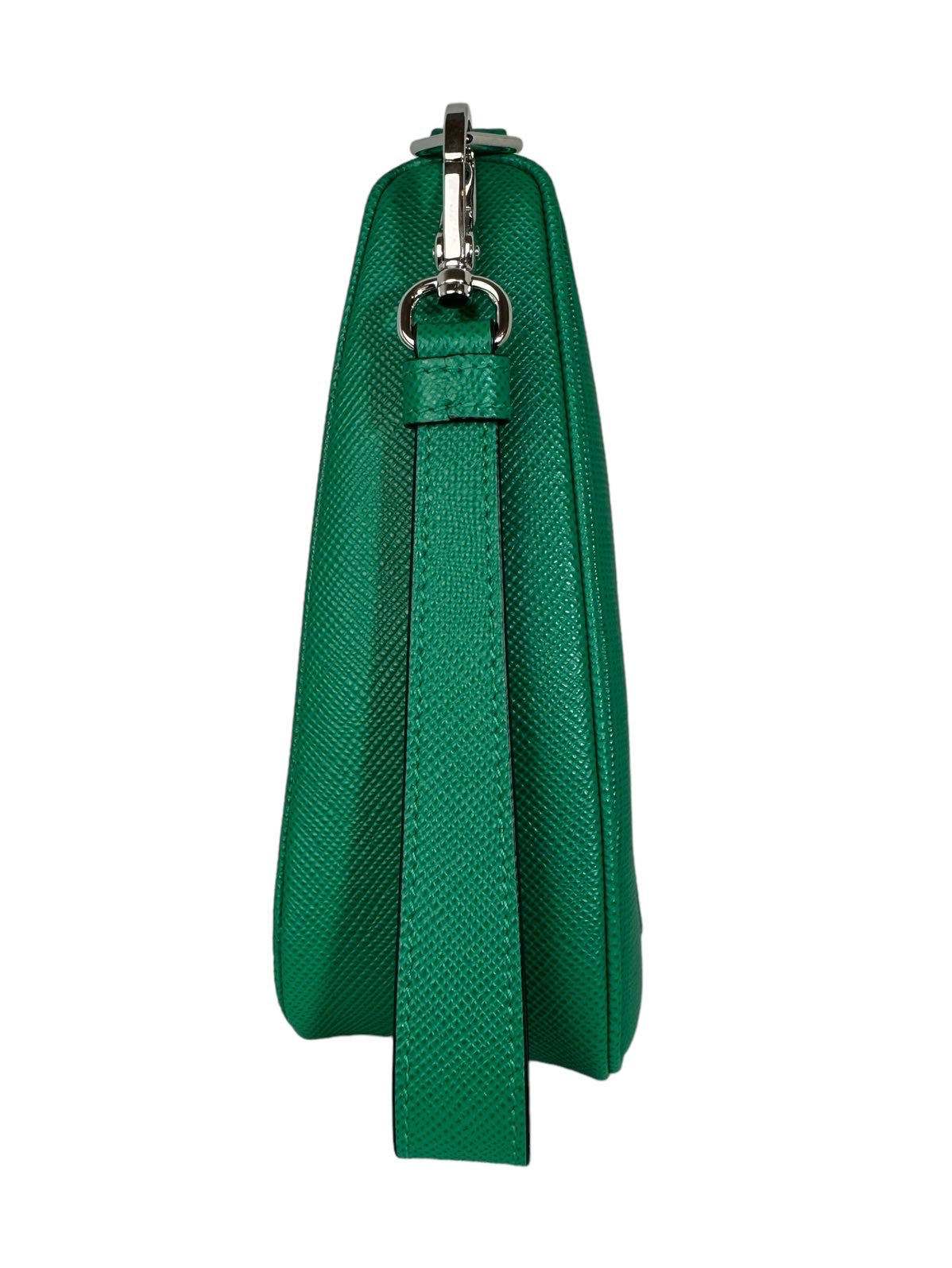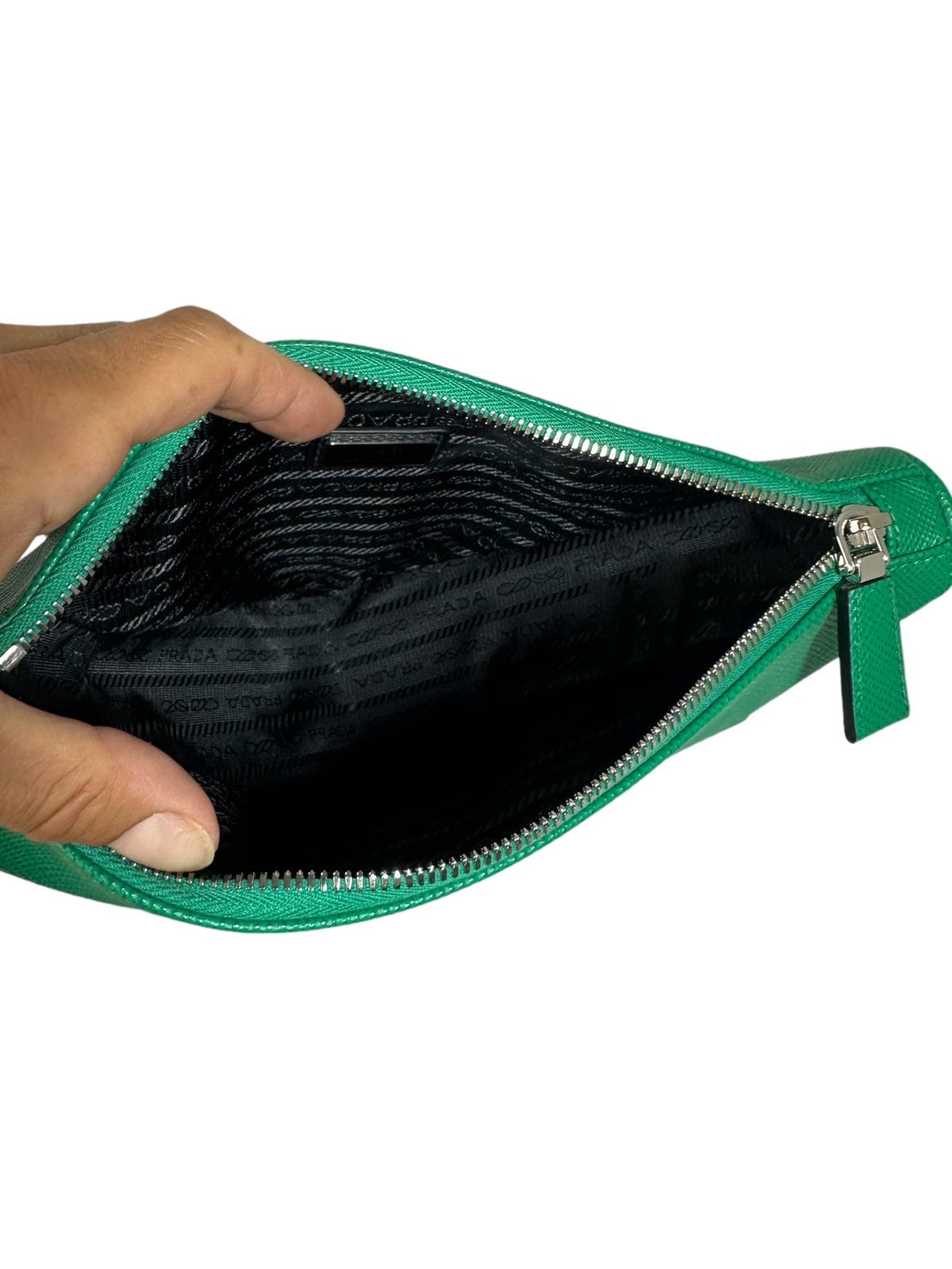 Prada borsa in pelle saffiano verde a triangolo con manico rimovibile, hardware in metallo argentato e chiusura a zip. Risponde di un ampio spazio interno che può contenere un telefono cellulare di grandi misure e l’occorrente necessario.