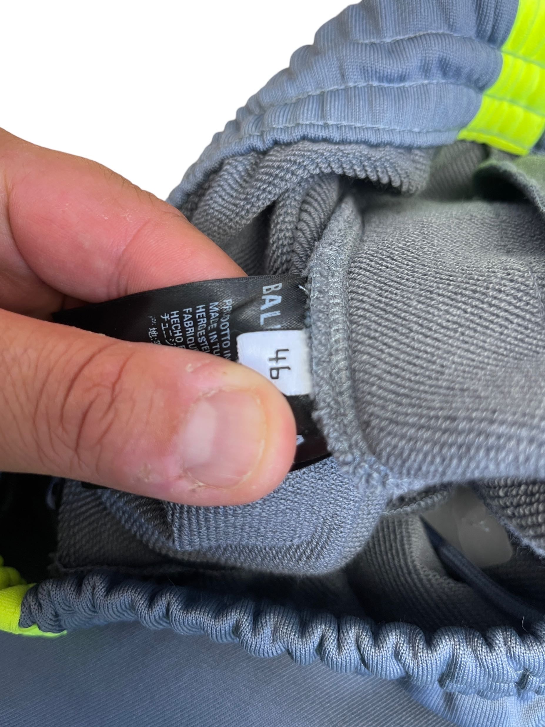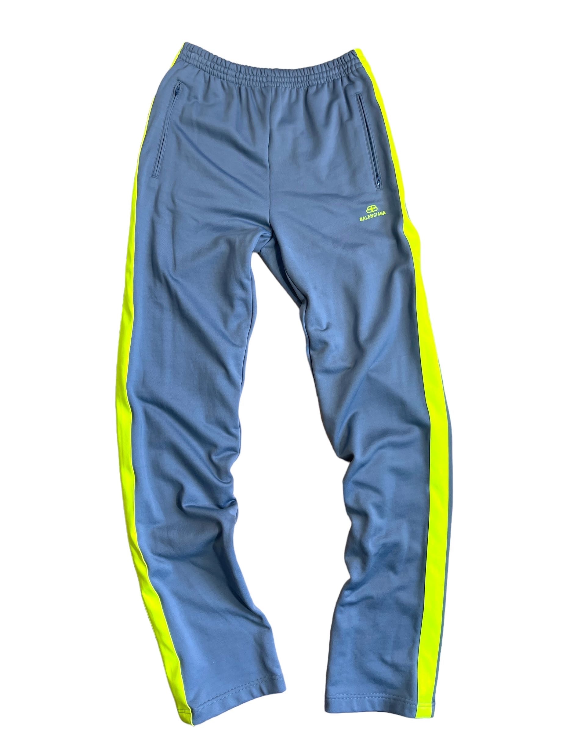 Balenciaga pantaloni maschili della tuta grigi con bande giallo fluo.