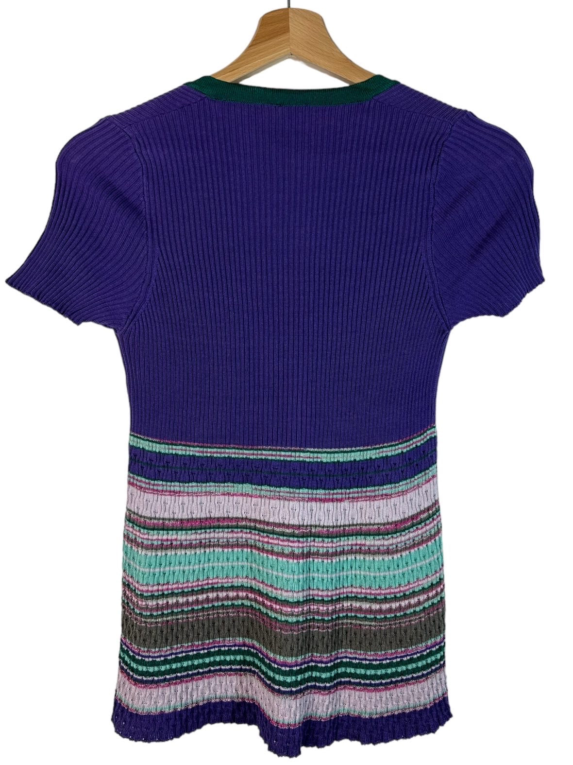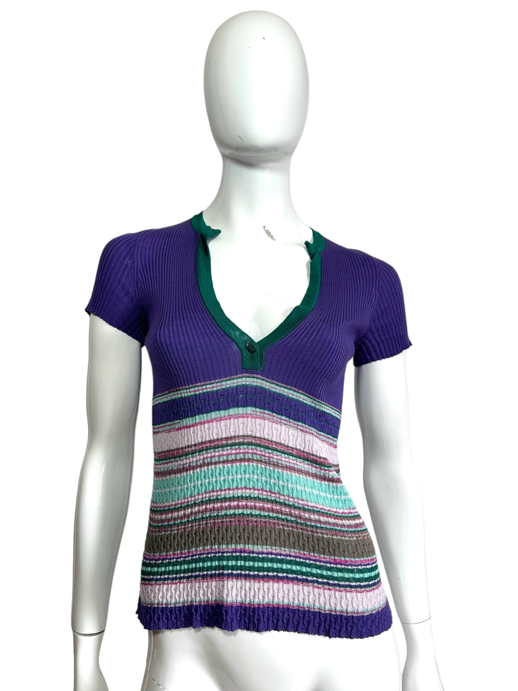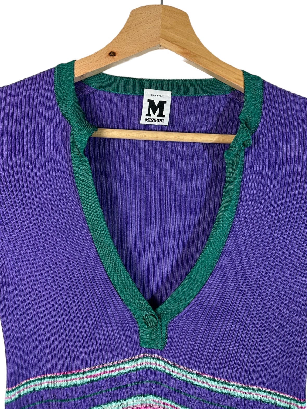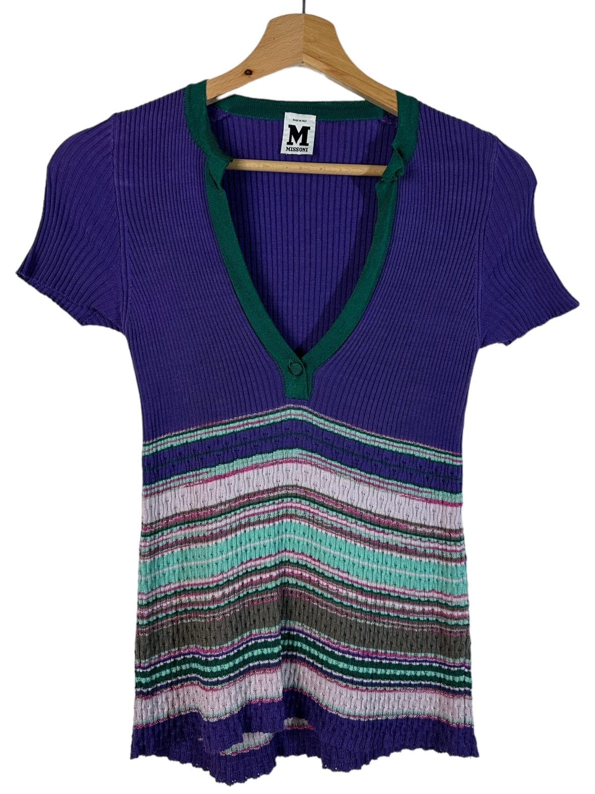 Missoni maglia in viscosa stretch, scollo a V con bottone rivestito sul finale. Maniche corte e lavorazione multicolor a righe sul profilo inferiore. Tg. 40
