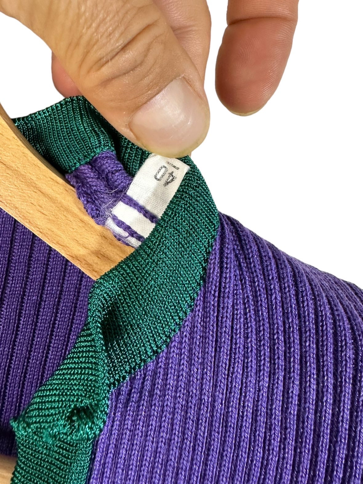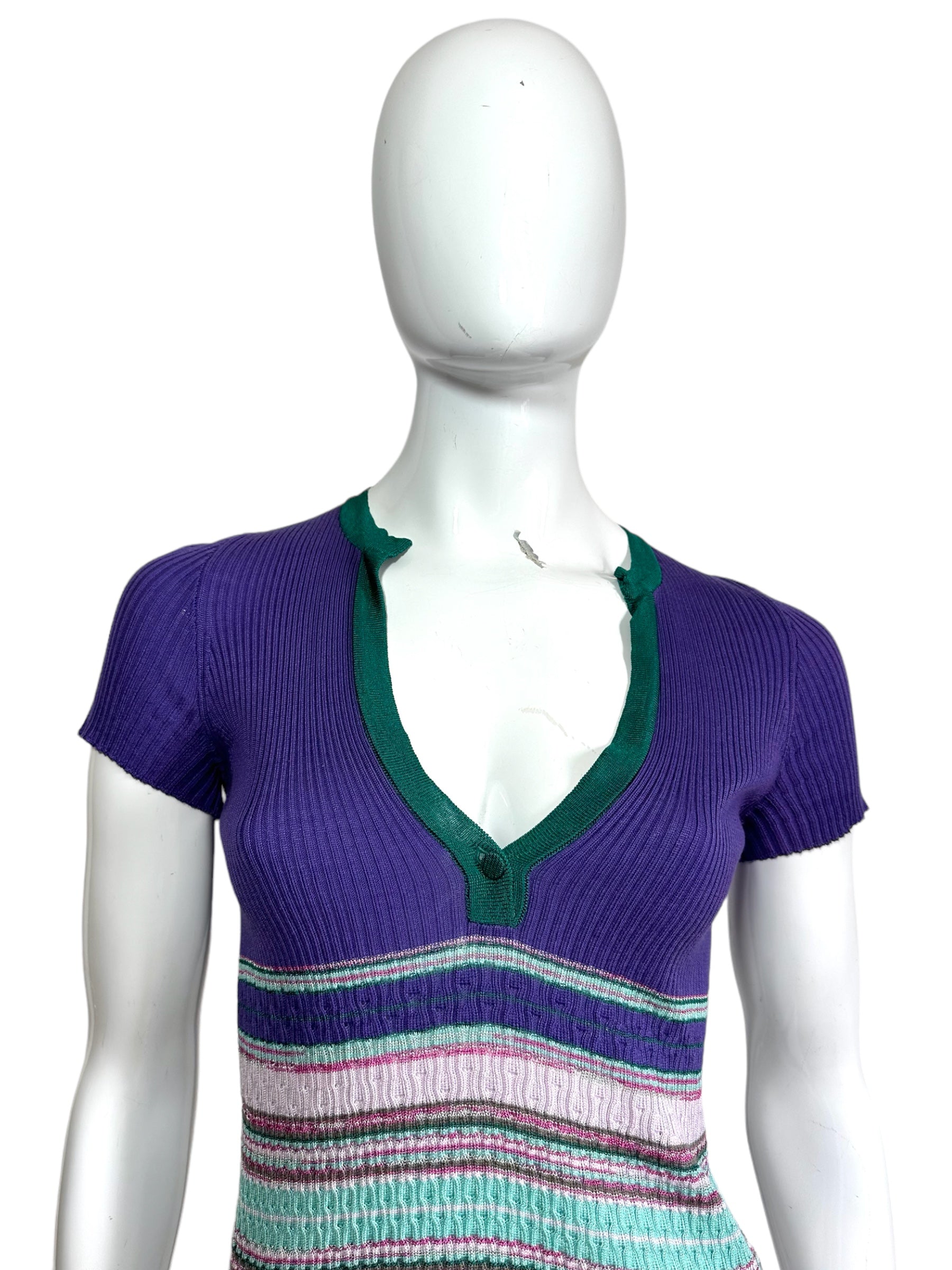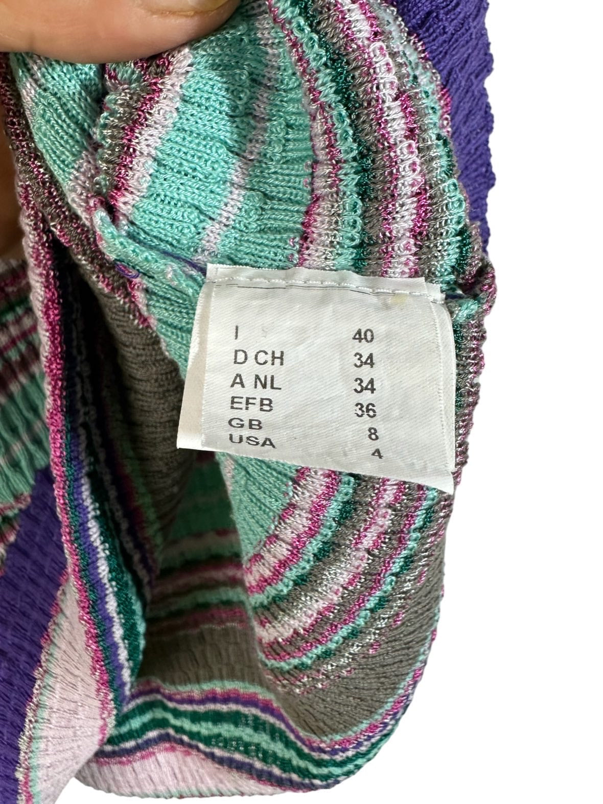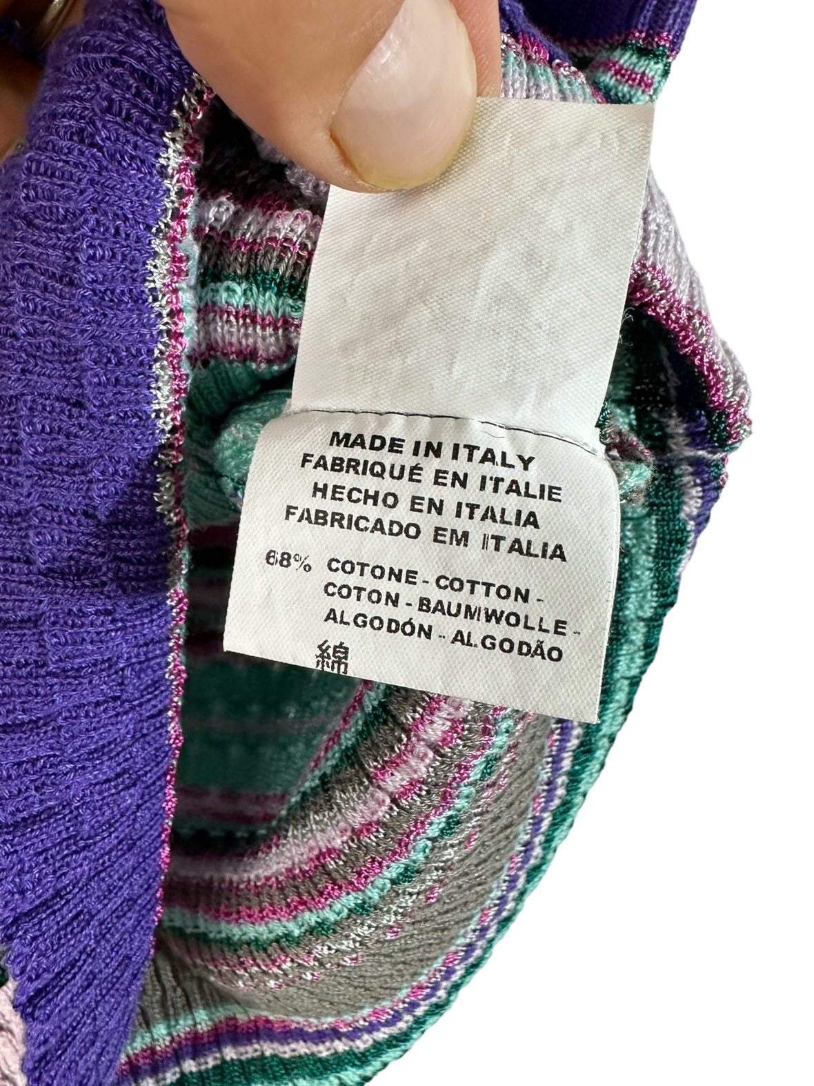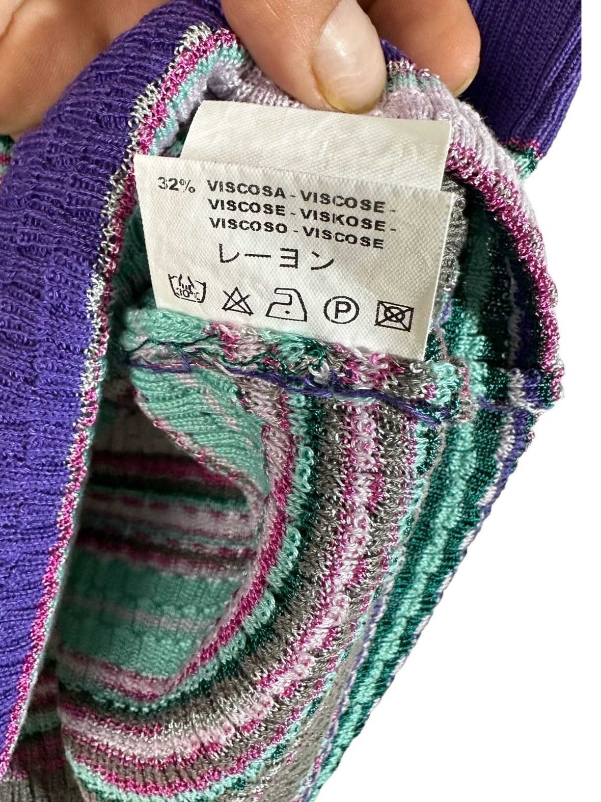 Missoni maglia in viscosa stretch, scollo a V con bottone rivestito sul finale. Maniche corte e lavorazione multicolor a righe sul profilo inferiore. Tg. 40