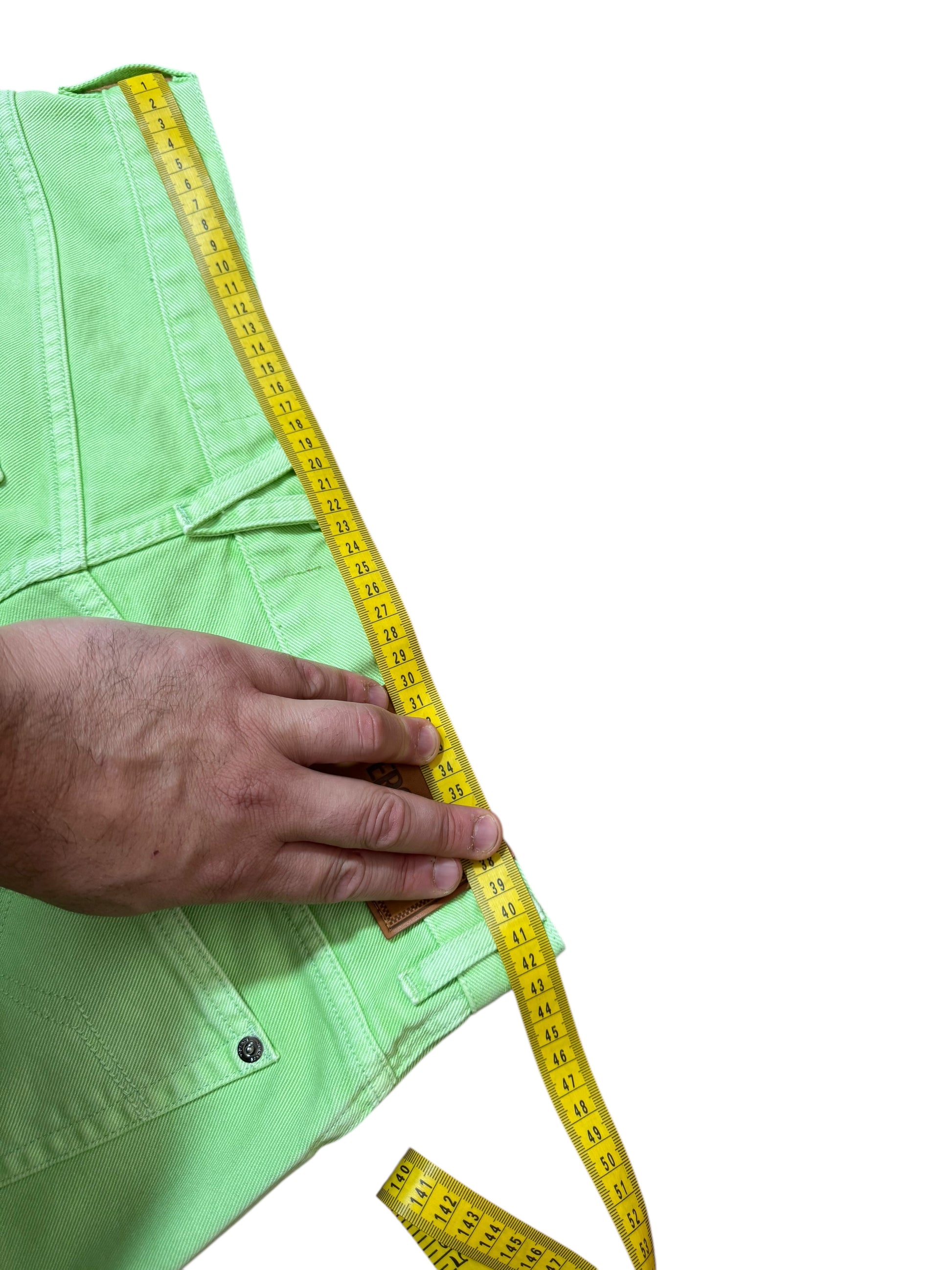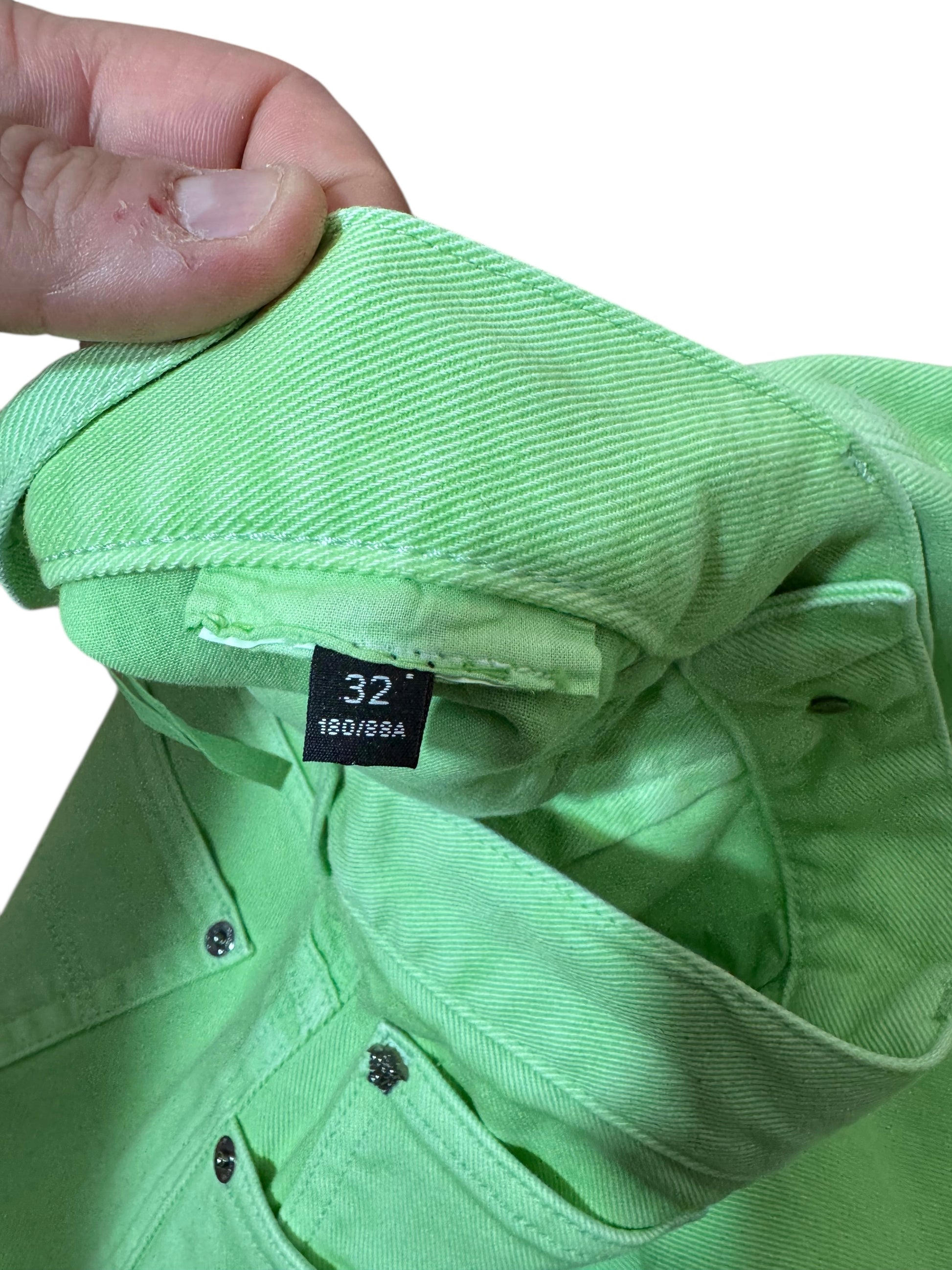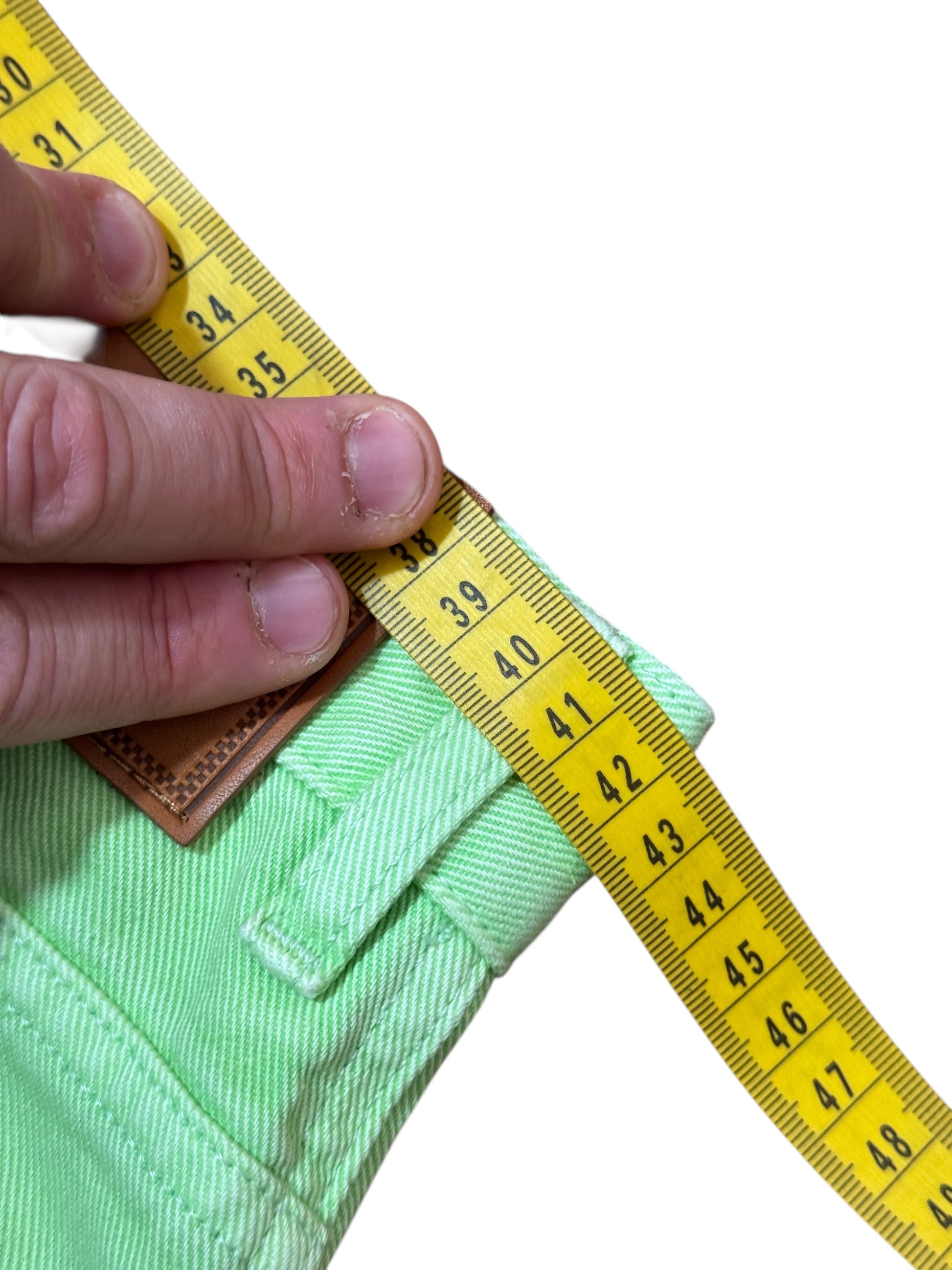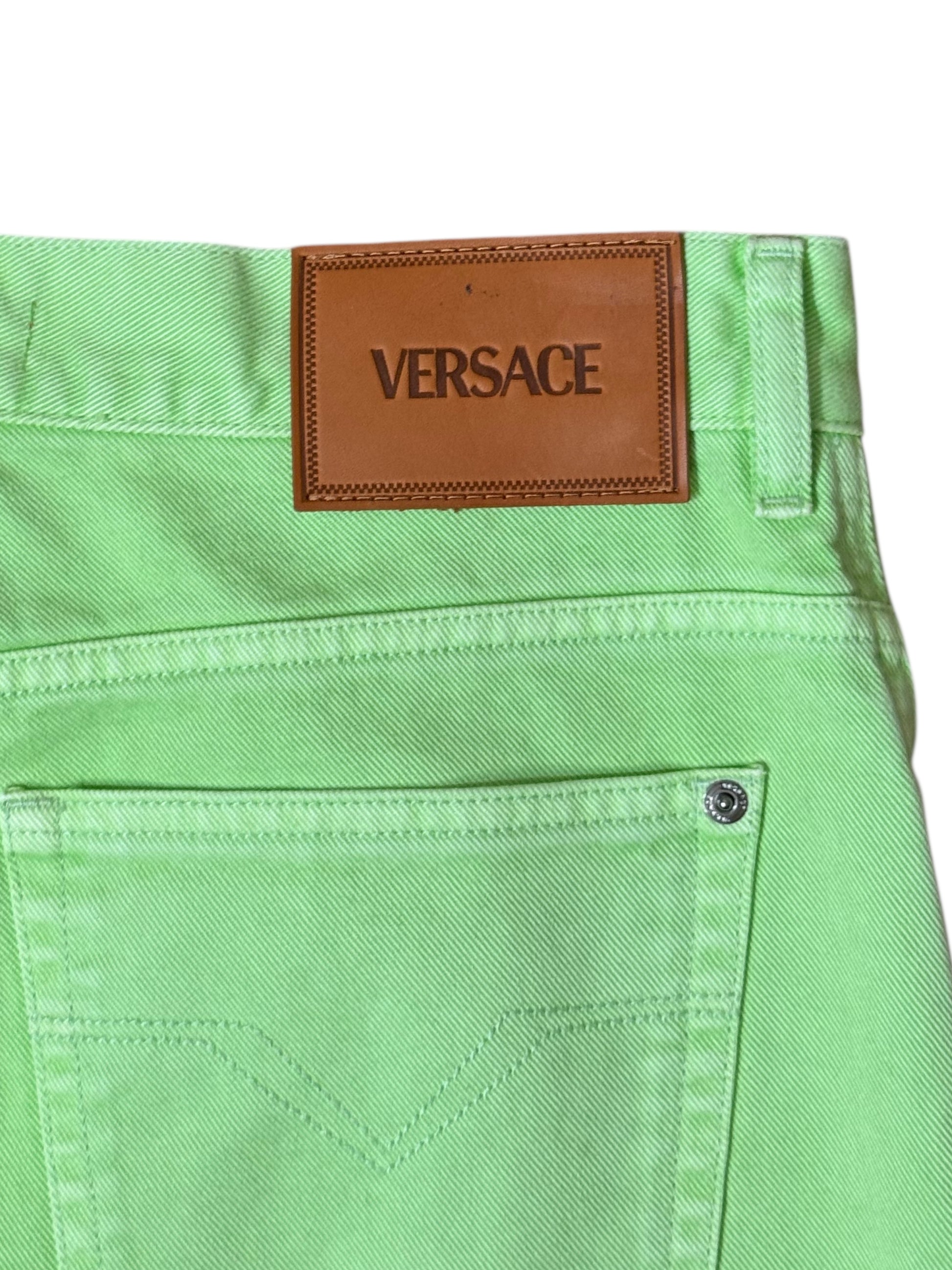 Pantaloni Versace in denim di cotone verde lime, con logo Versace impresso sul patch in pelle sul retro. Fit dritto, stile contemporaneo.