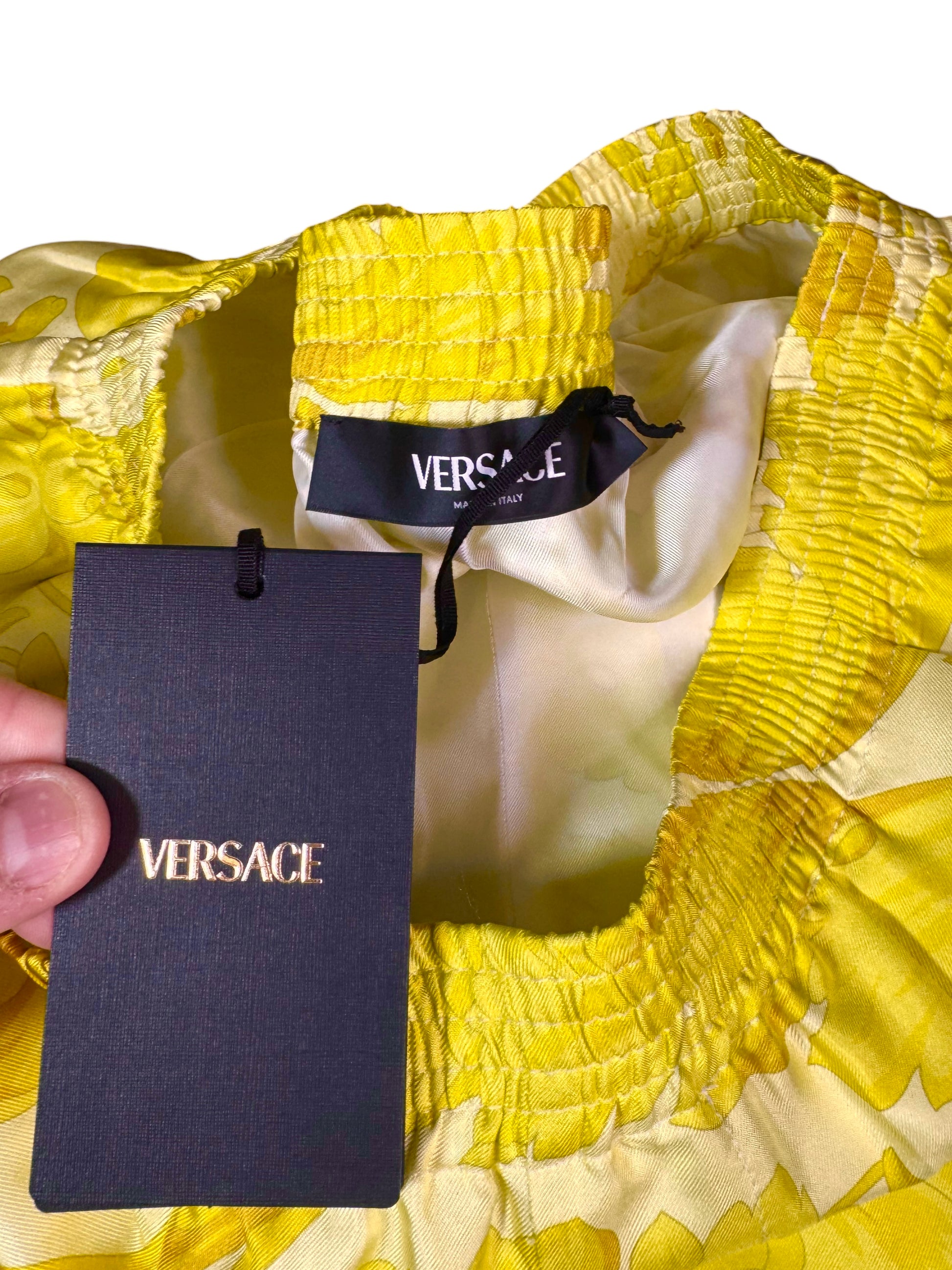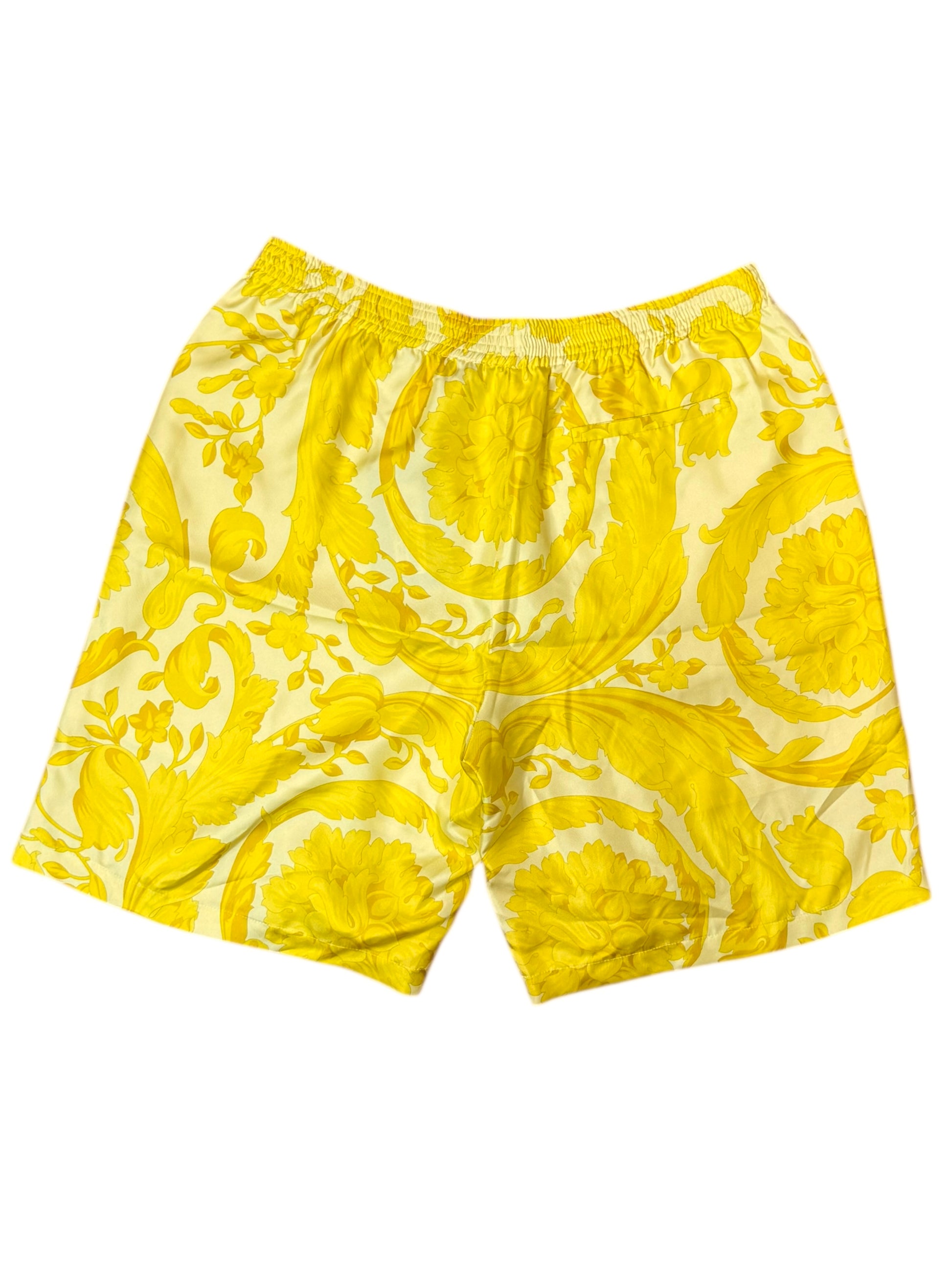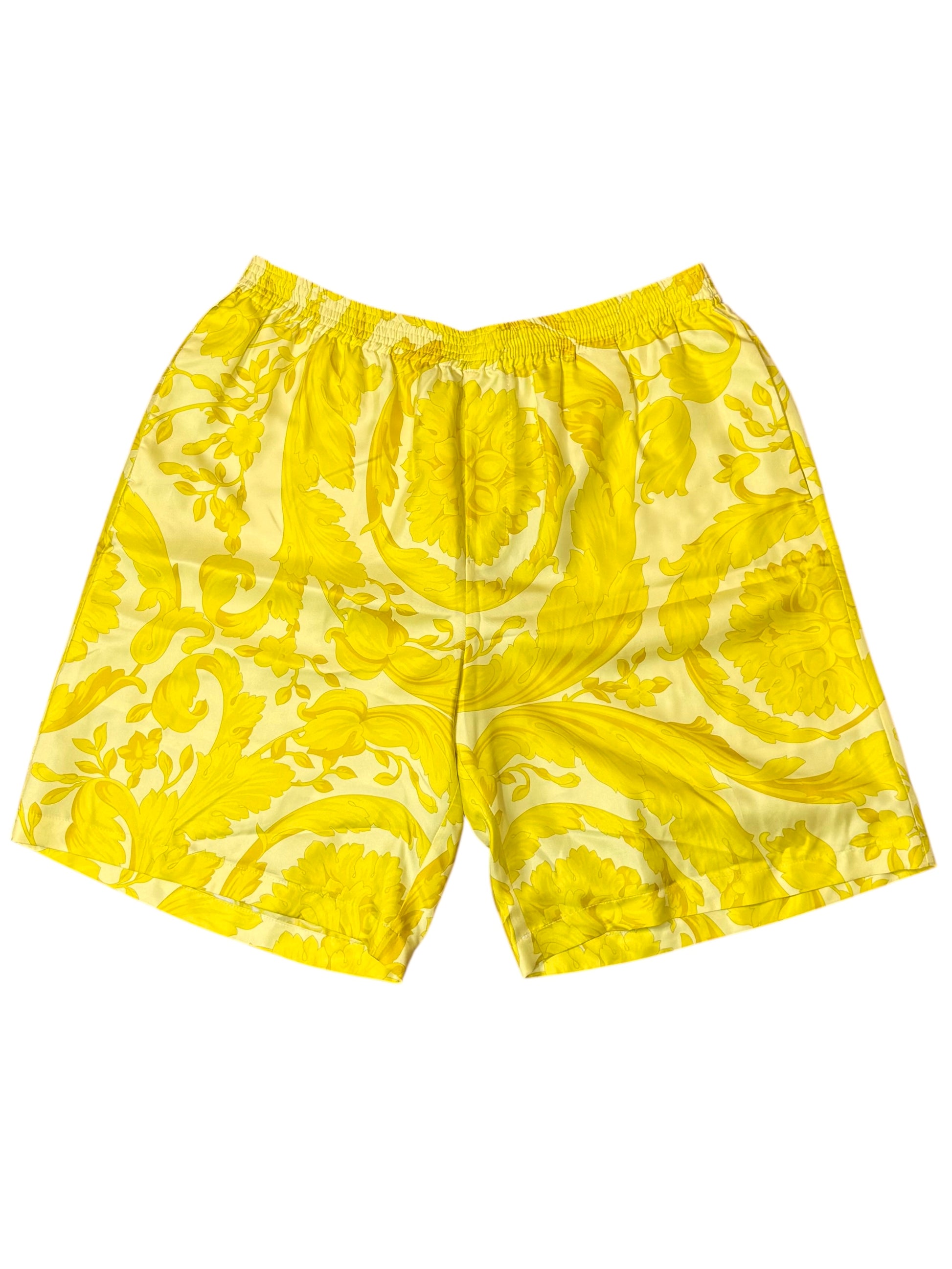Shorts Versace in seta gialla stampa barocca, nuovi con cartellino
