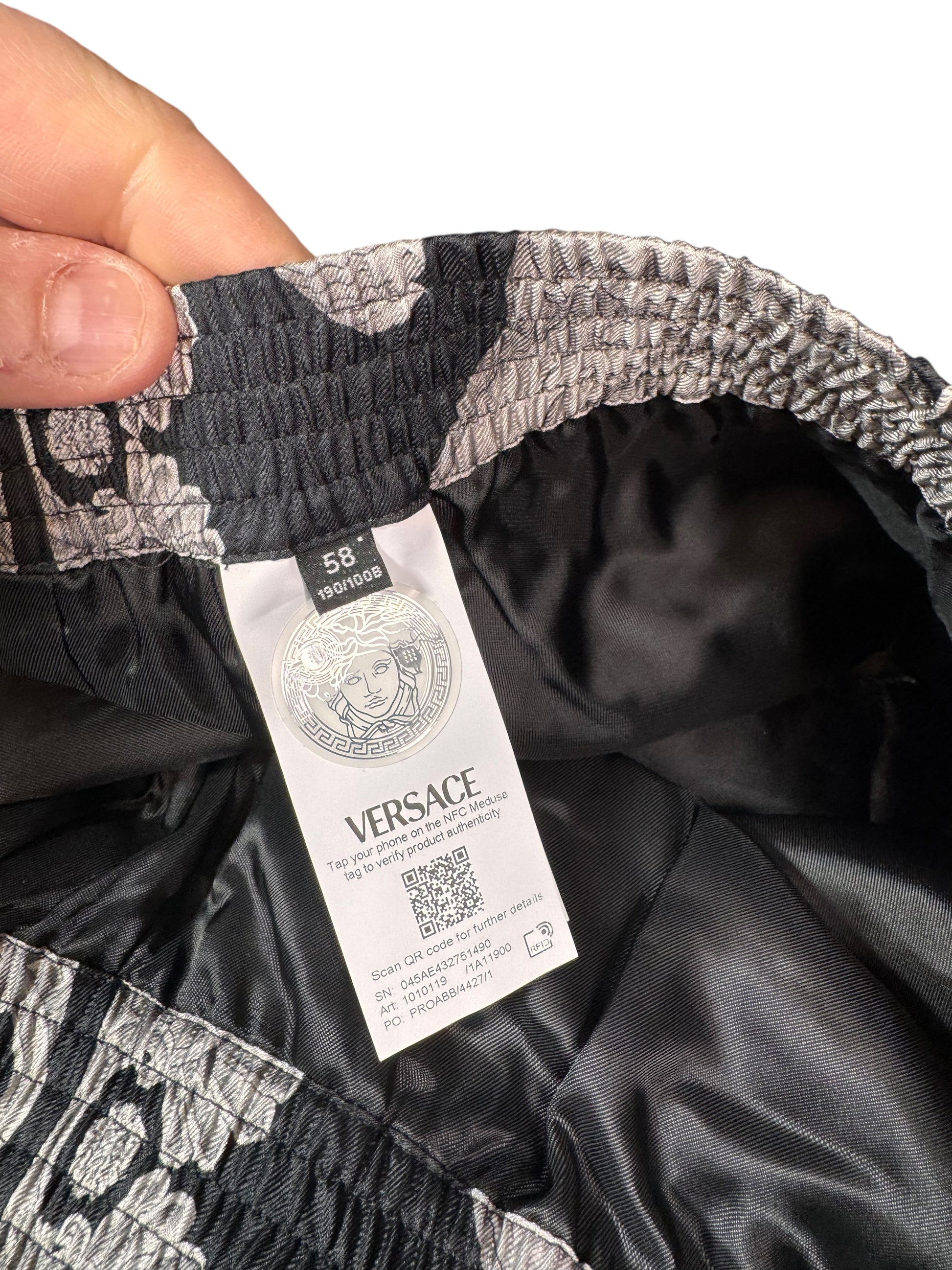 Shorts Versace in seta stampa barocca nero e argento, nuovi con cartellino