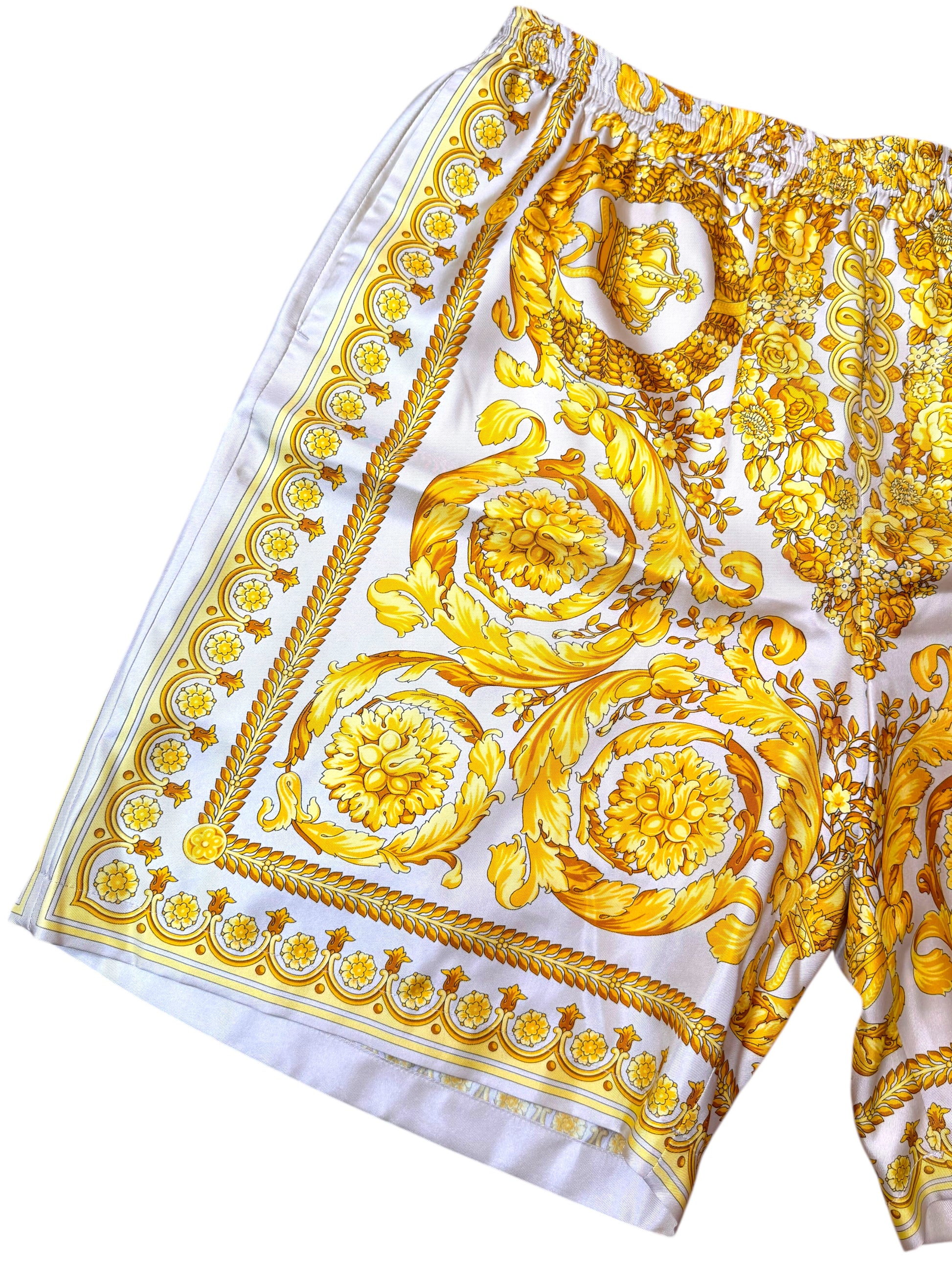 Shorts Versace originali da uomo, realizzati in seta twill di alta qualità con iconica stampa barocca nei toni dell’oro su fondo bianco, con motivi Medusa e cornici decorative.