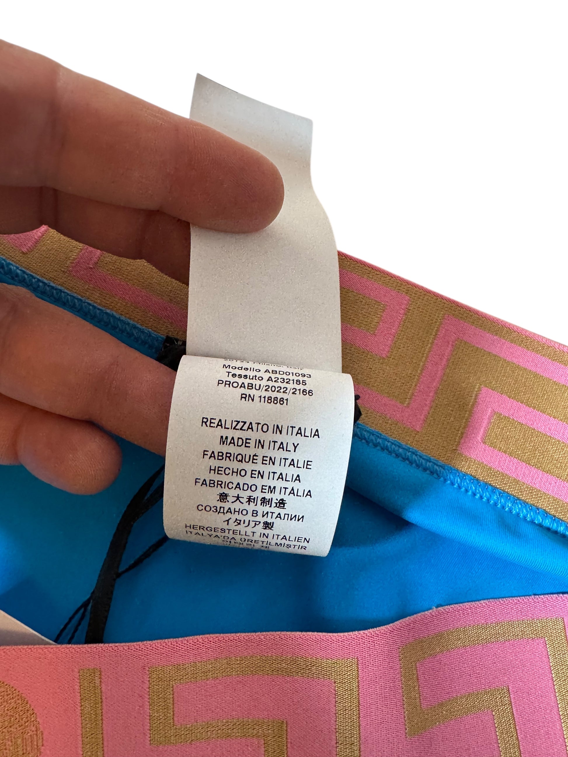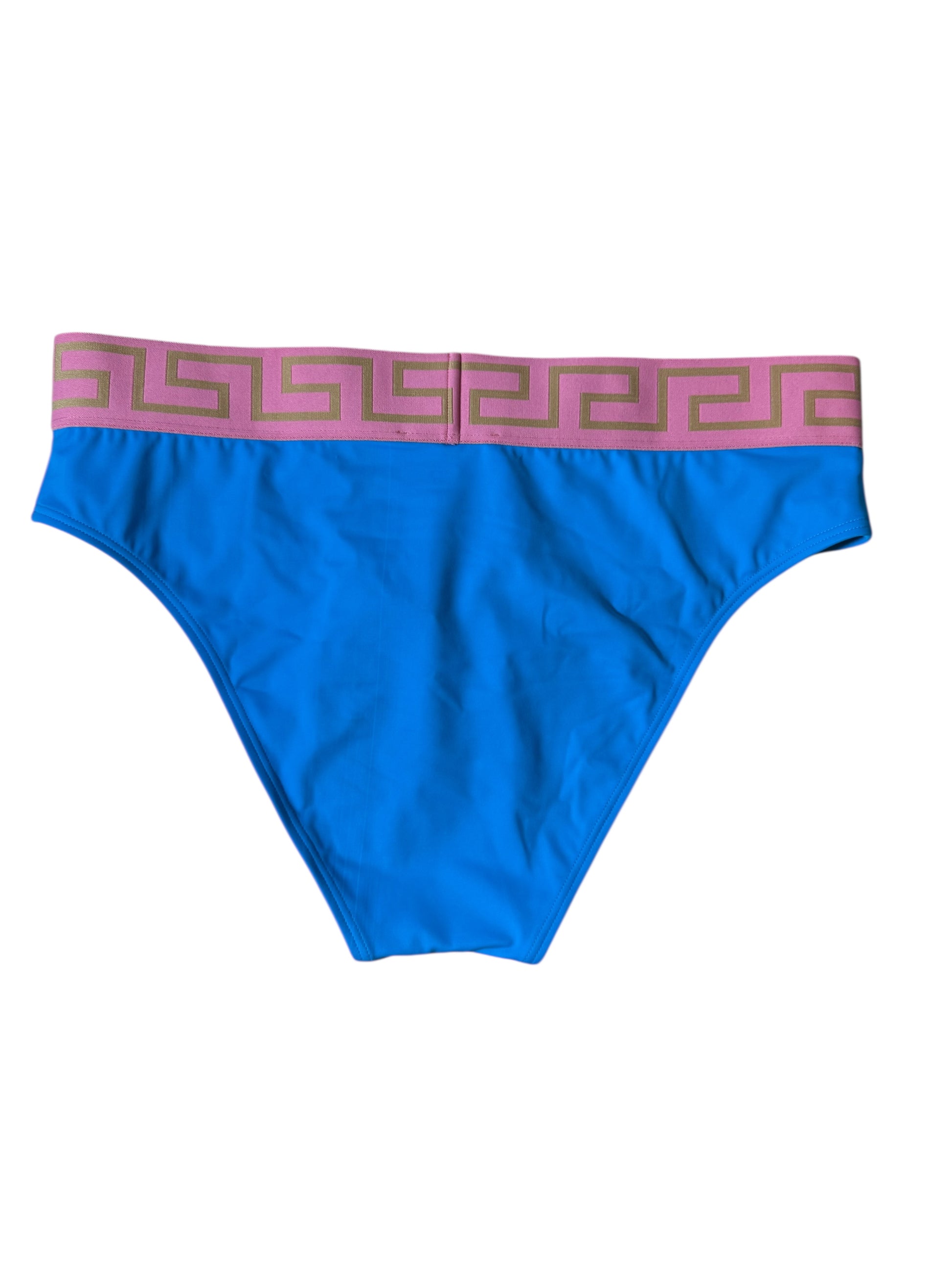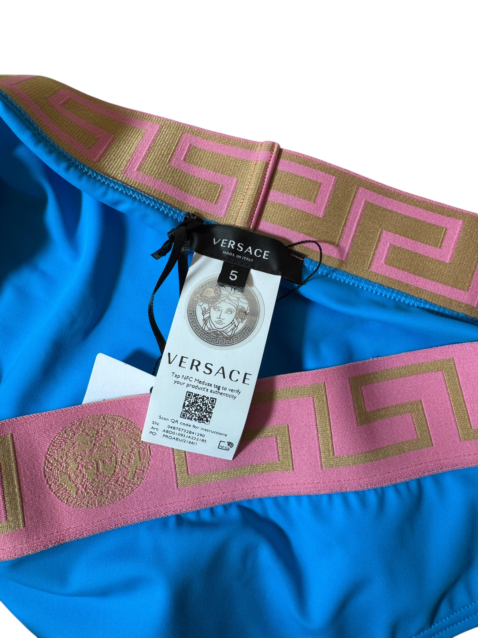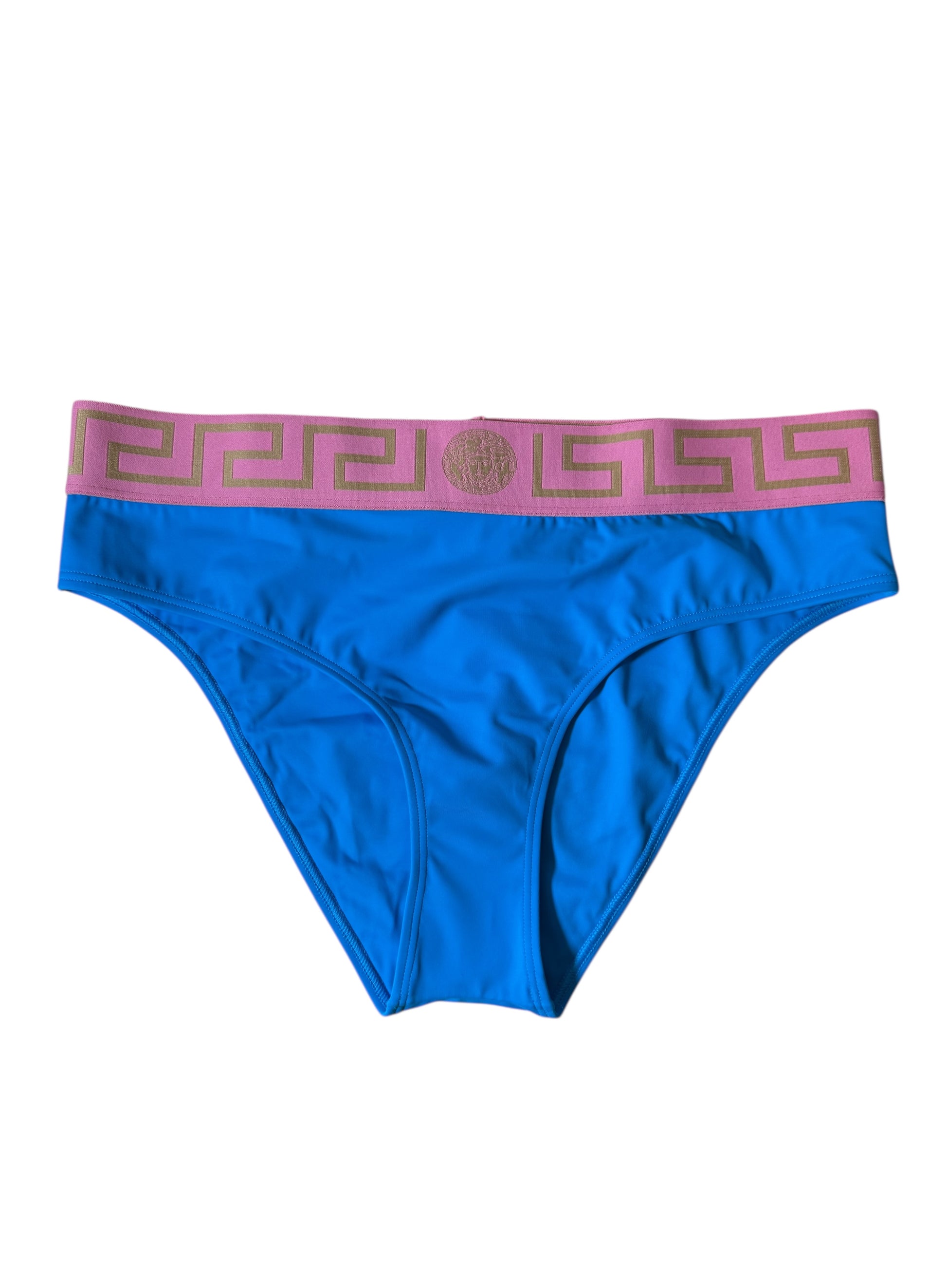 Slip bikini donna originale Versace, realizzato in Italia. Colore blu brillante con iconica fascia elastica Greca in rosa e oro e logo Medusa centrale. Capo nuovo con etichette, completo di tag NFC e QR code per la verifica dell’autenticità.