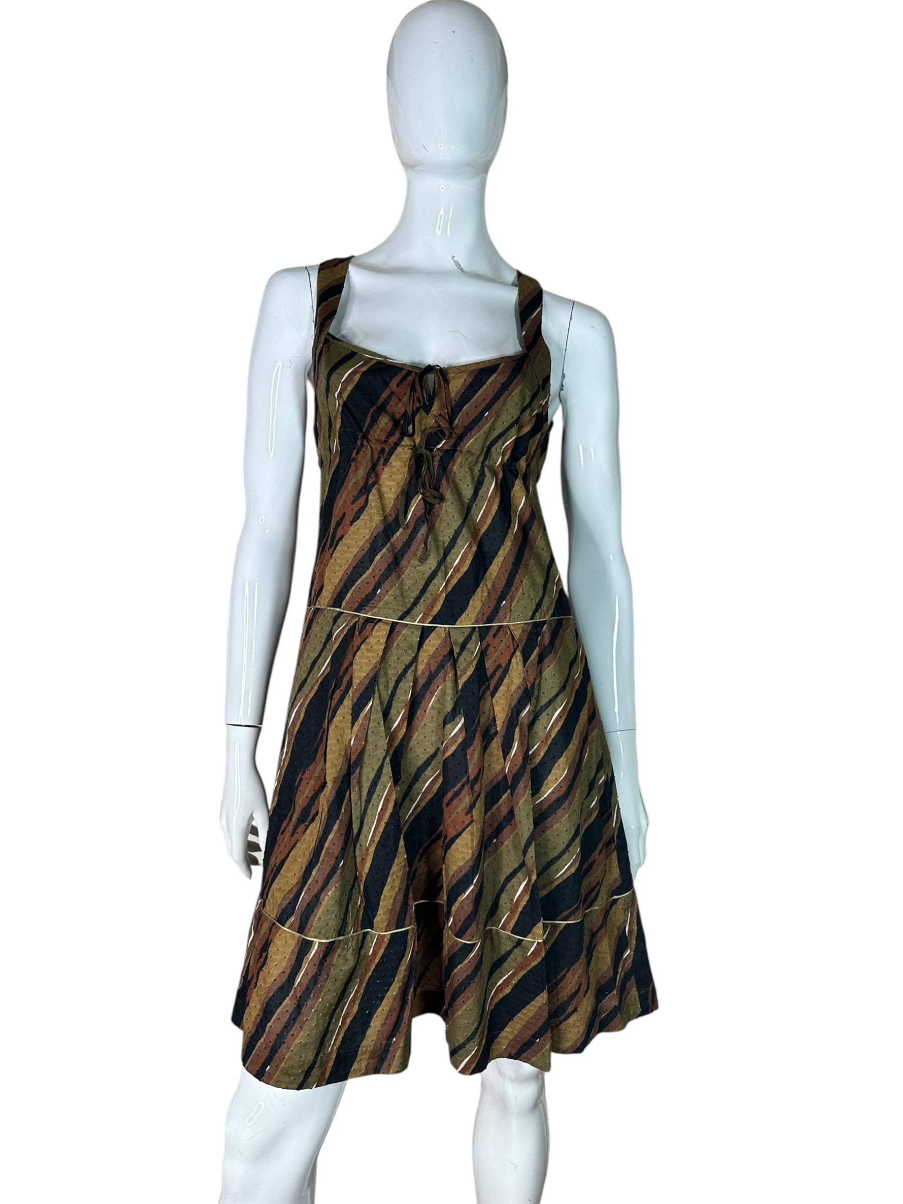 Abito vintage firmato Sportmax Code, realizzato in puro cotone leggero, con stampa diagonale a onde nei toni del verde oliva, nero, ruggine e avorio. Il tessuto presenta una lavorazione plumetis a piccoli pois in rilievo. Modello smanicato con scollo squadrato e chiusura con lacci frontali. Gonna a pieghe con profili leggermente a contrasto e fodera interna in cotone marrone. Chiusura con zip sul retro.