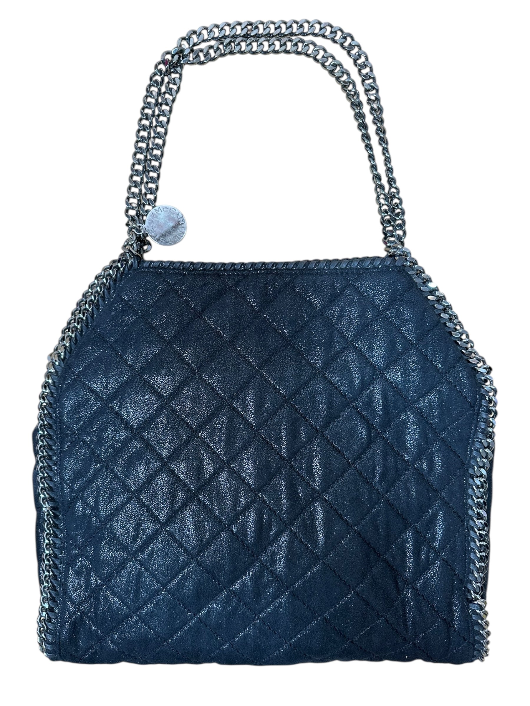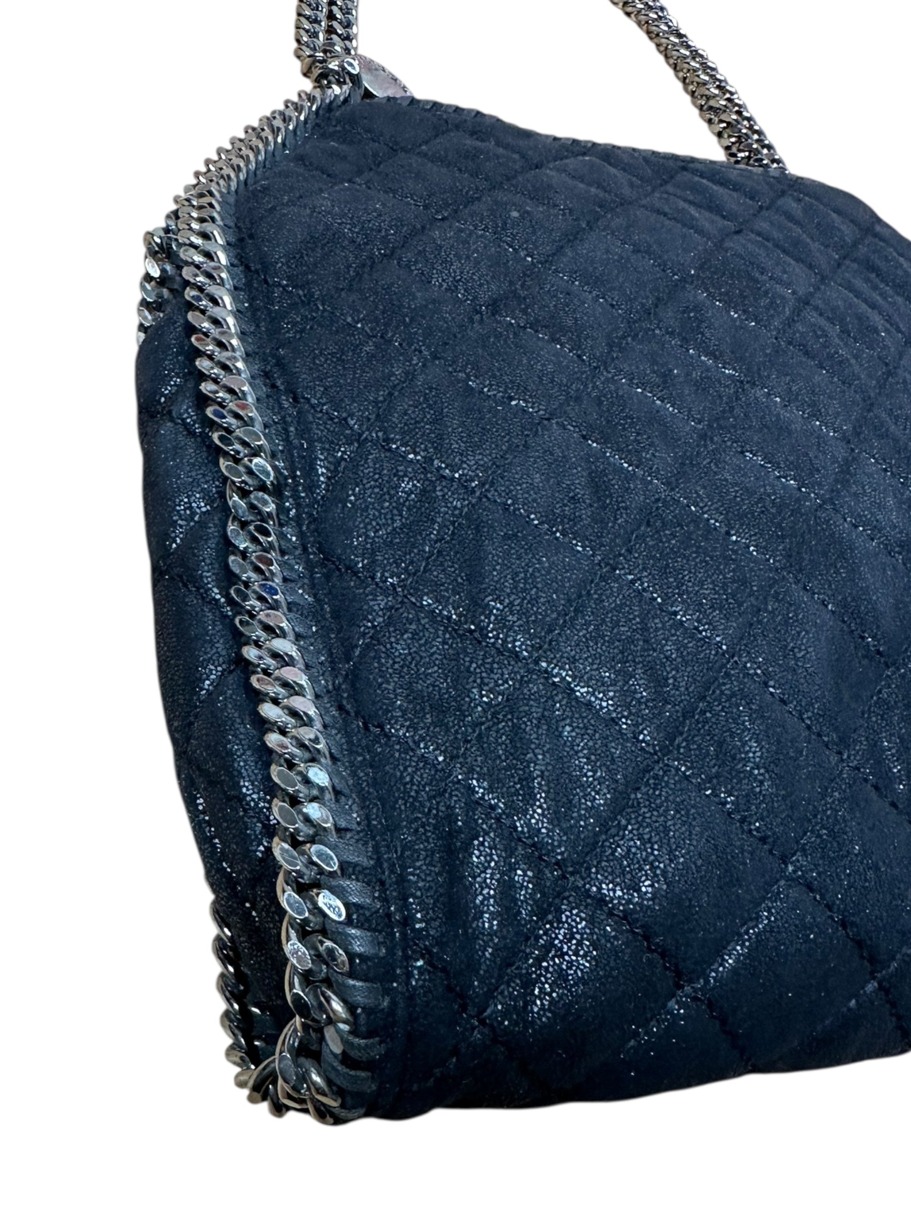 Iconica borsa Falabella realizzata in materiale effetto suede con motivo trapuntato, impreziosita dal caratteristico profilo e manico in catena color rutenio. Modello morbido e capiente, pratico da indossare a spalla o a mano. Interno foderato in tessuto jacquard logato, dotato di tasca con zip.