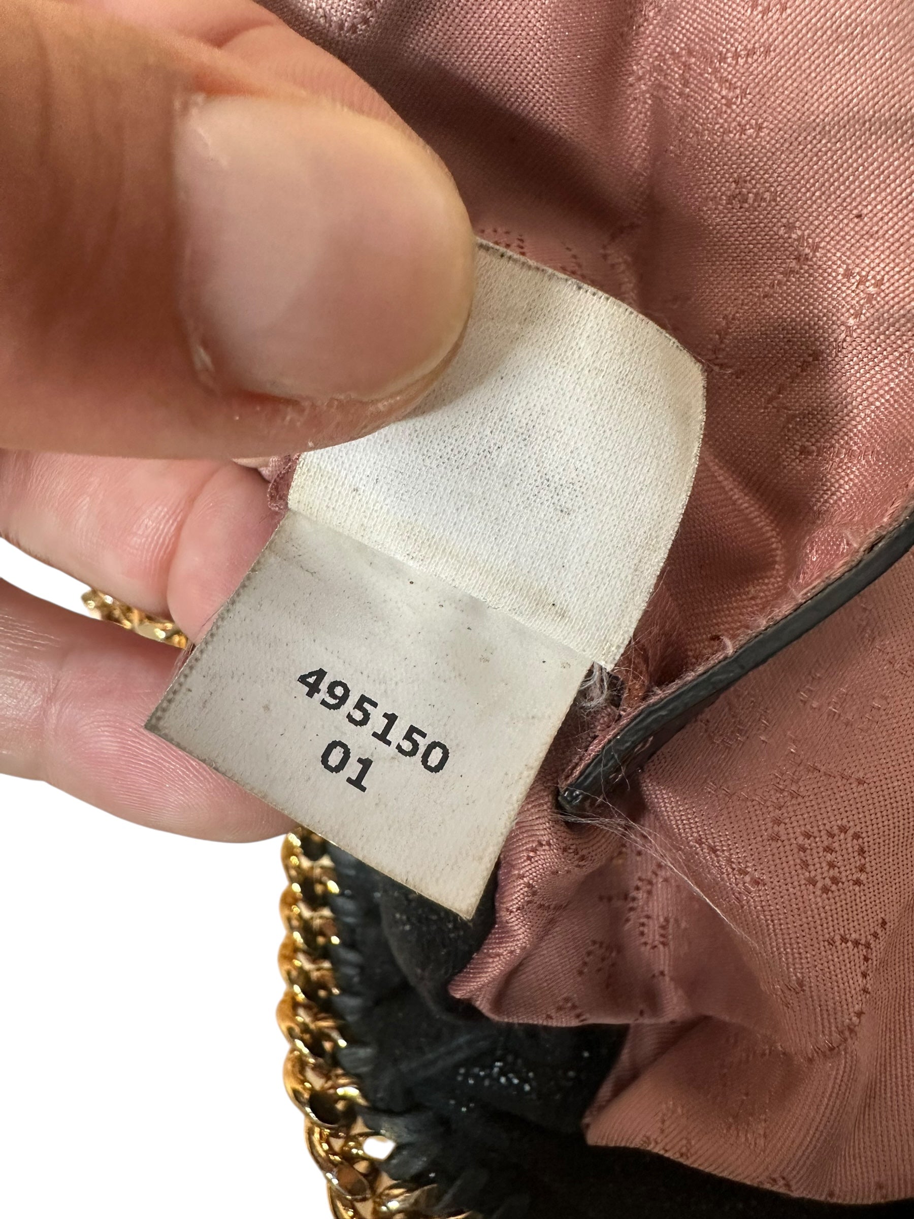 Iconica Falabella Mini di Stella McCartney realizzata in tessuto sintetico effetto pelle con finitura brillante nera e profili rifiniti da maxi catena dorata intrecciata. Il modello è dotato di doppio manico corto e tracolla a catena lunga, per una portabilità sia a mano che a spalla. Interno foderato in tessuto rosa cipria logato, con chiusura a bottone magnetico e targhetta rotonda metallica logata.